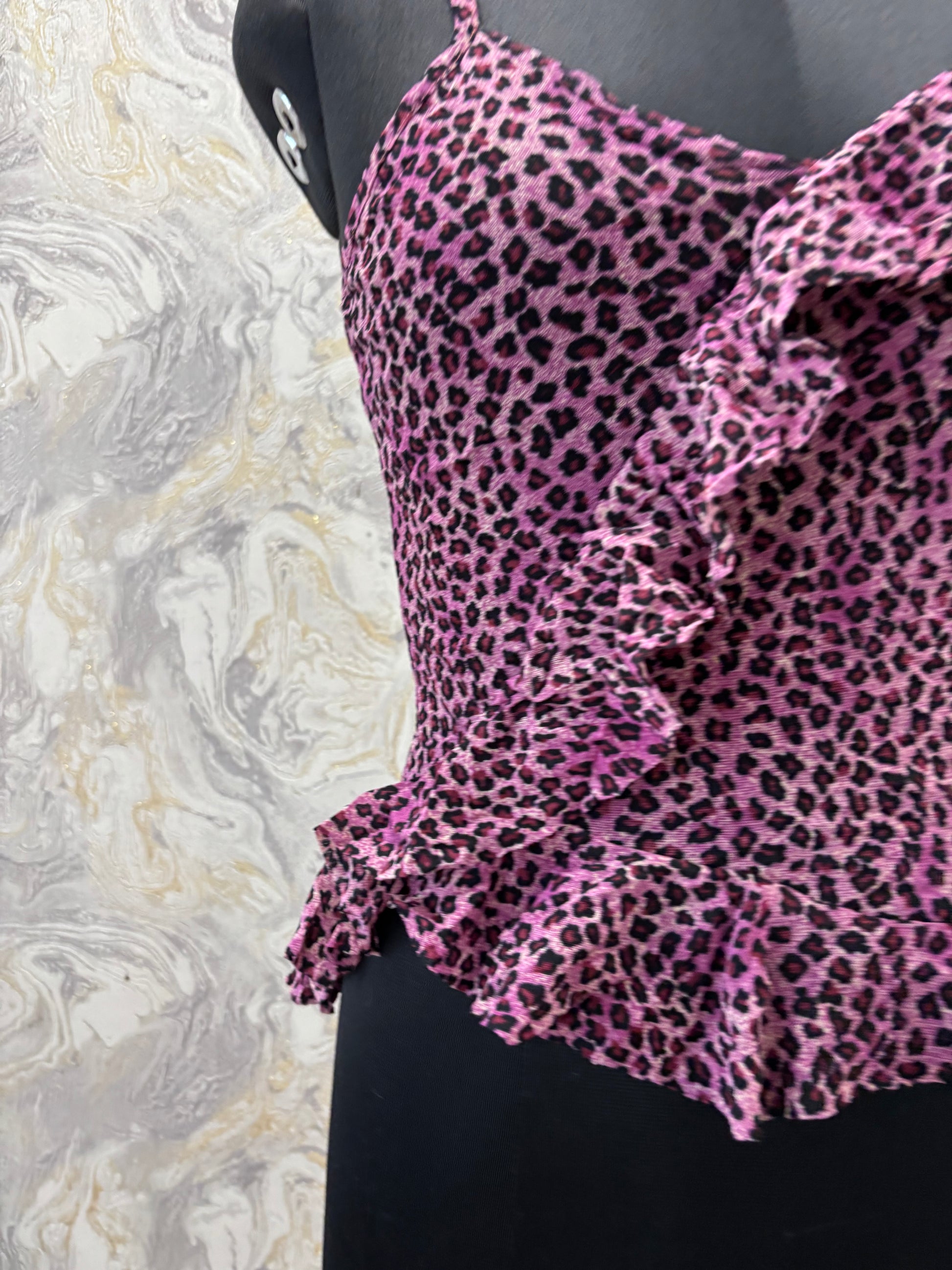 Mesh. Ruffle details. Bust 28 ( stretches upto 42) inches. Length 20 inches