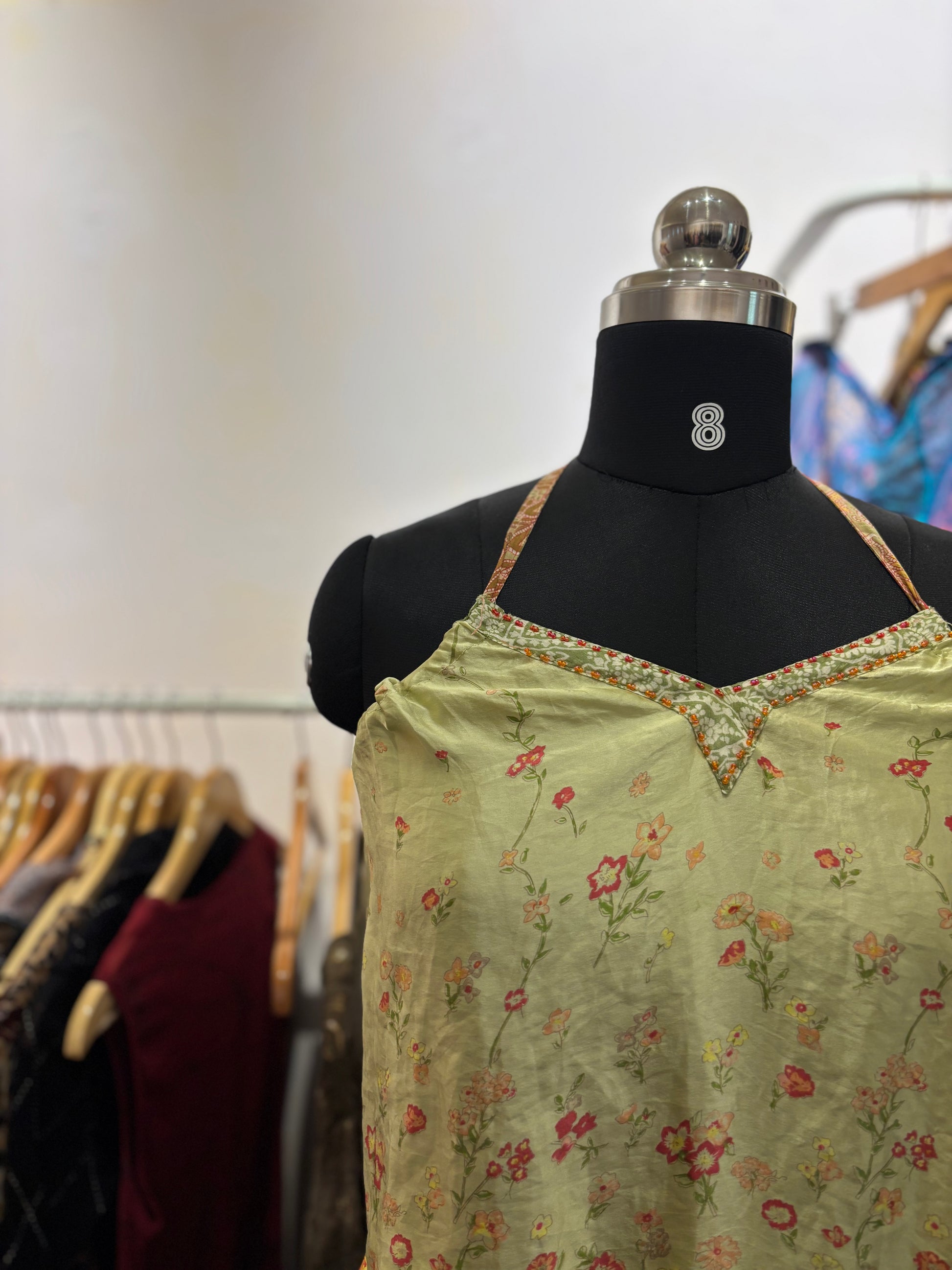 Bust 30 ( stretches upto 36) inches. Length 25 inches. Silk. Beas details on the neck line. Halter neck
