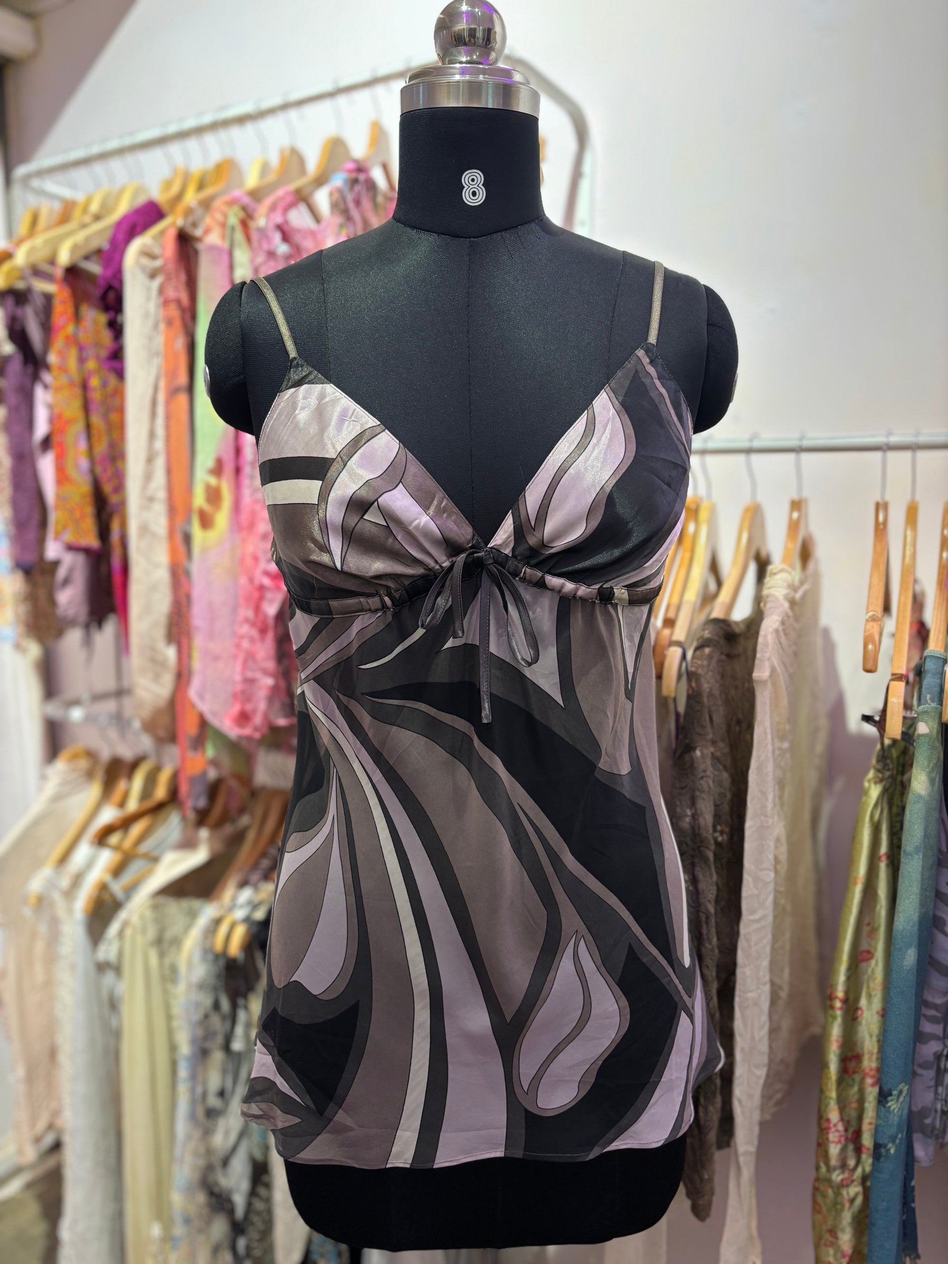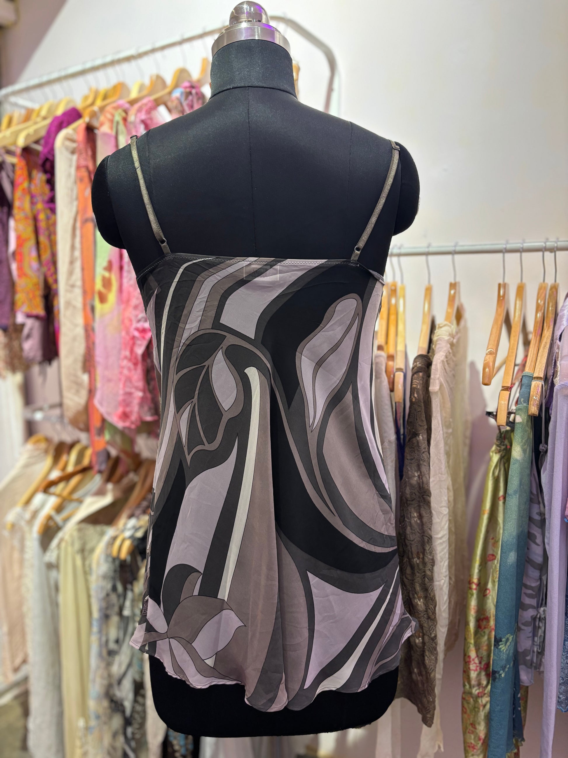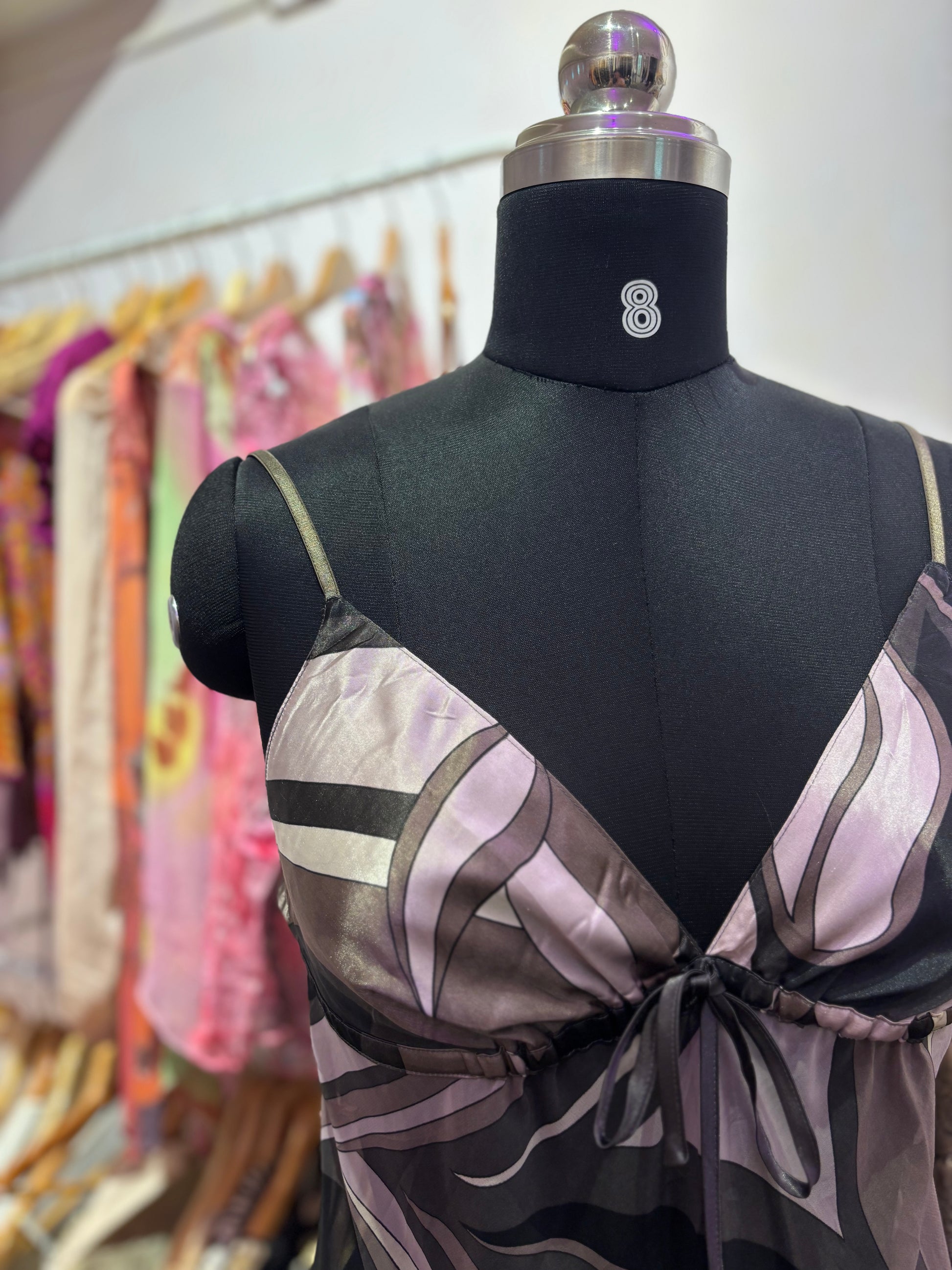 Bust 34 to 37 inches. Length 26 inches. Upper part satin. Lower is chiffon. Adjustable straps