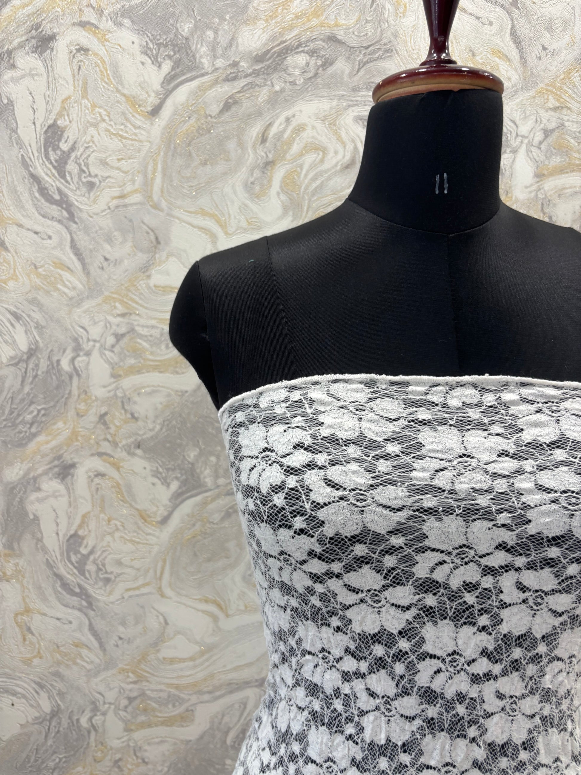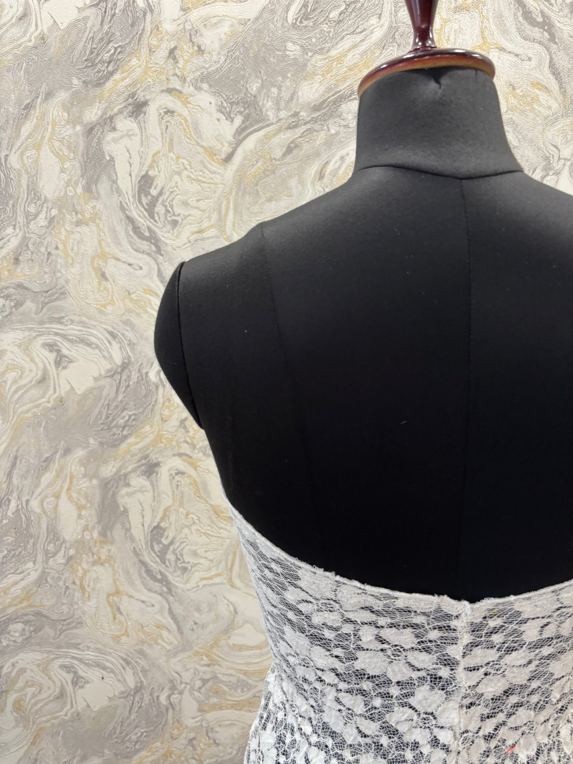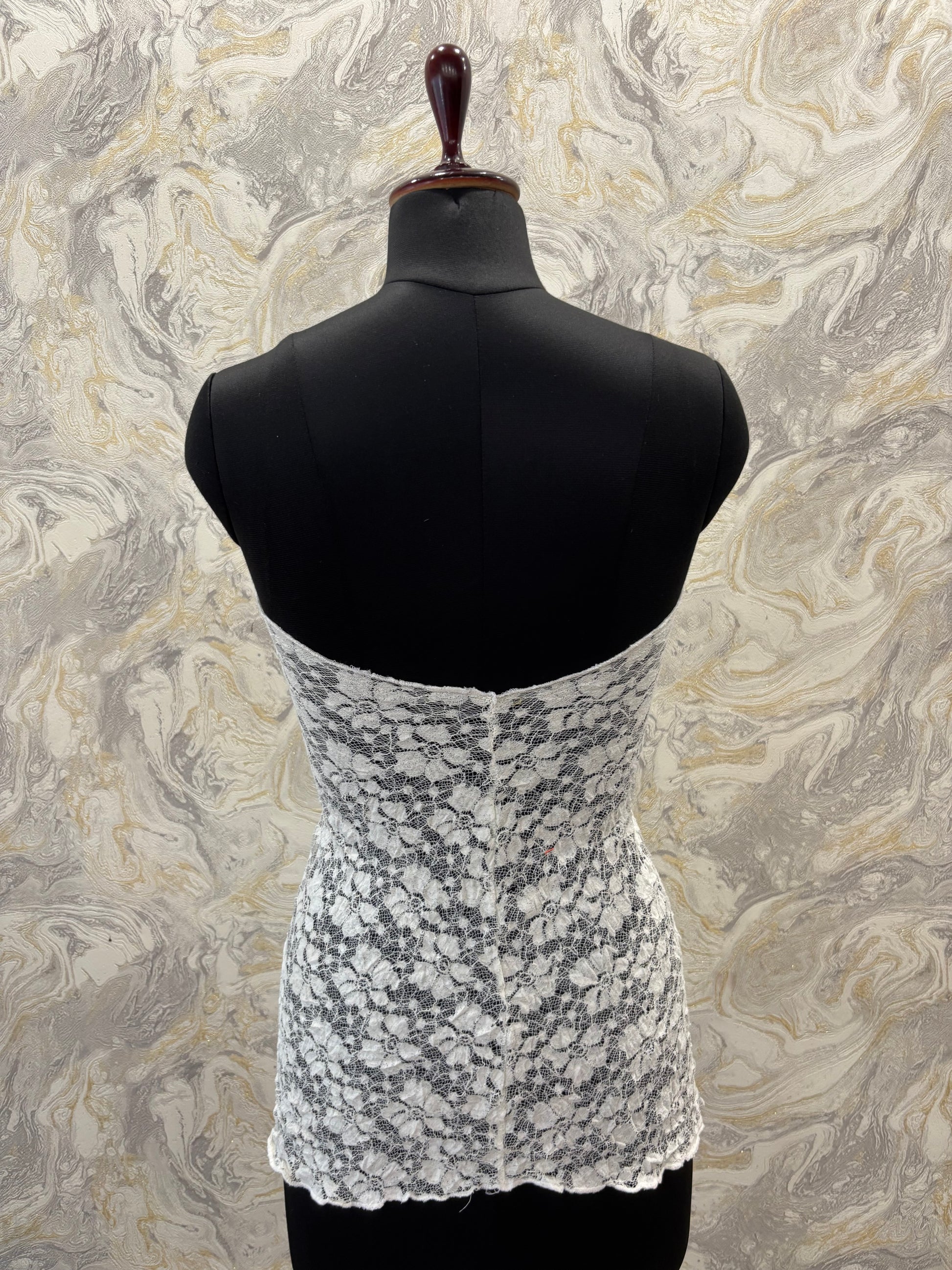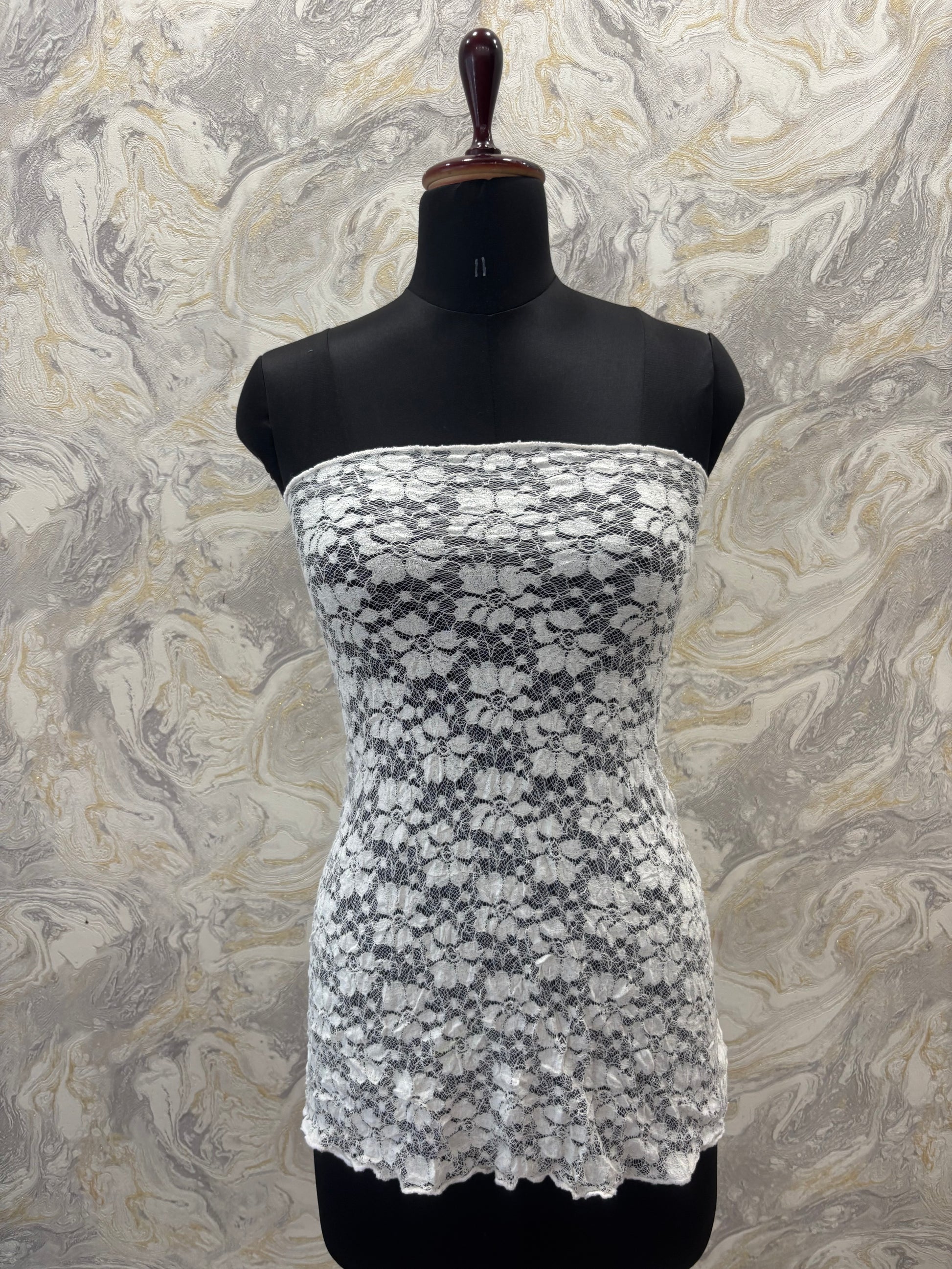 Bust 33 ( stretches upto 36) inches. Length 27 inches. Lacy. Sheer