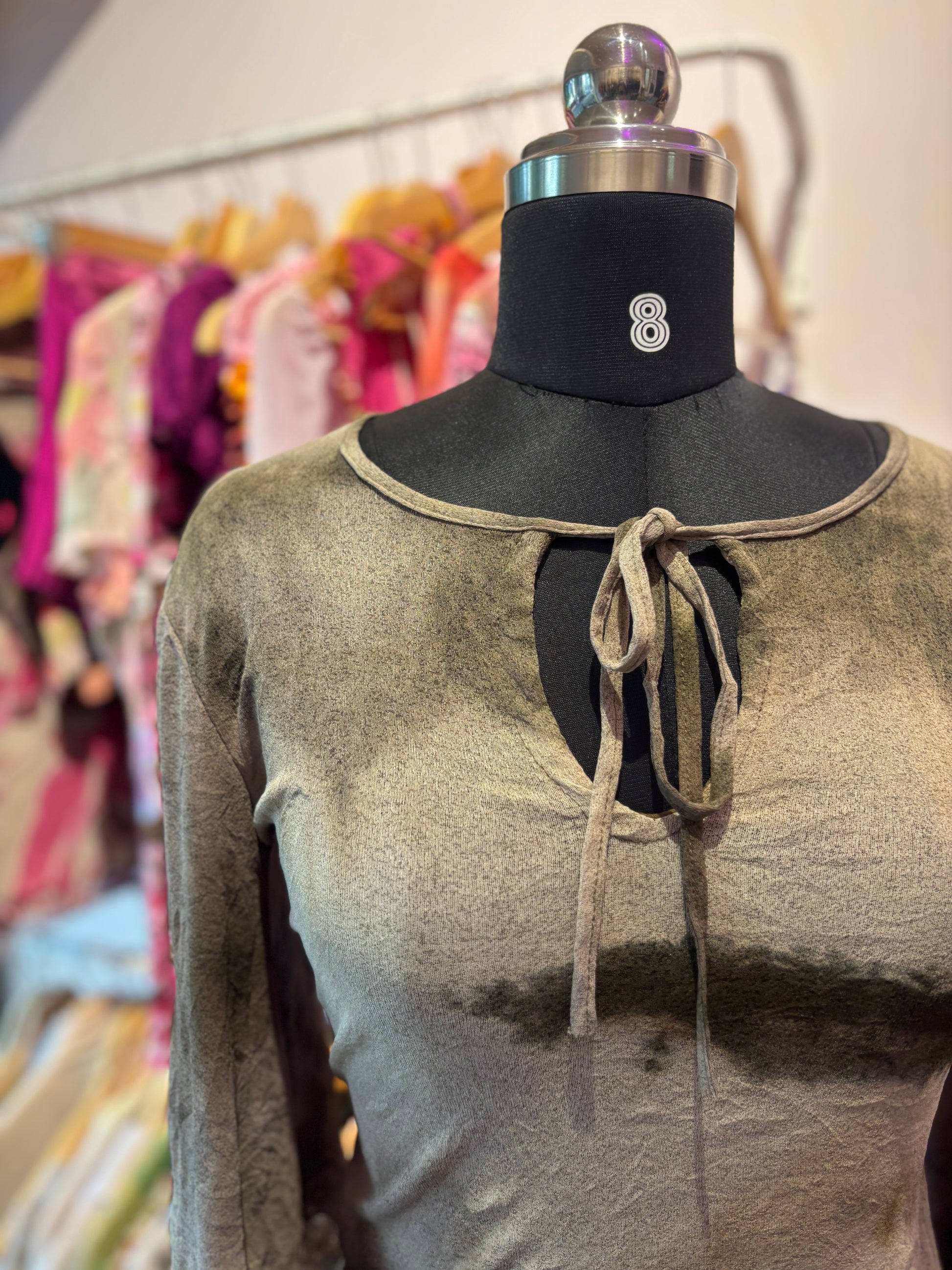Bust 32 ( stretches upto 38) inches. Length 22 inches. Mesh. Back strings