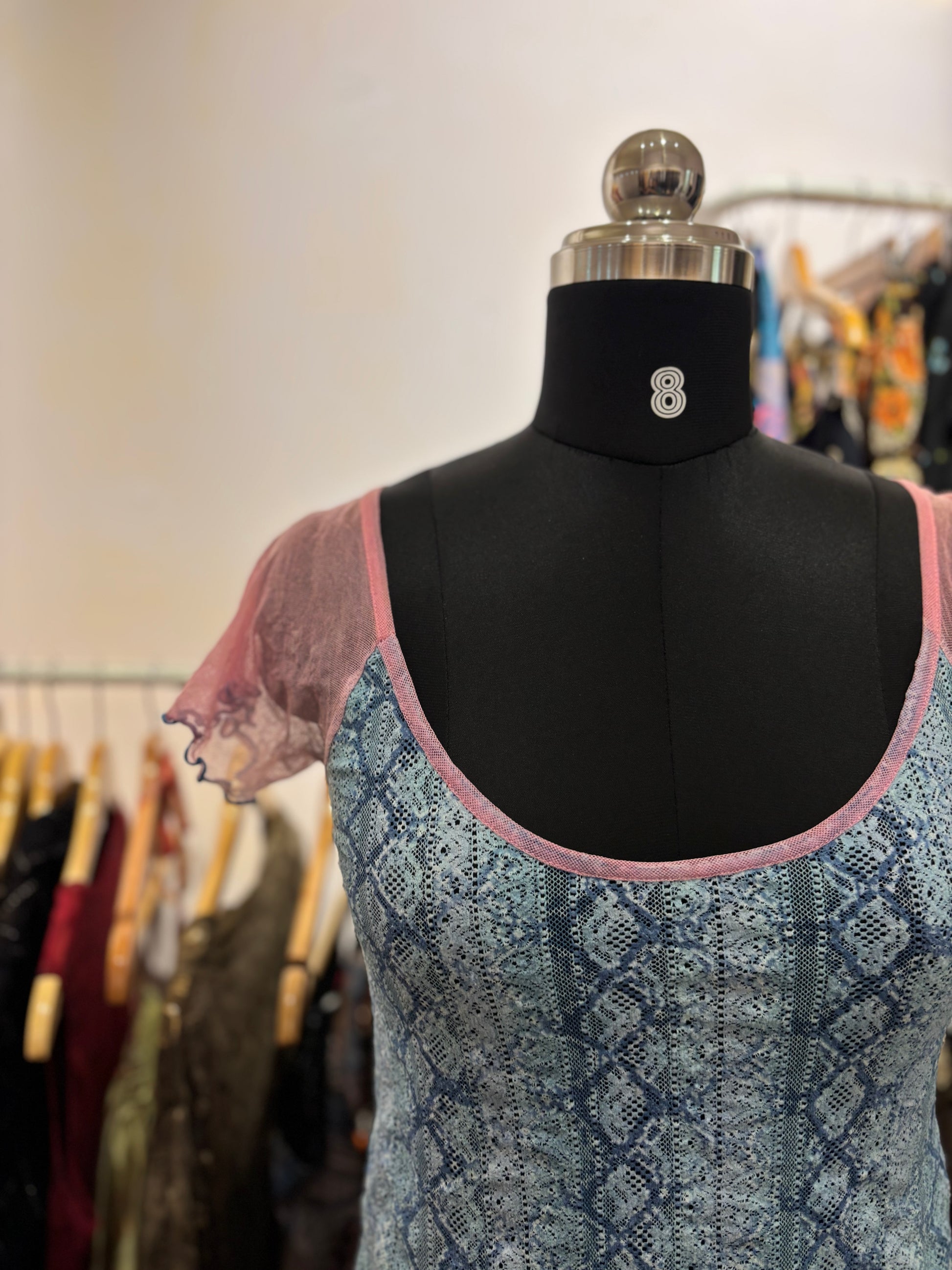 Bust 30 ( stretches upto 40) inches. Length 21 inches. Lace. Sleeves are mesh
