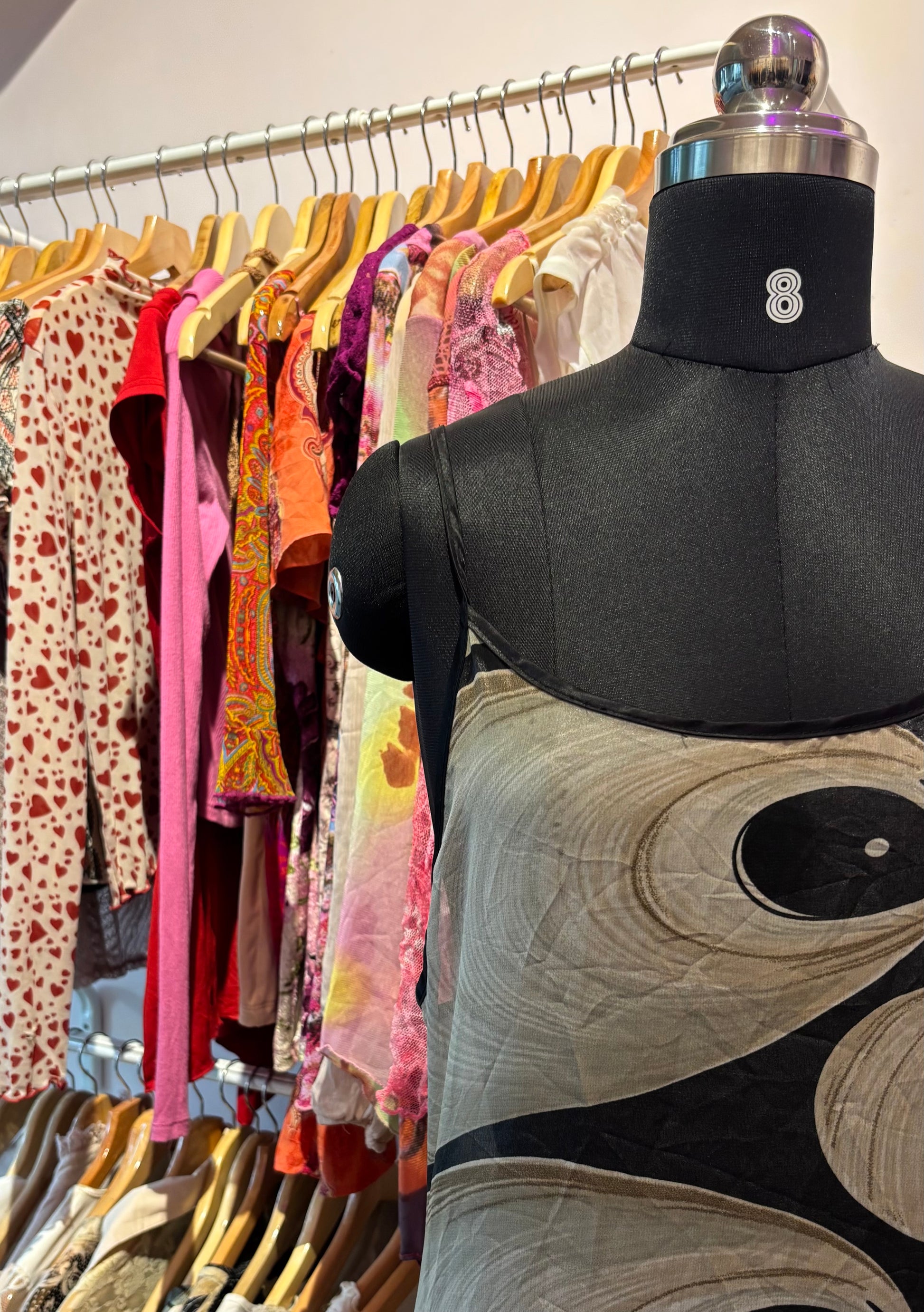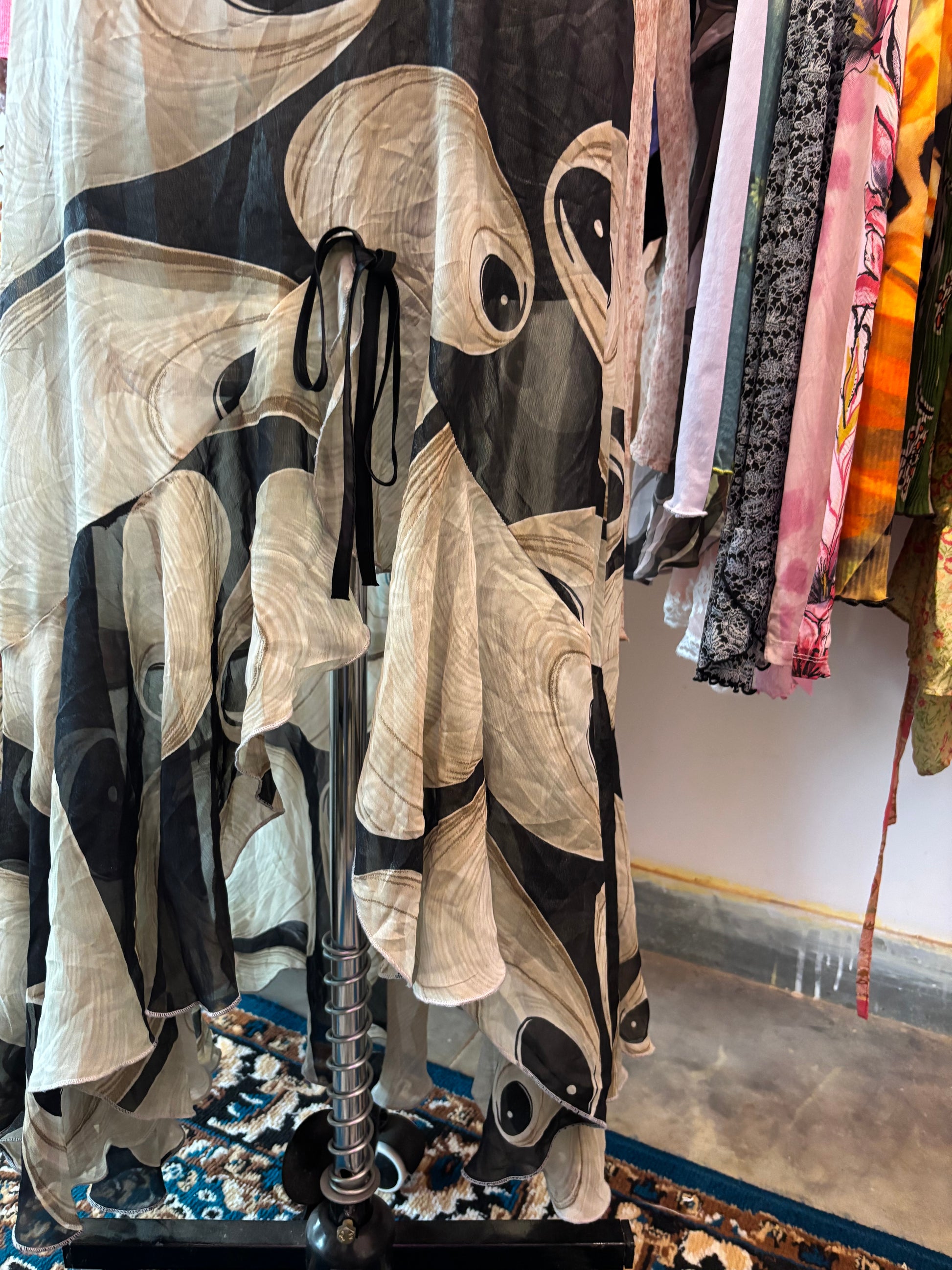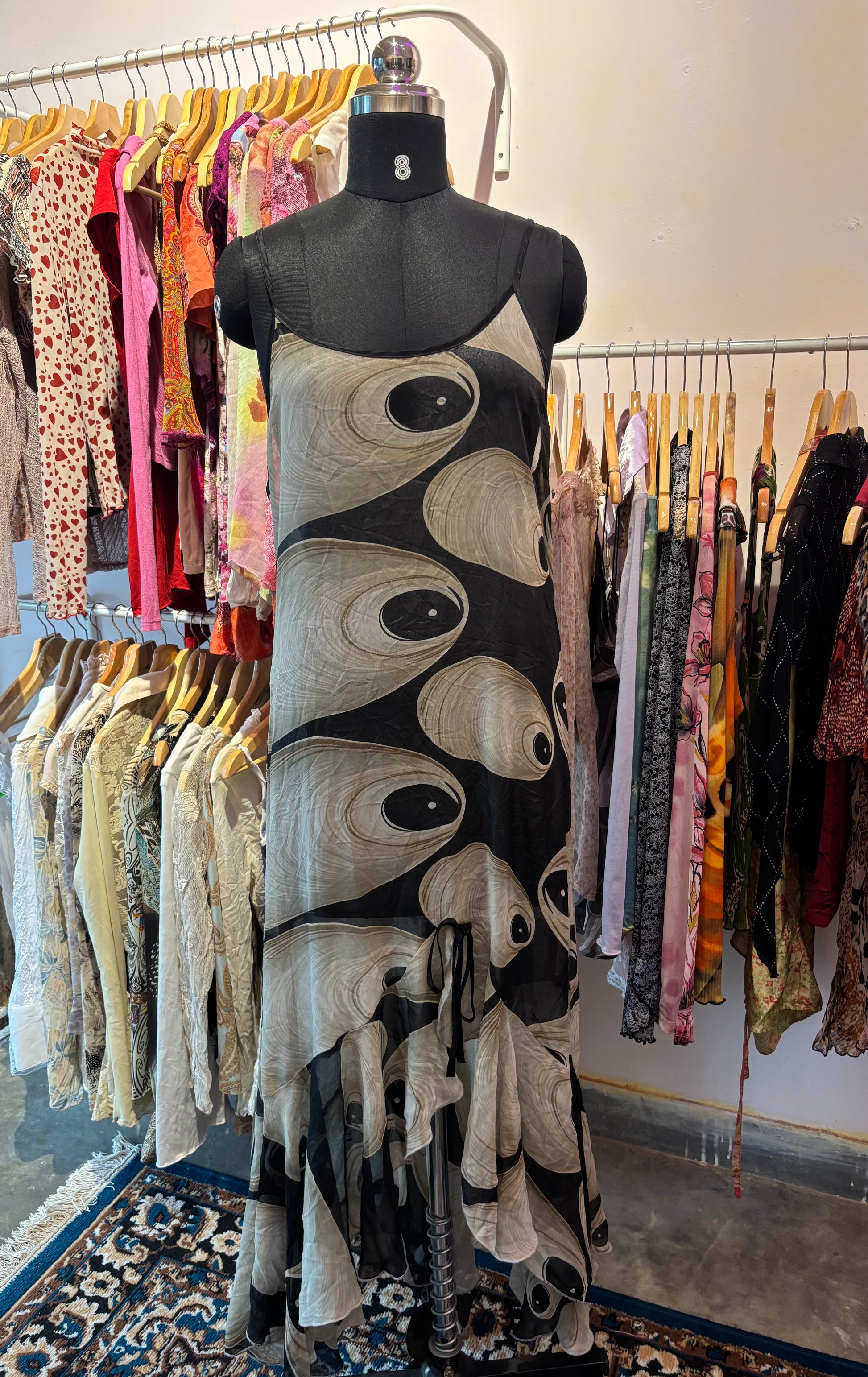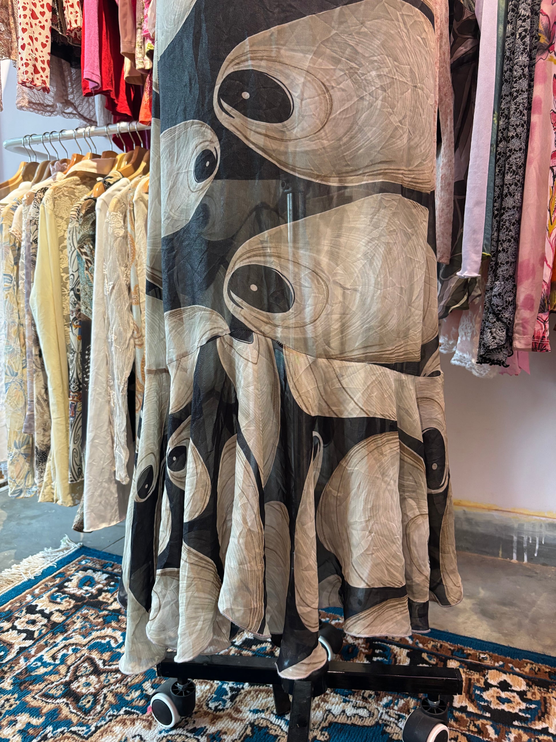 Bust fits 38/40 inches. Length 56 inches. Satin georgette