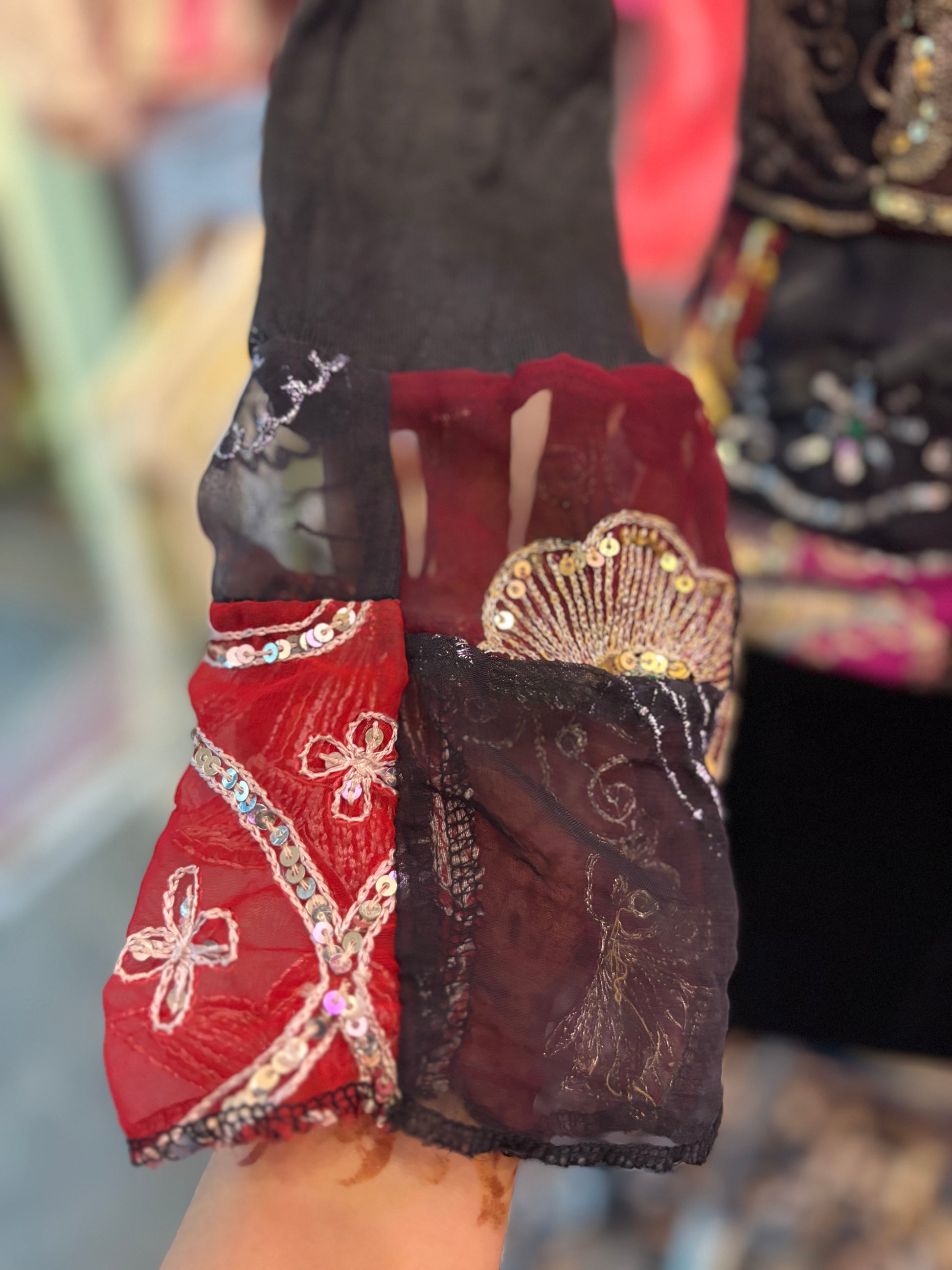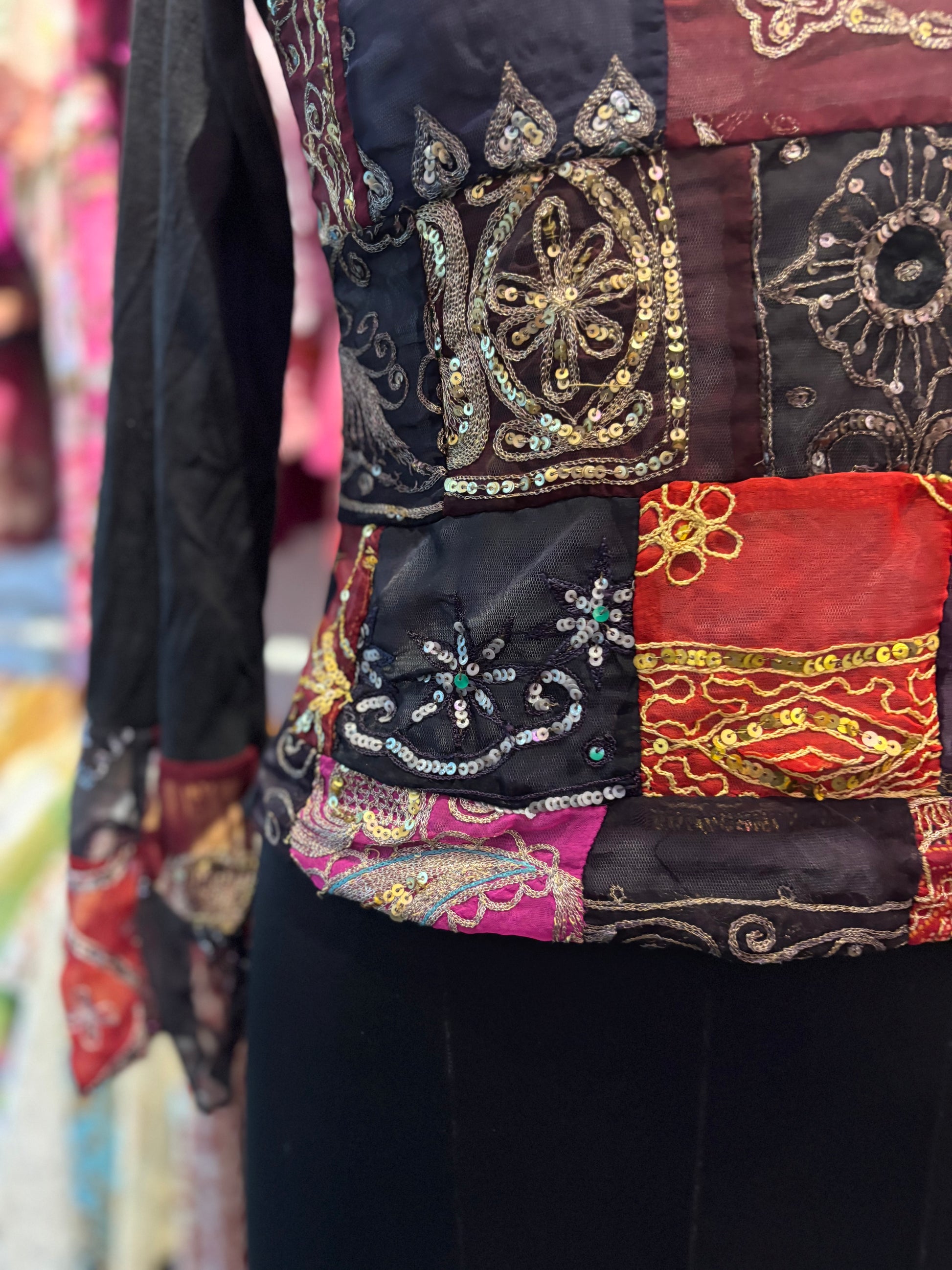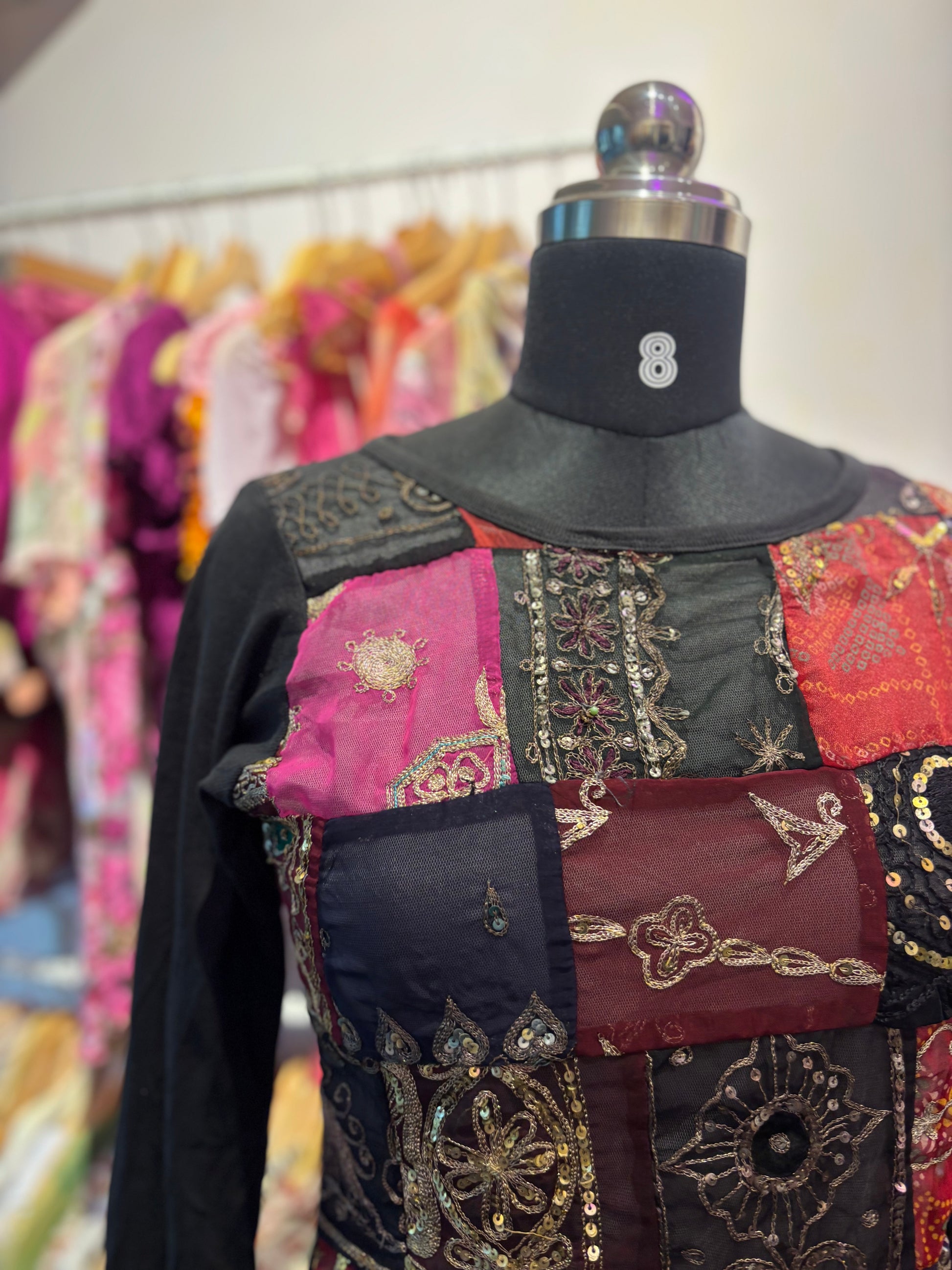Bust 30 ( stretches upto 36) inches. Length 21 inches. Knit. Patched georgette.