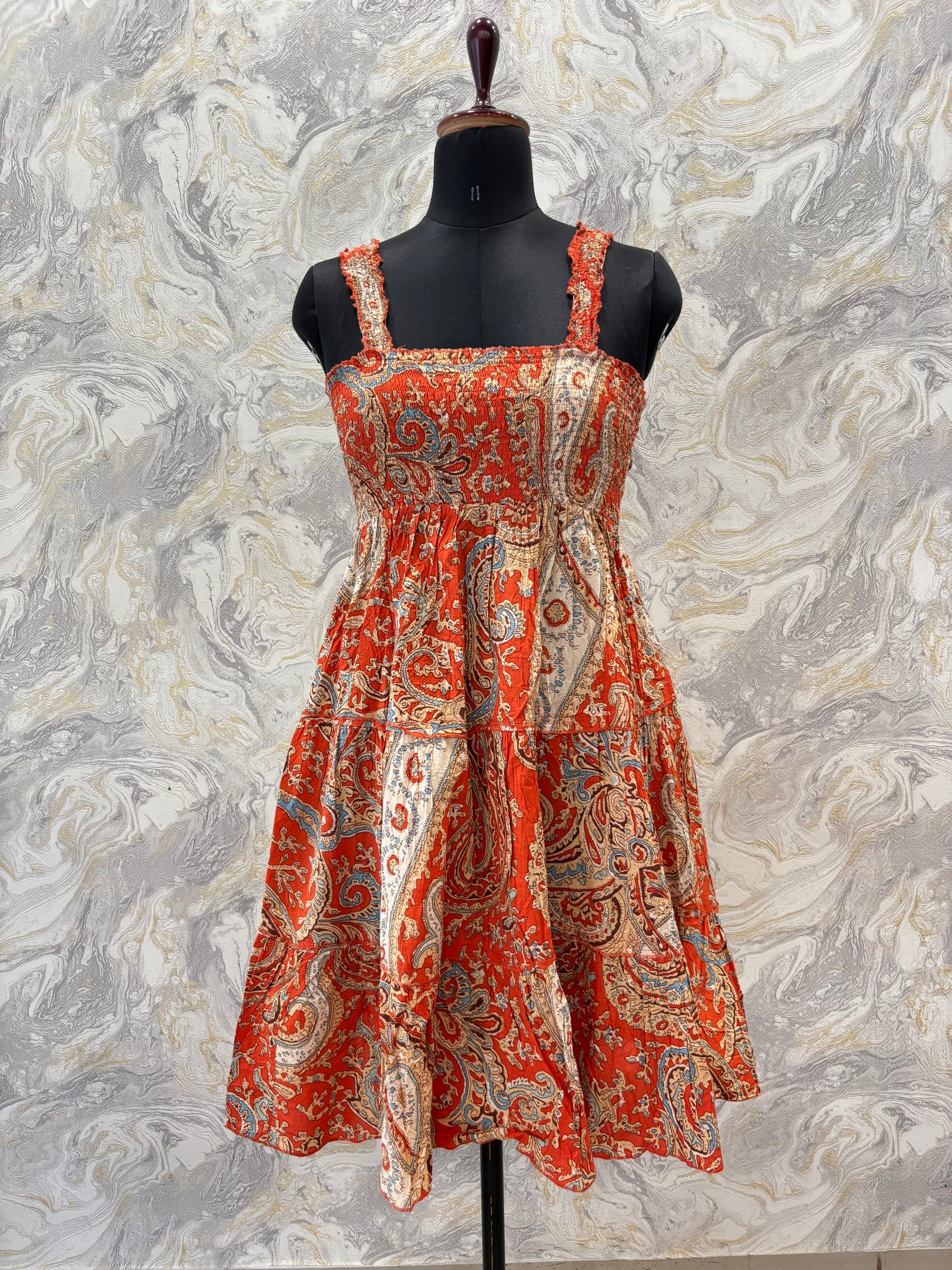 Bust 26 ( stretches upto 36) inches. Length 36 inches. Smocked. Cotton