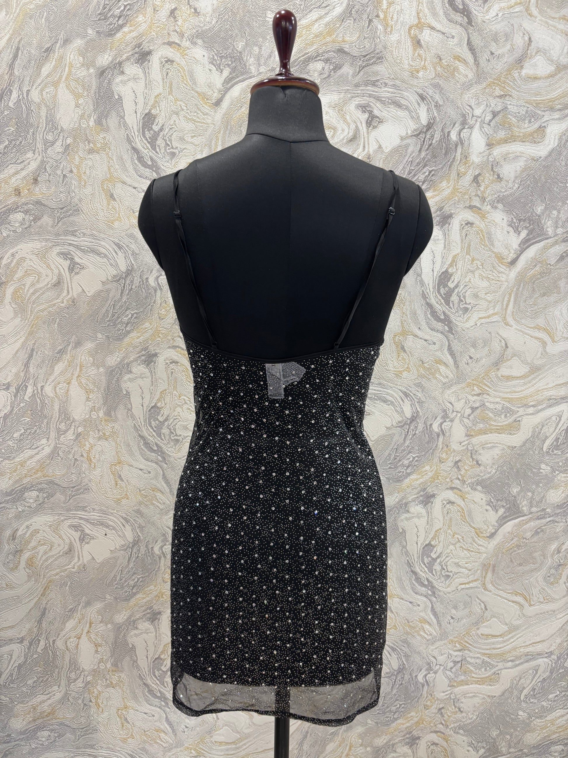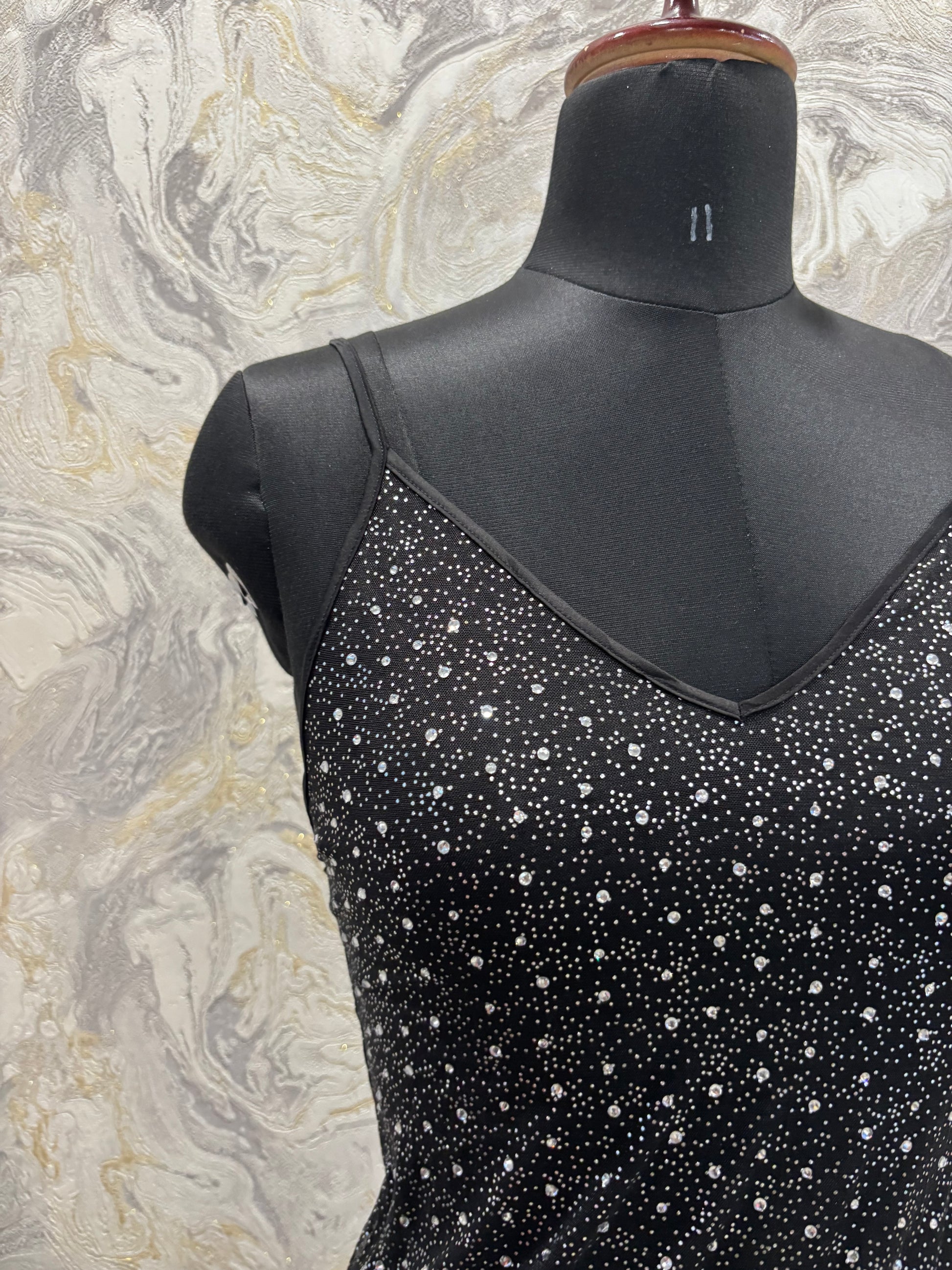 Bust 30 ( stretches upto 36) inches. Length 33 inches. Mesh. Sheer. Adjustable straps