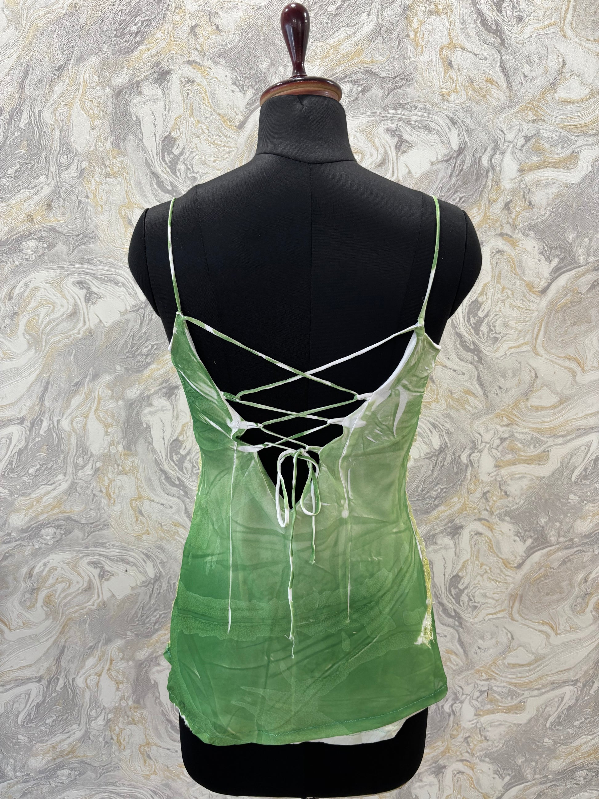Bust 30 ( stretches upto 38) inches. Length 27 inches. Chiffon plus lace.lined. Bead work. Criss cross back