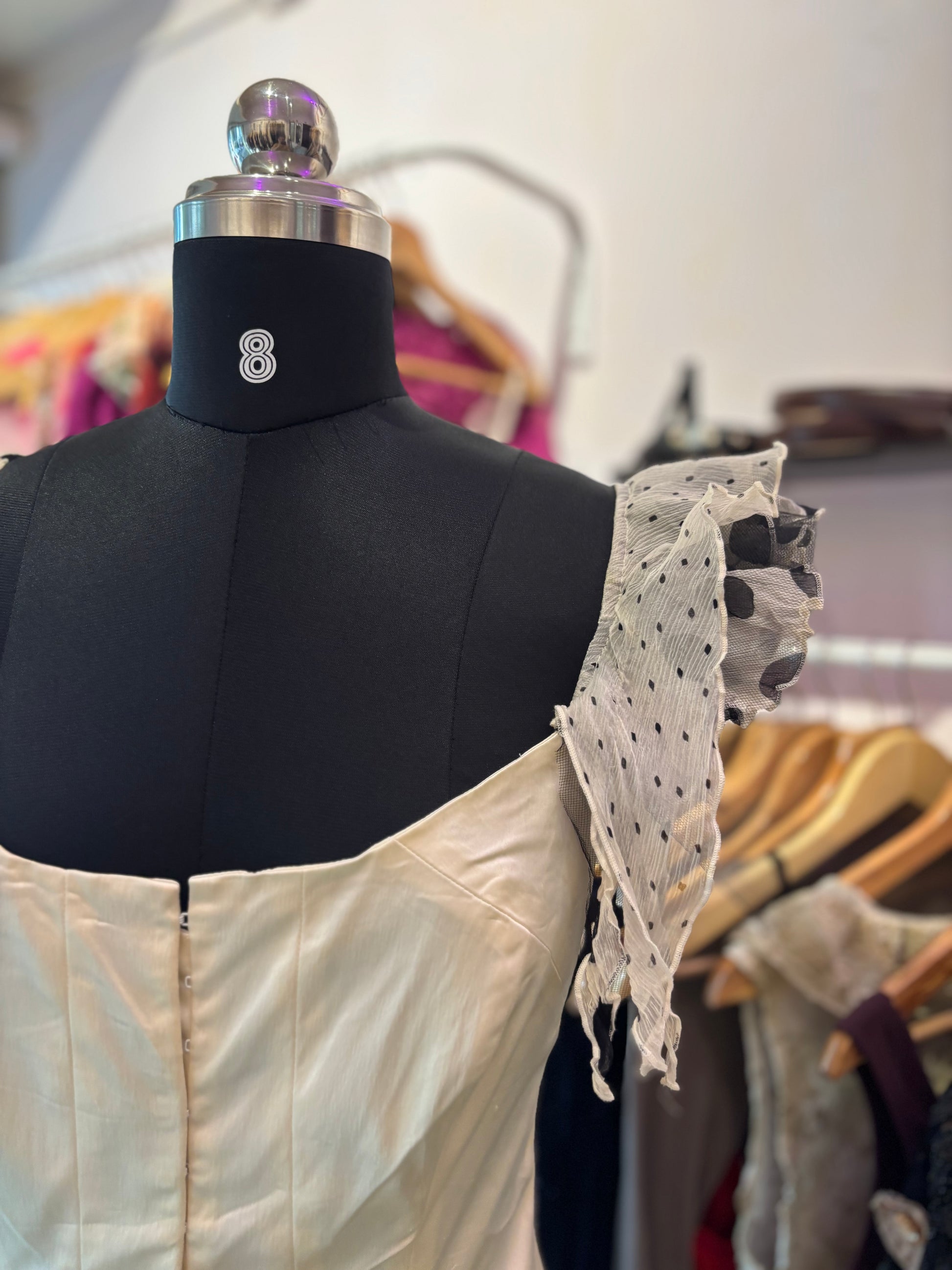Bust 34 ( stretches upto 38) inches. Length 18.5 inches. Satin. Chiffon polka sleeves. Princess cut. Hooks in front