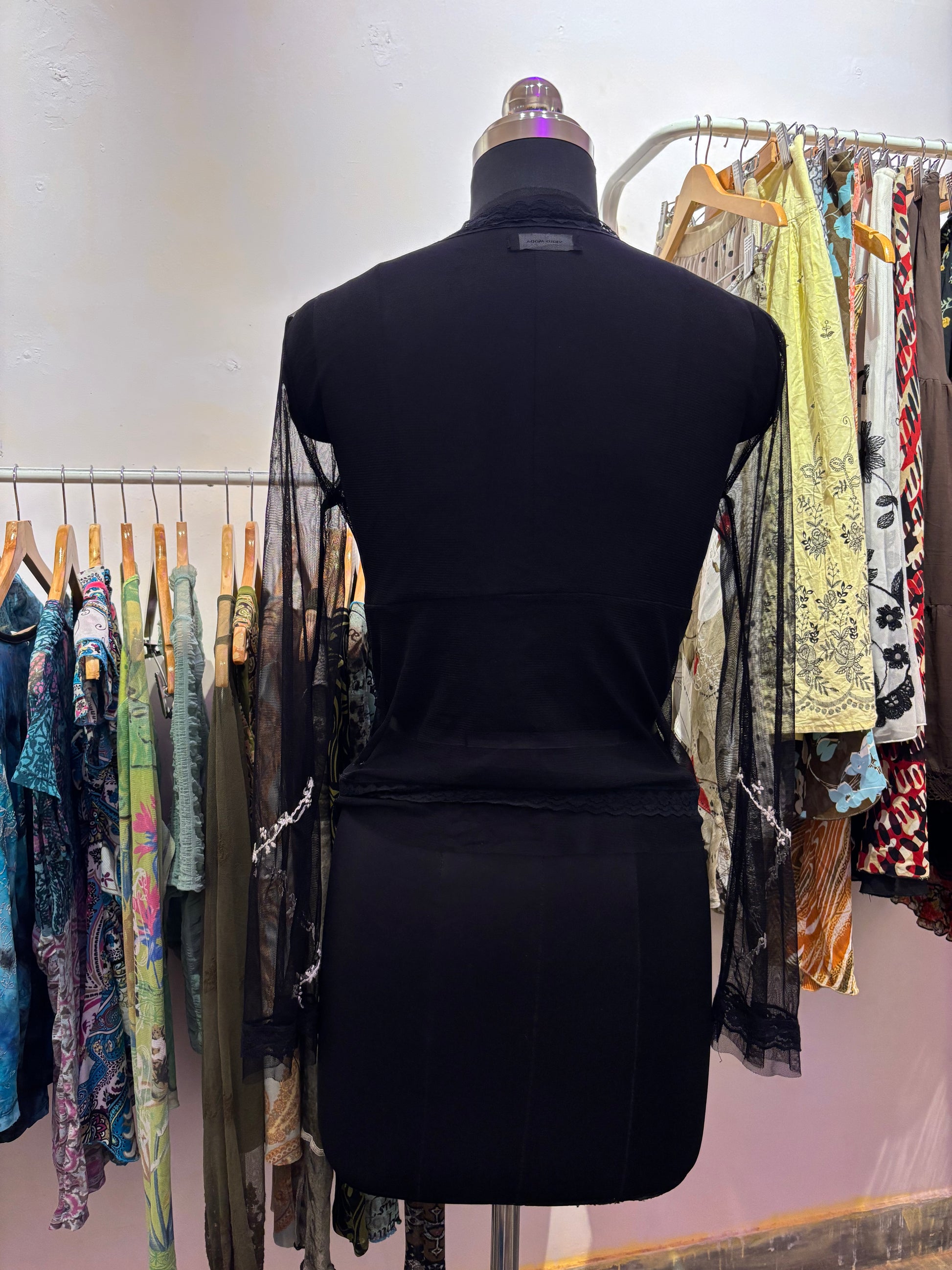 Bust free size. Fits upto 40 inches. Length 22 inches. Mesh. Thread embroidery