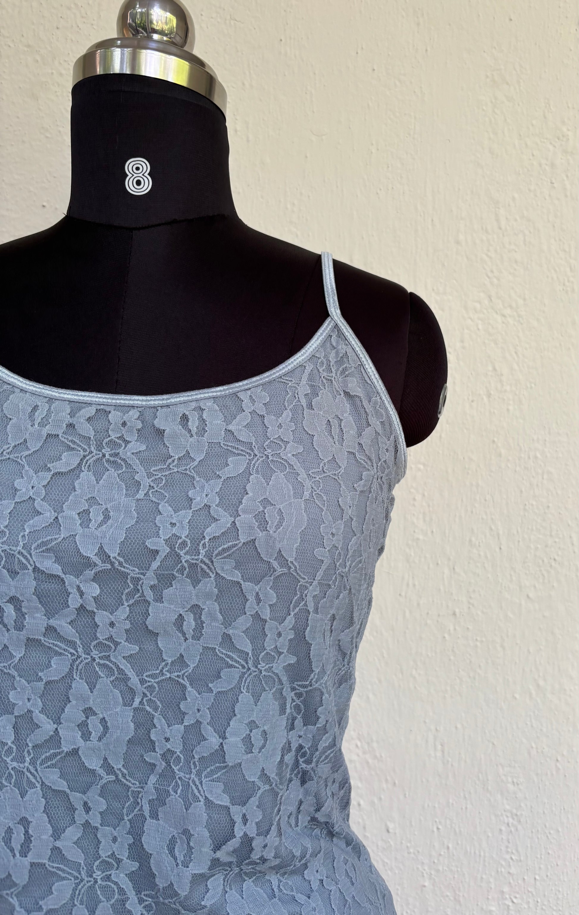 Bust 38 ( stretches upto 44) inches. Length 24 inches. Lacy. Lined. Adjustable straps