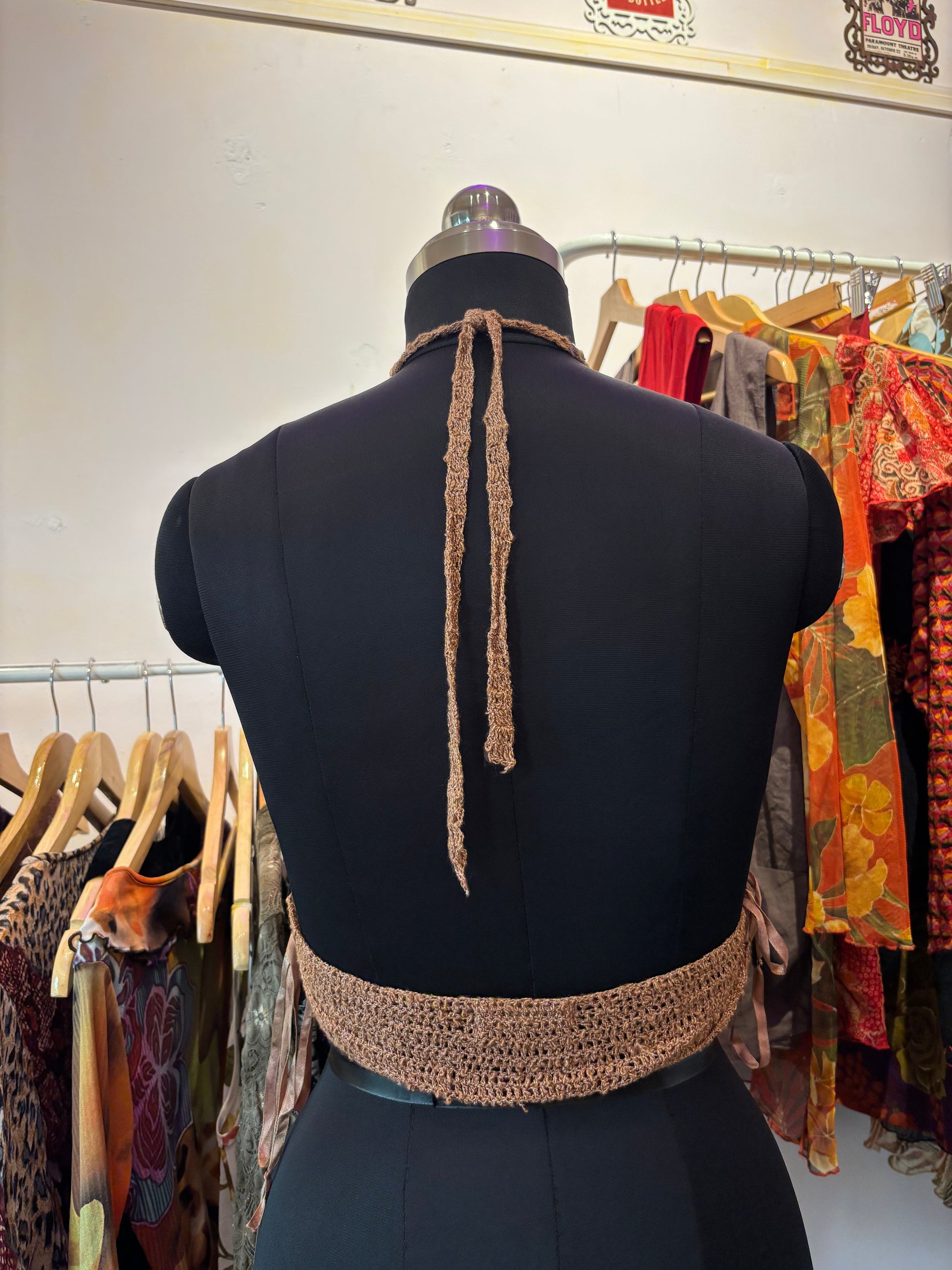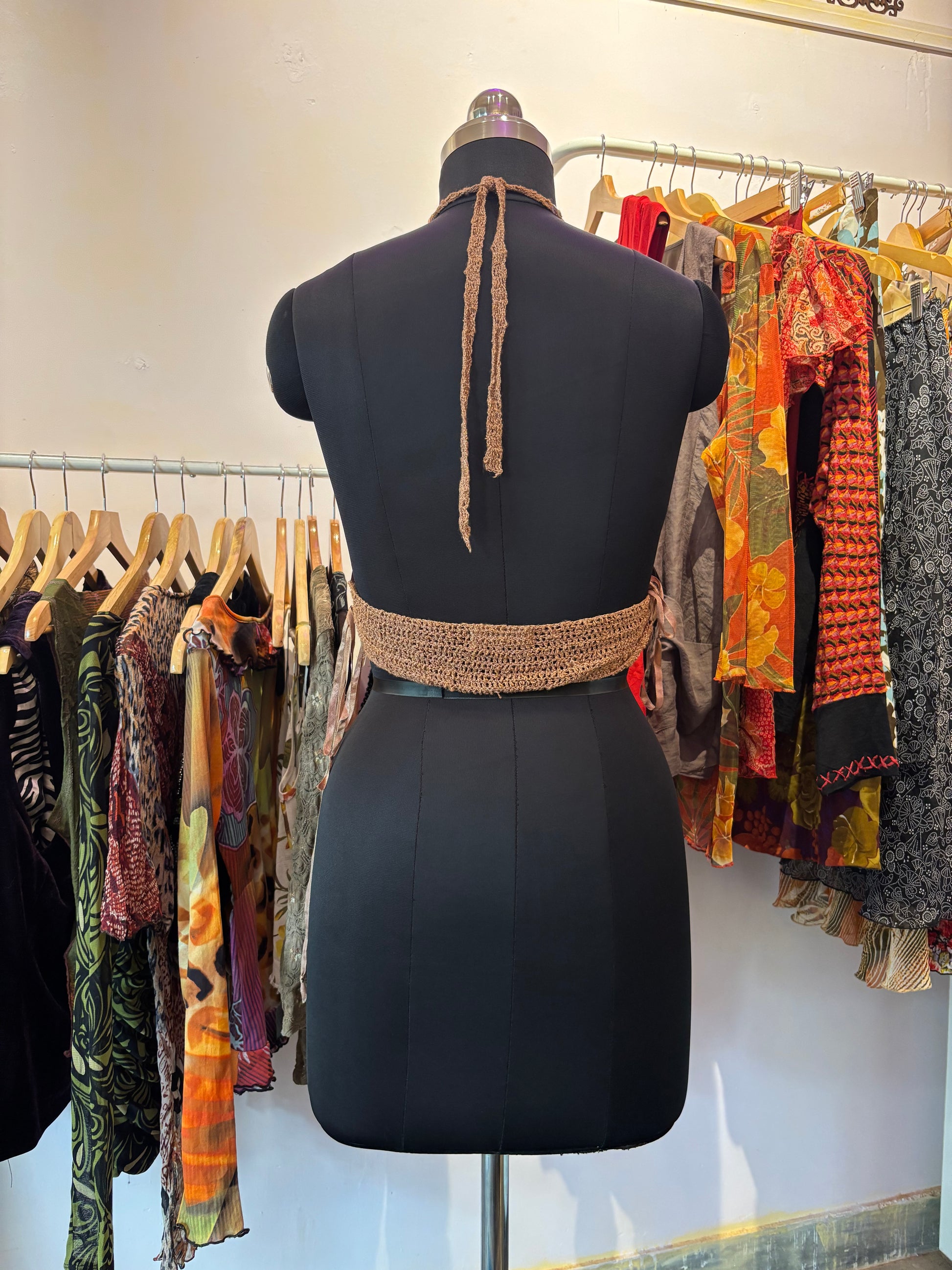 Bust fits from 28 to 38 inches. Length 20 inches. Halter neck. Has side strings to adjust the waist
