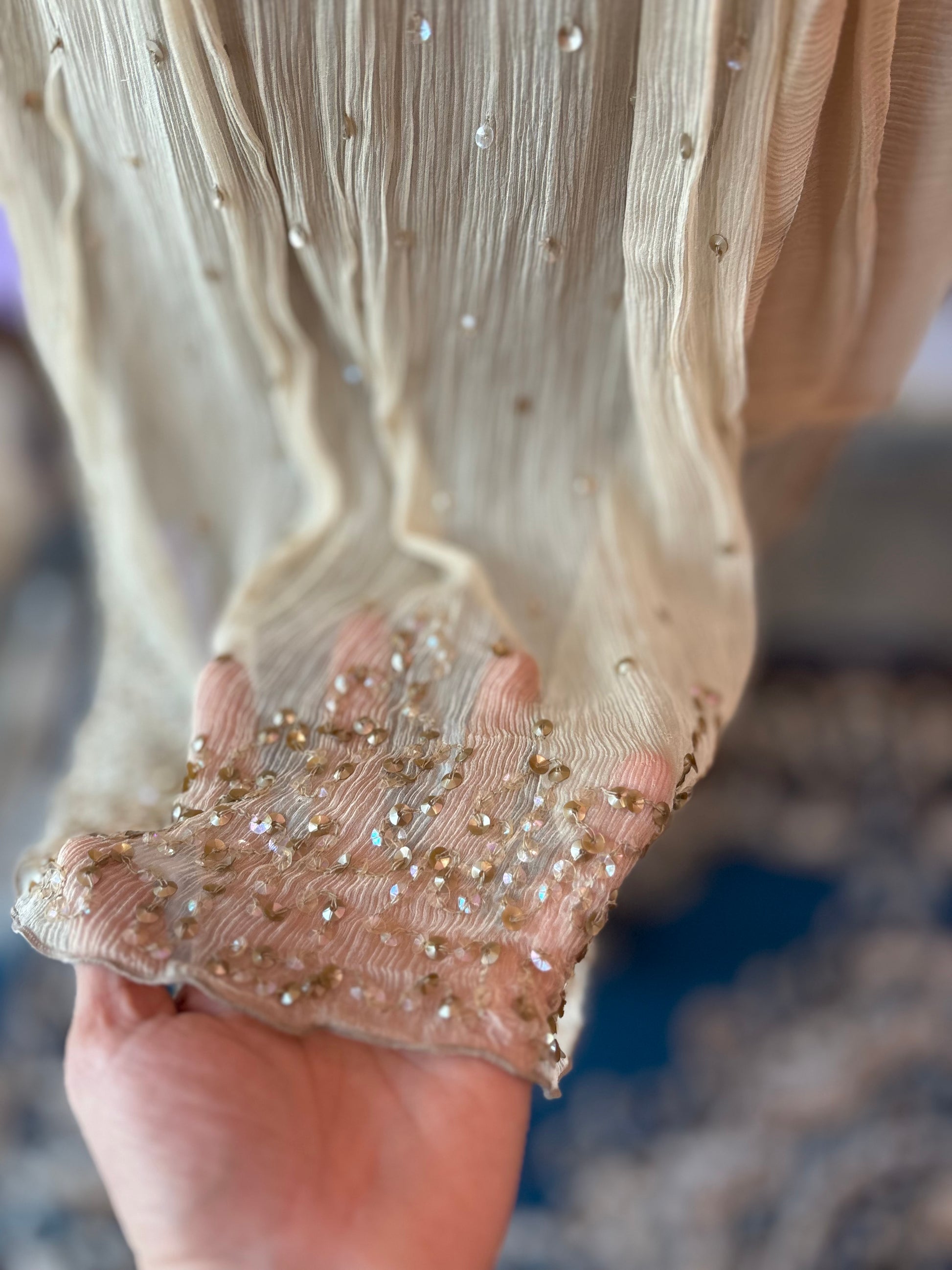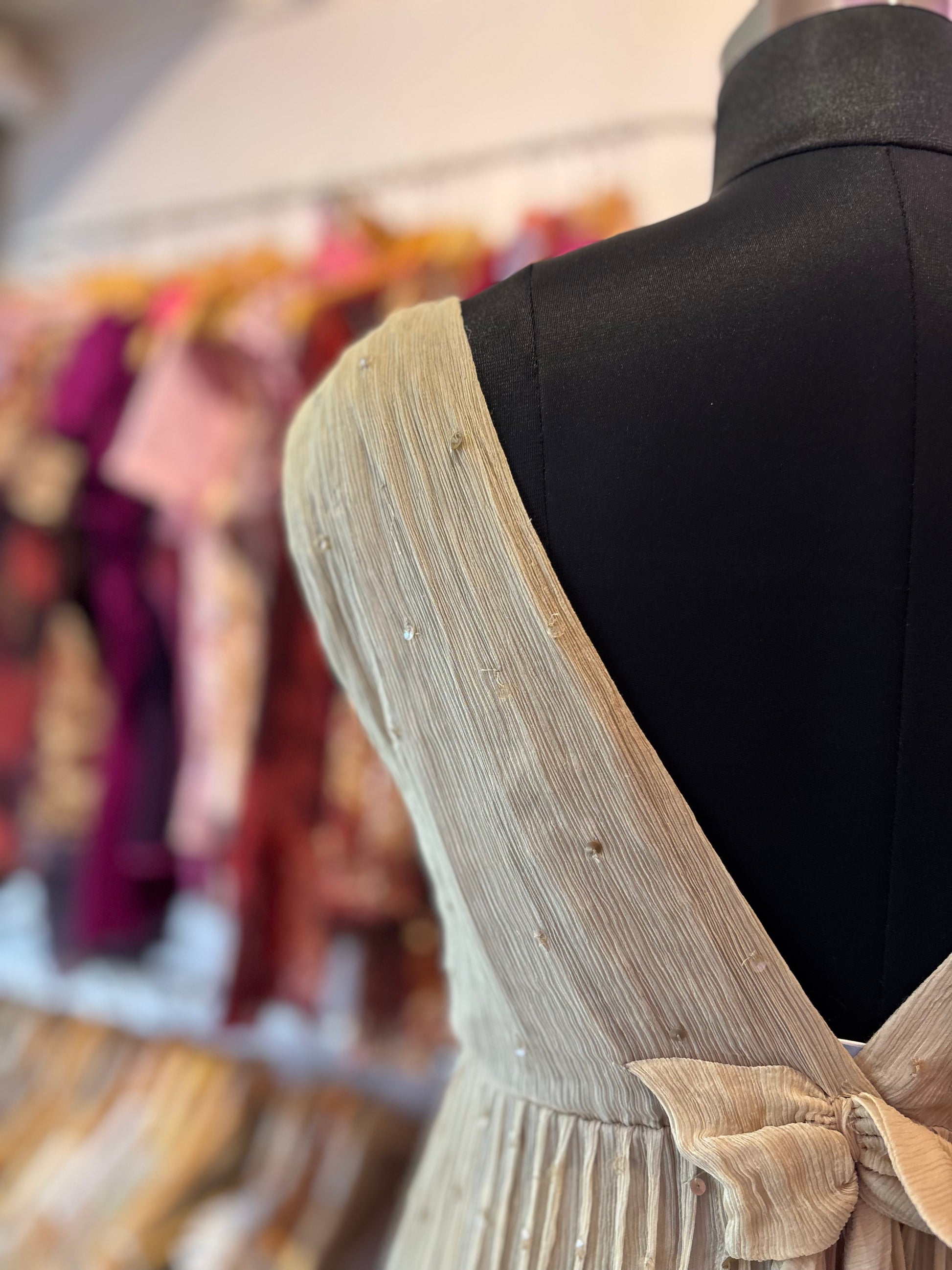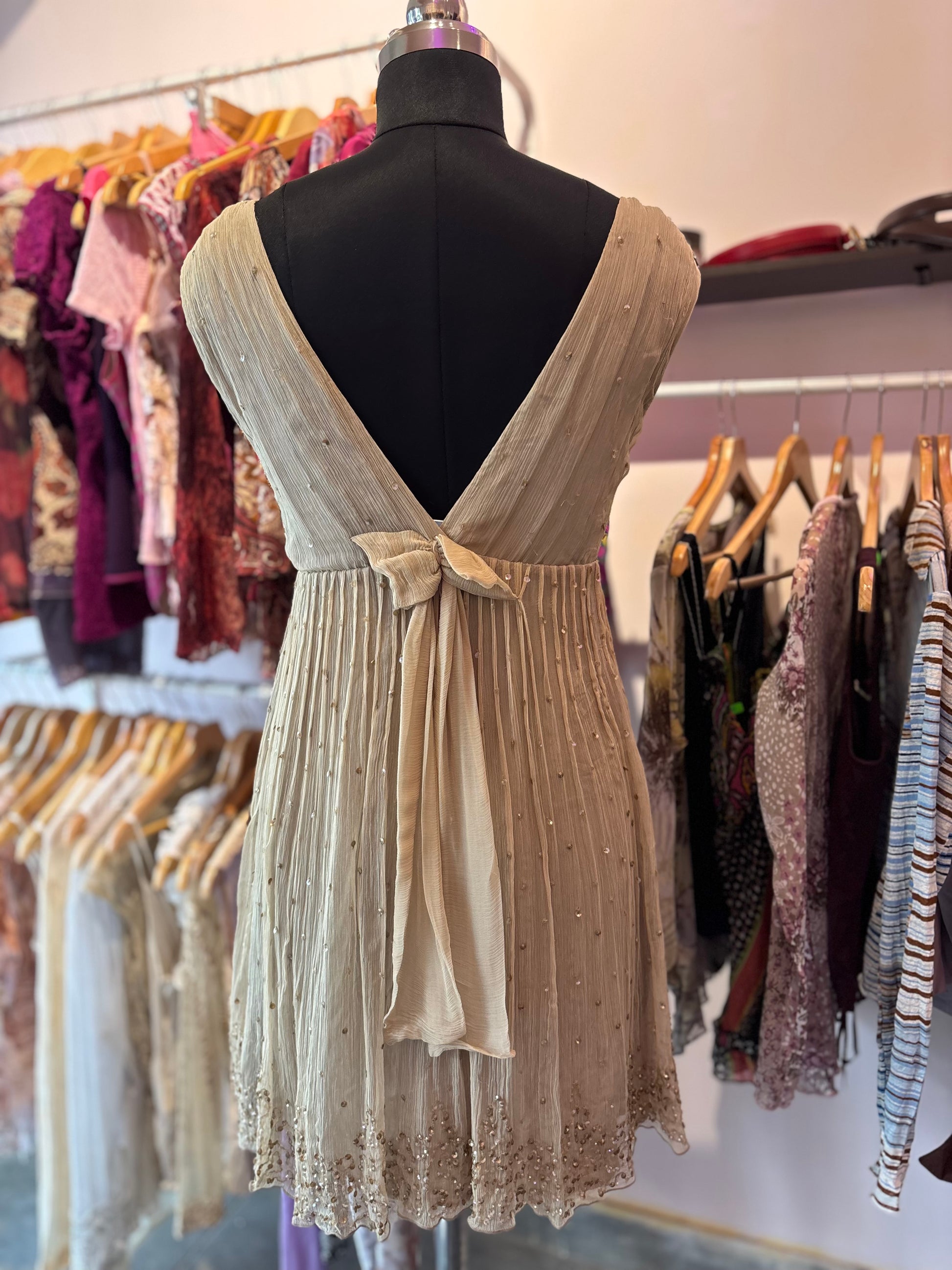 Bust 32 (expands upto 38) inches. Length 35 inches. Silk. Lined. Sequins