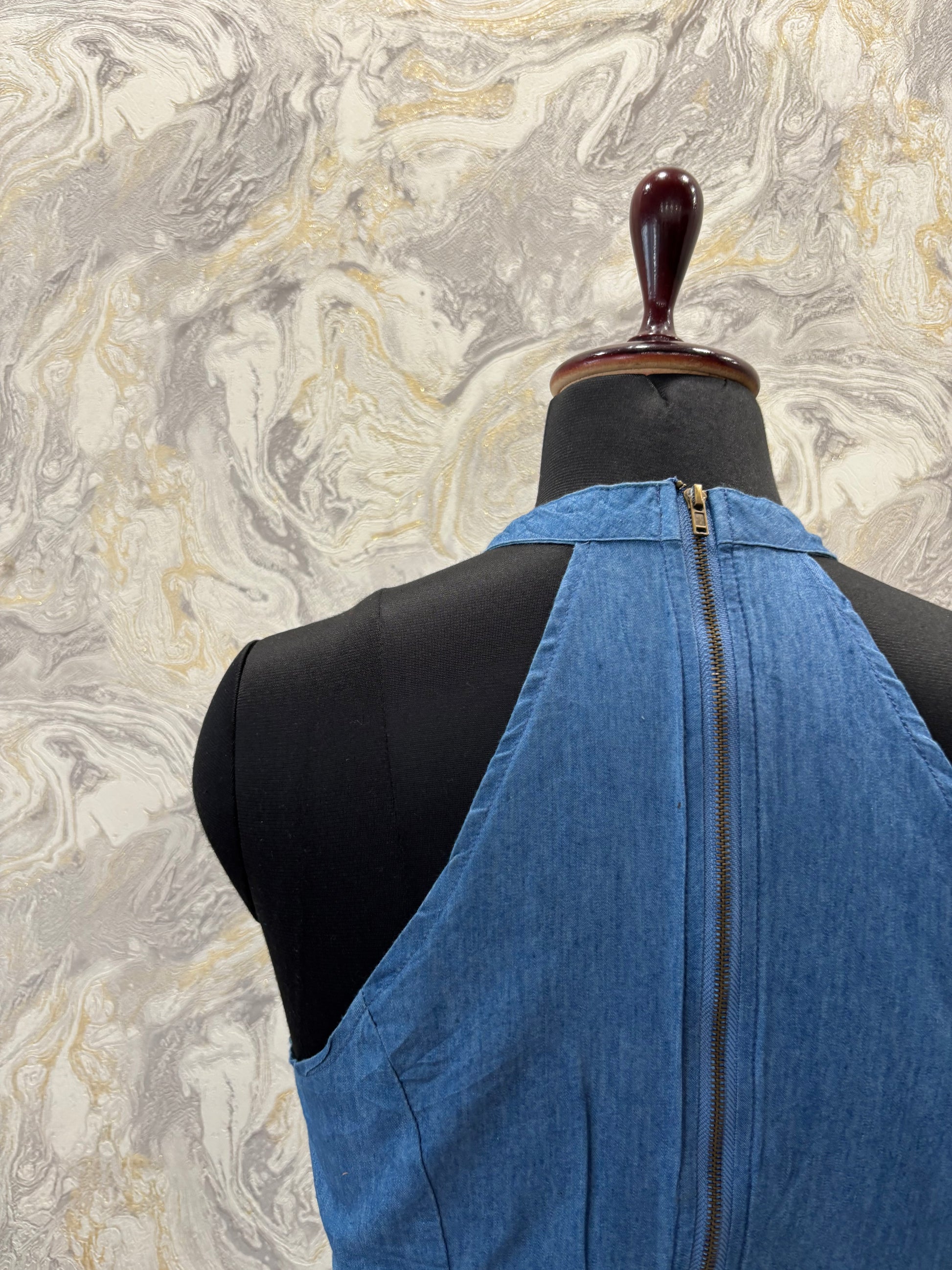 Bust 38 inches. Length 17 inches. Denim. Back zip