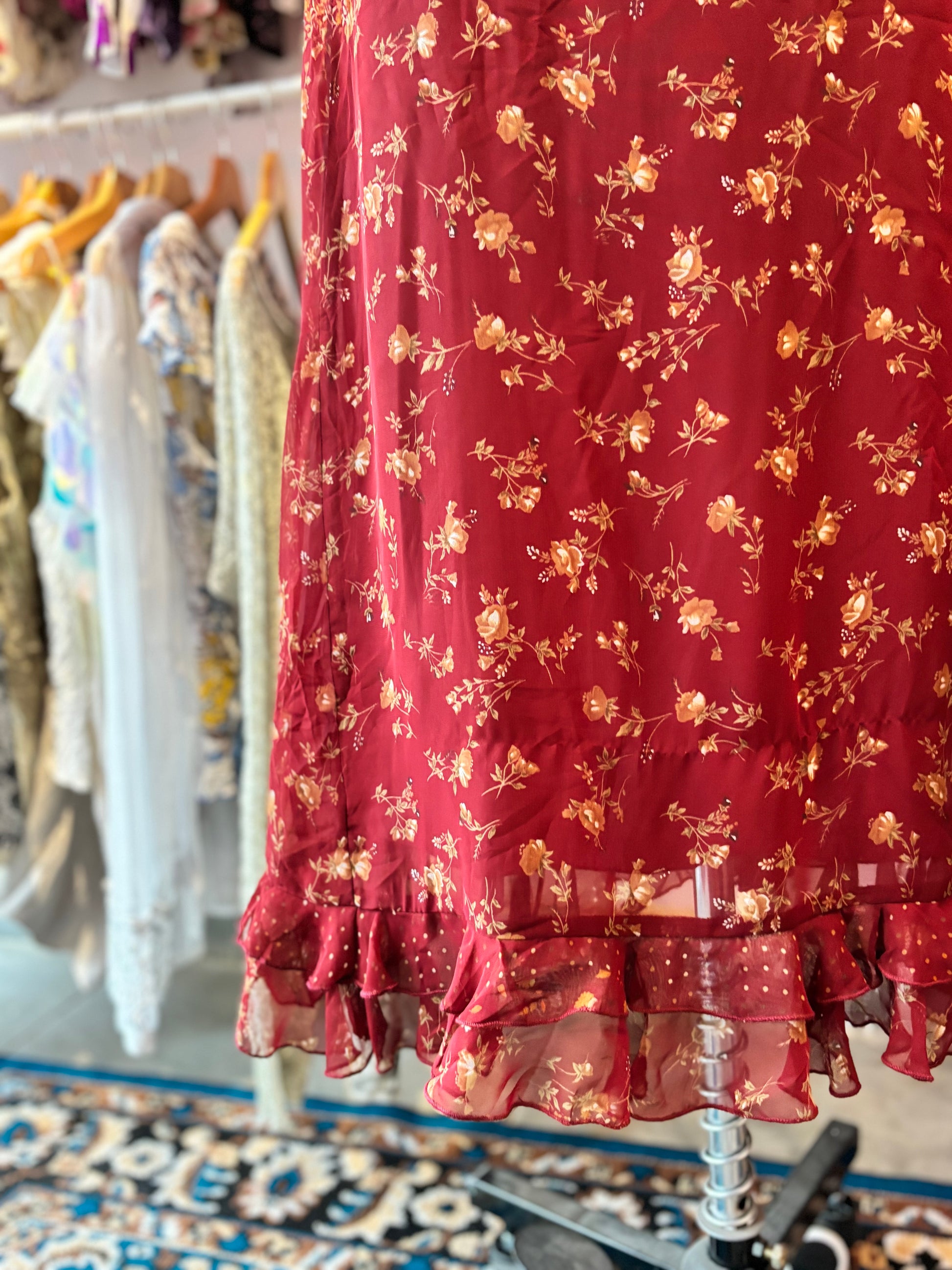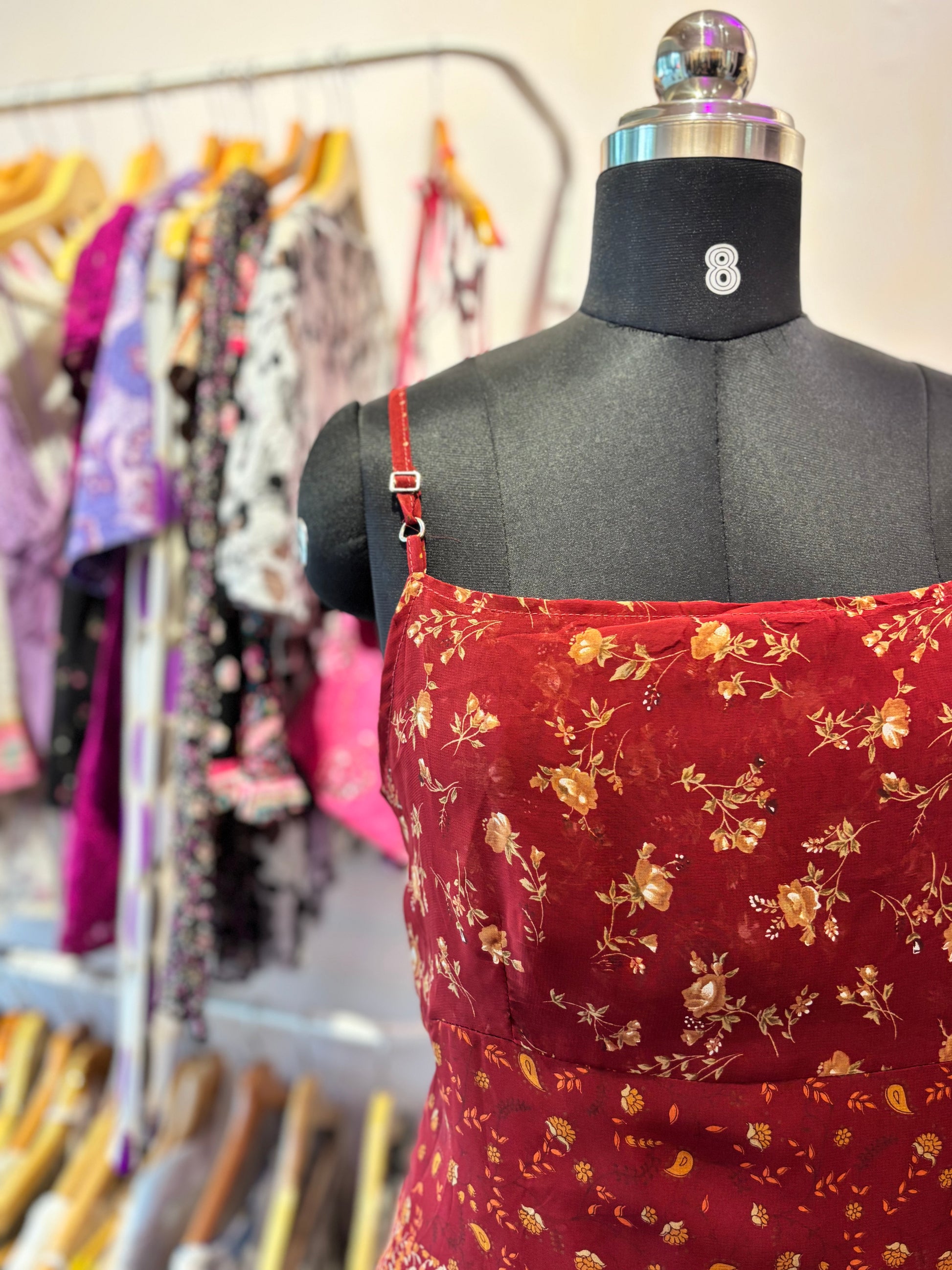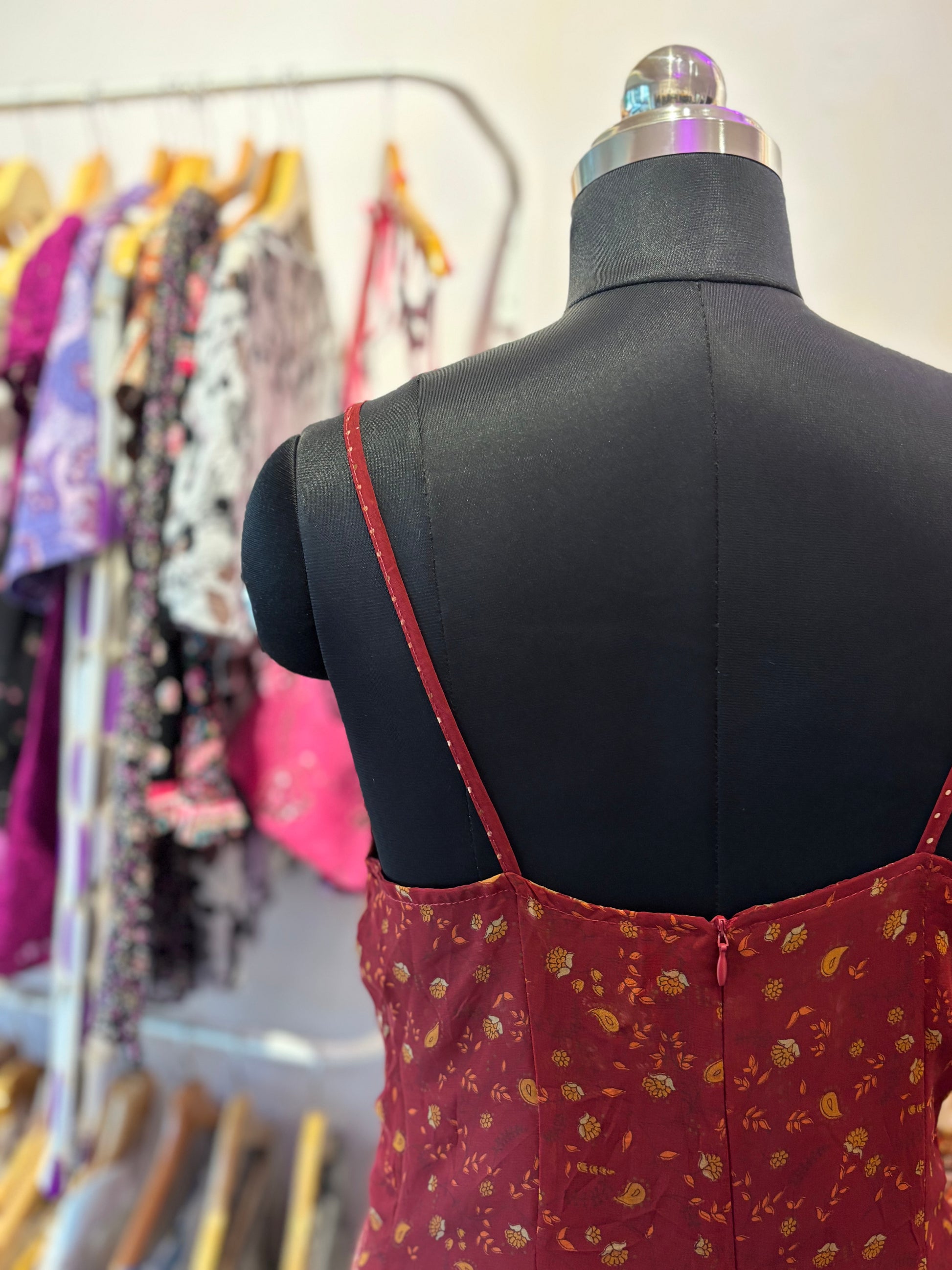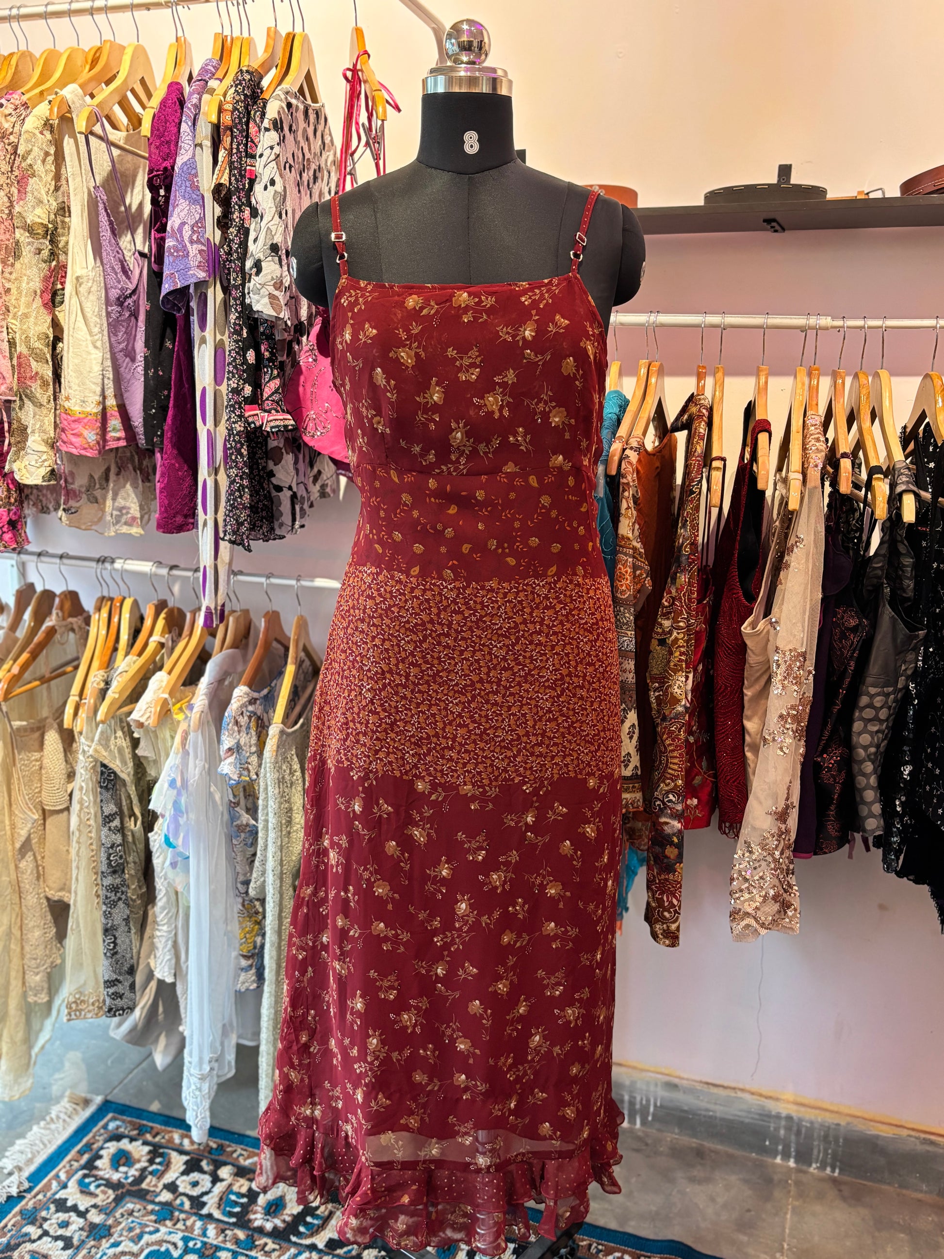 Bust 34/36 inches. Length 50 inches. Chiffon. Lined. Back zip. Adjustable straps