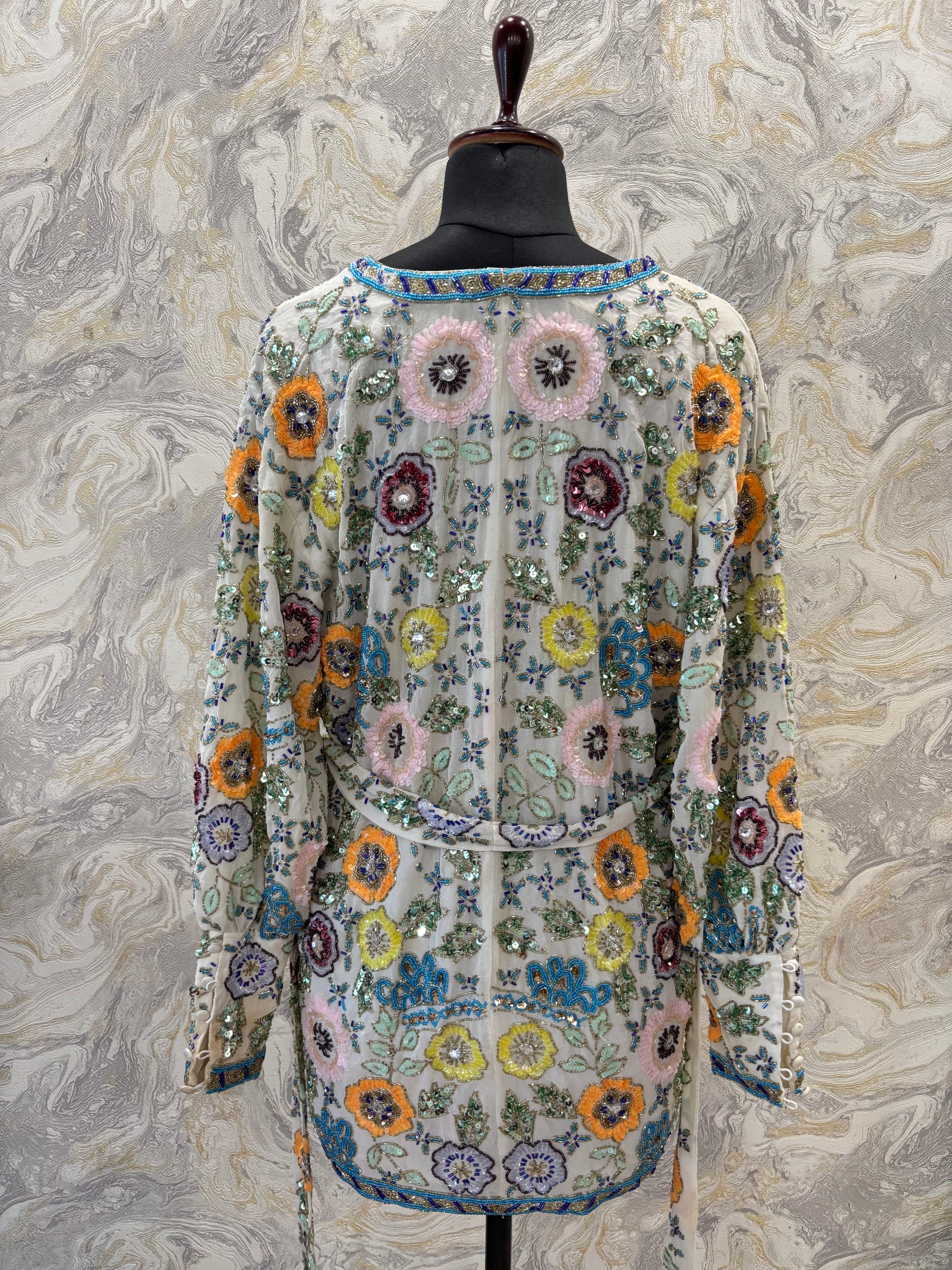 Bust fits 35 to 40 inches. Length 32. Lined. Sequins and bead work. Heavy. Delicate work. Comes with a belt