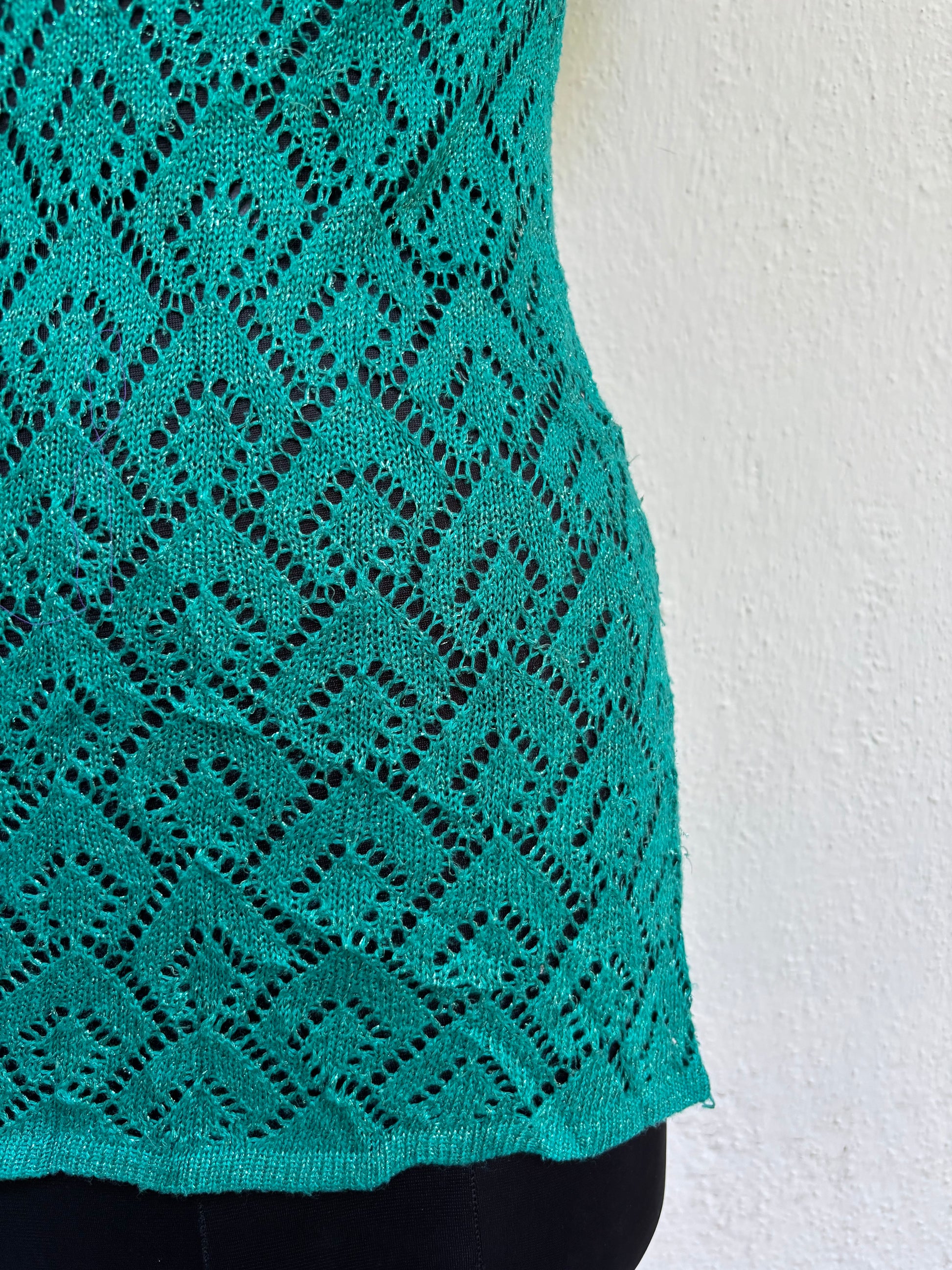 Bust 28 ( stretches upto 34) inches. Length 29 inches. Crochet. Sequins detail