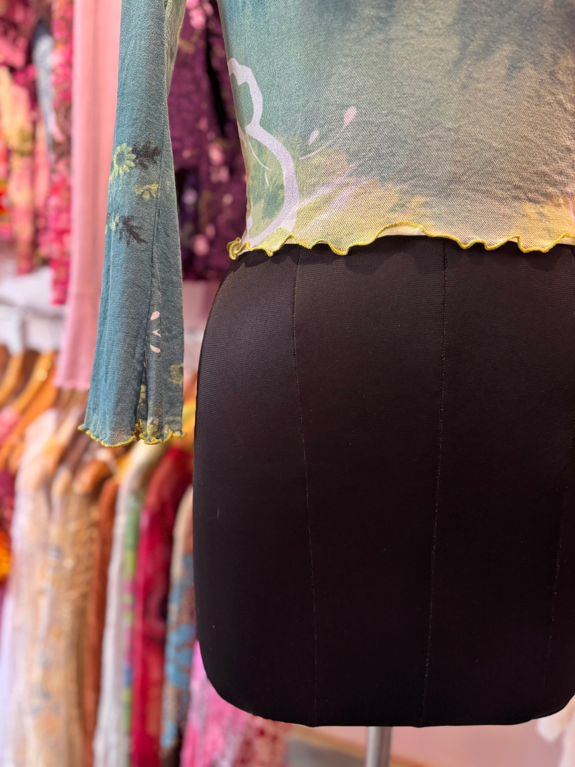 Bust 30 ( stretches upto 38) inches. Length 17 inches. Mesh.