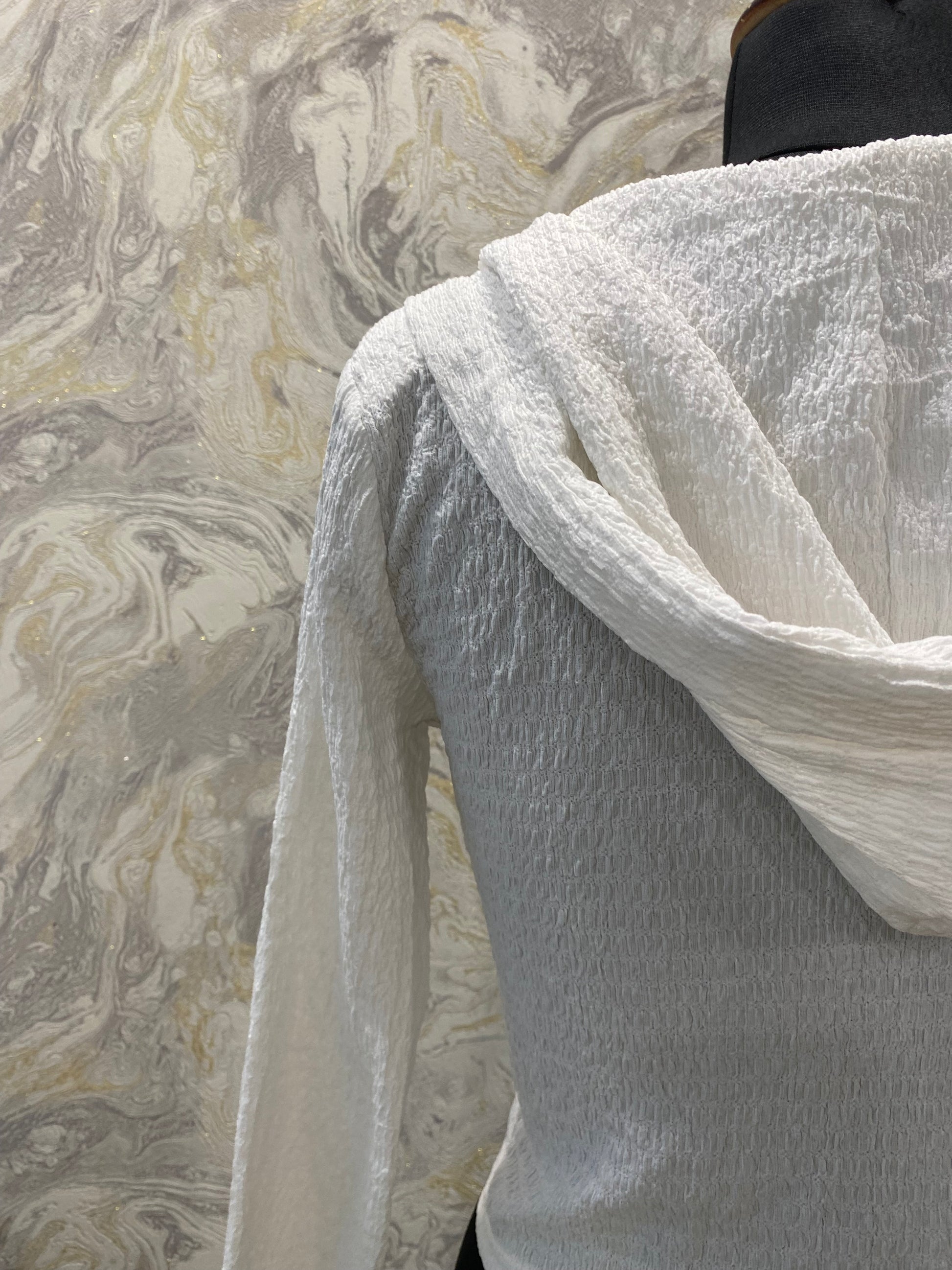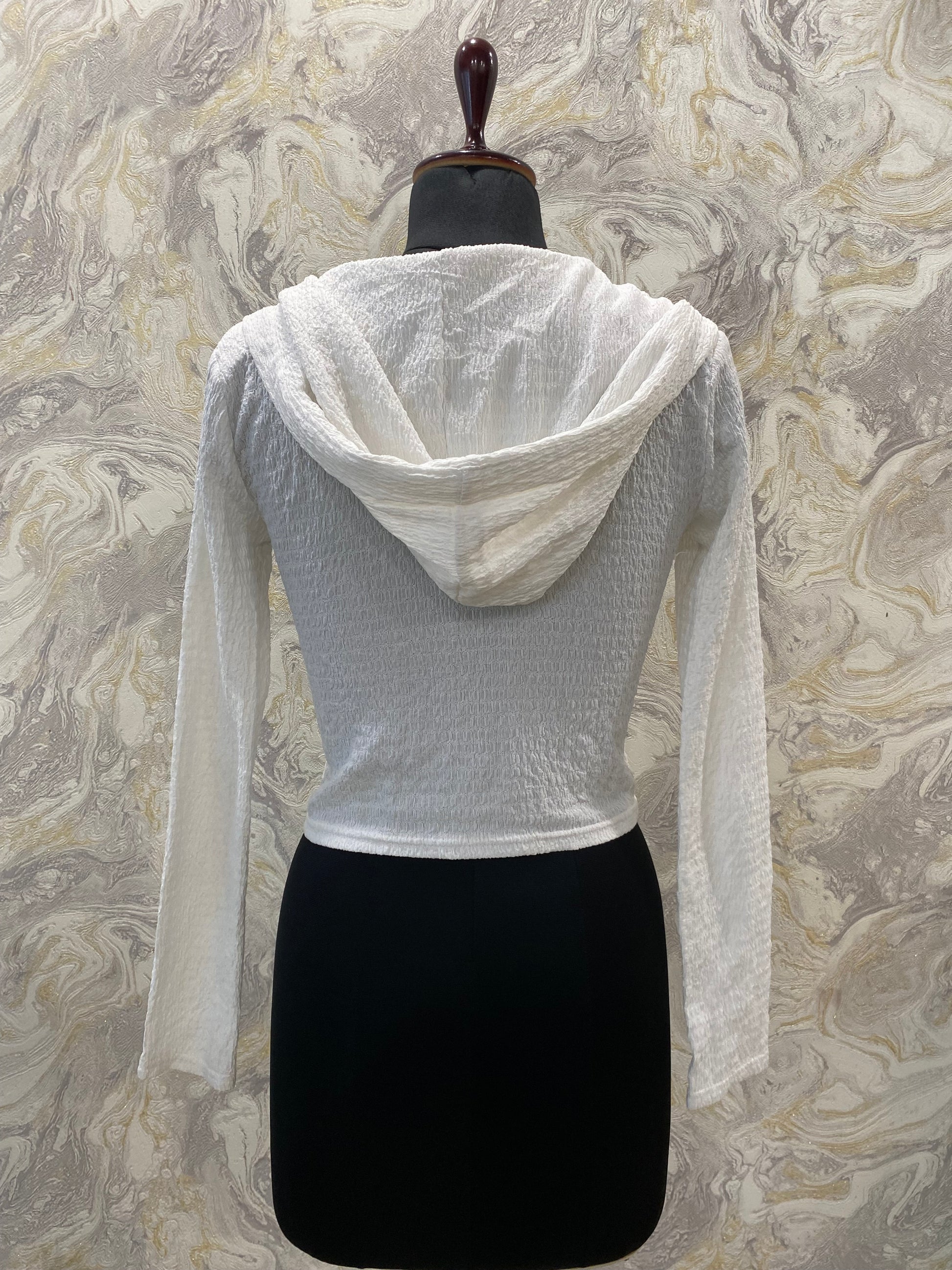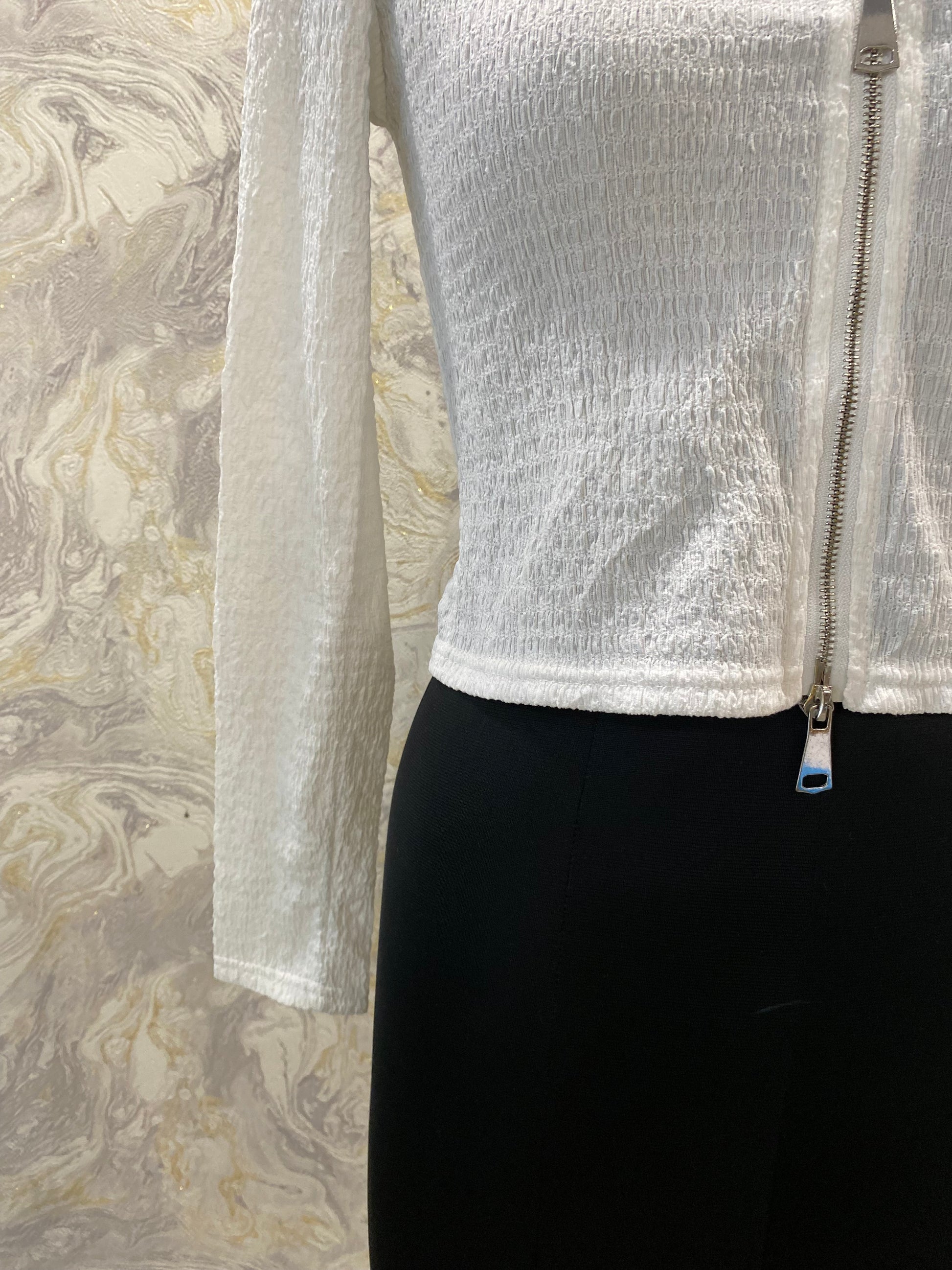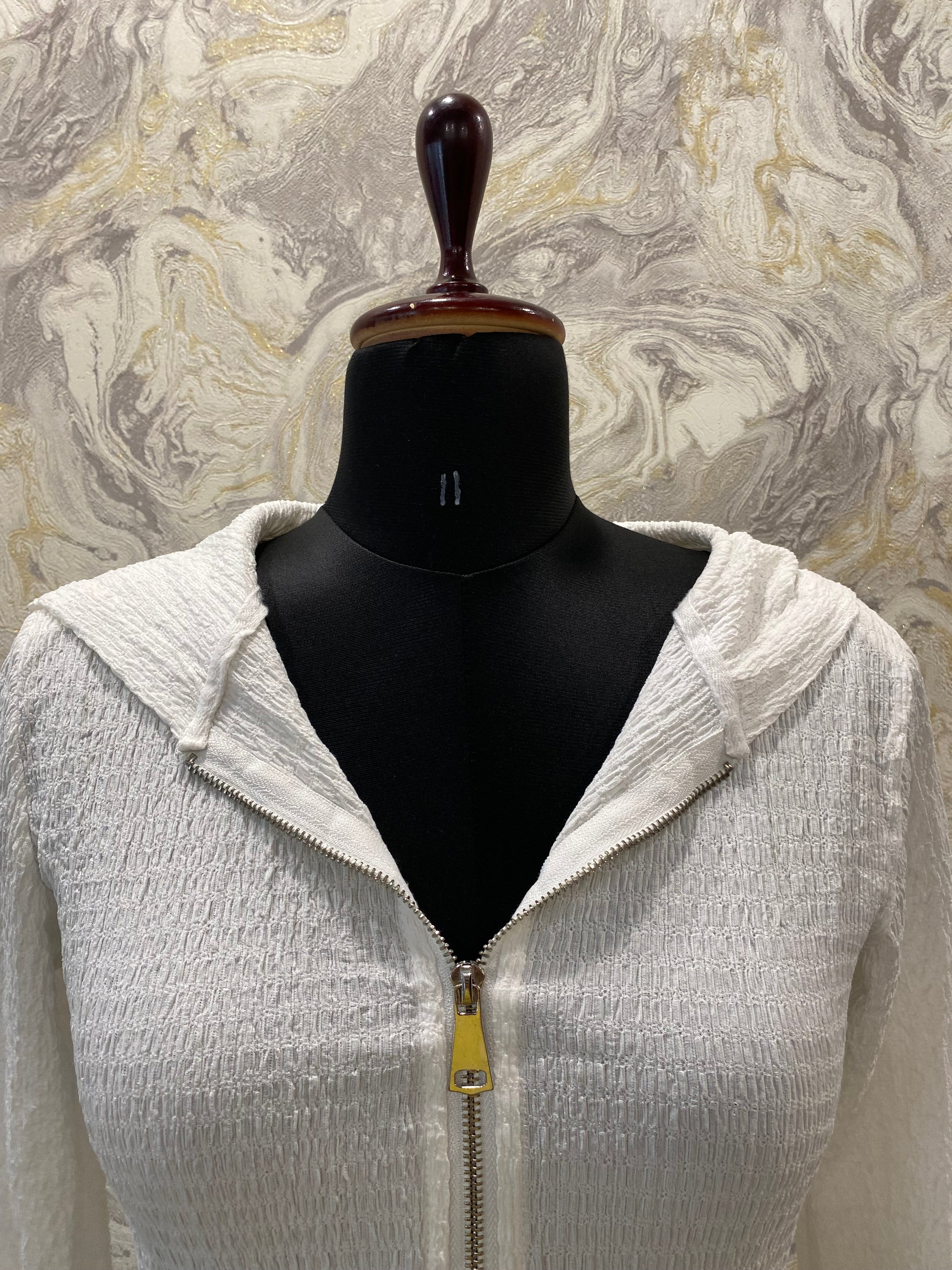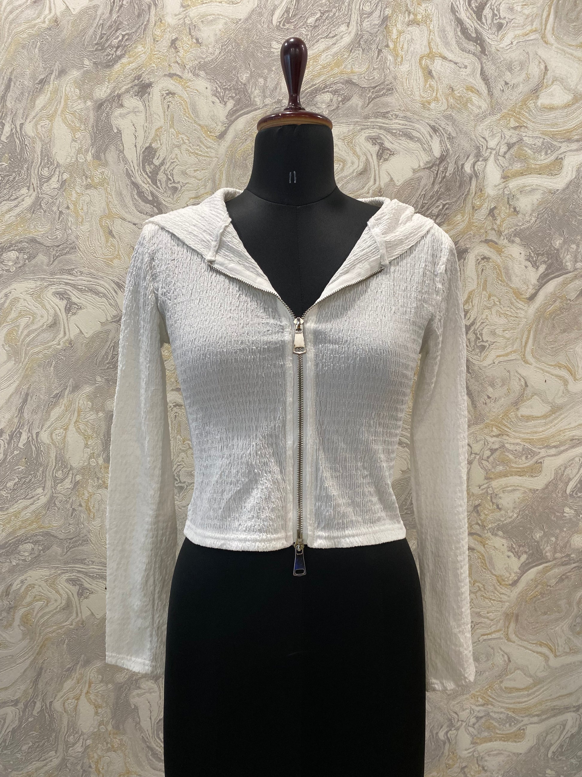 Bust 32 (stretches upto 40) inches. Length 18 inches. Crinkled. Georgette like. Zip in between