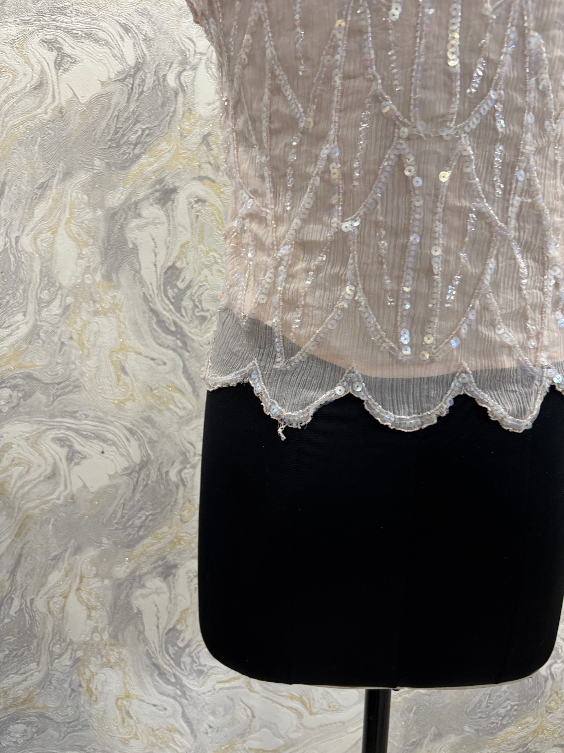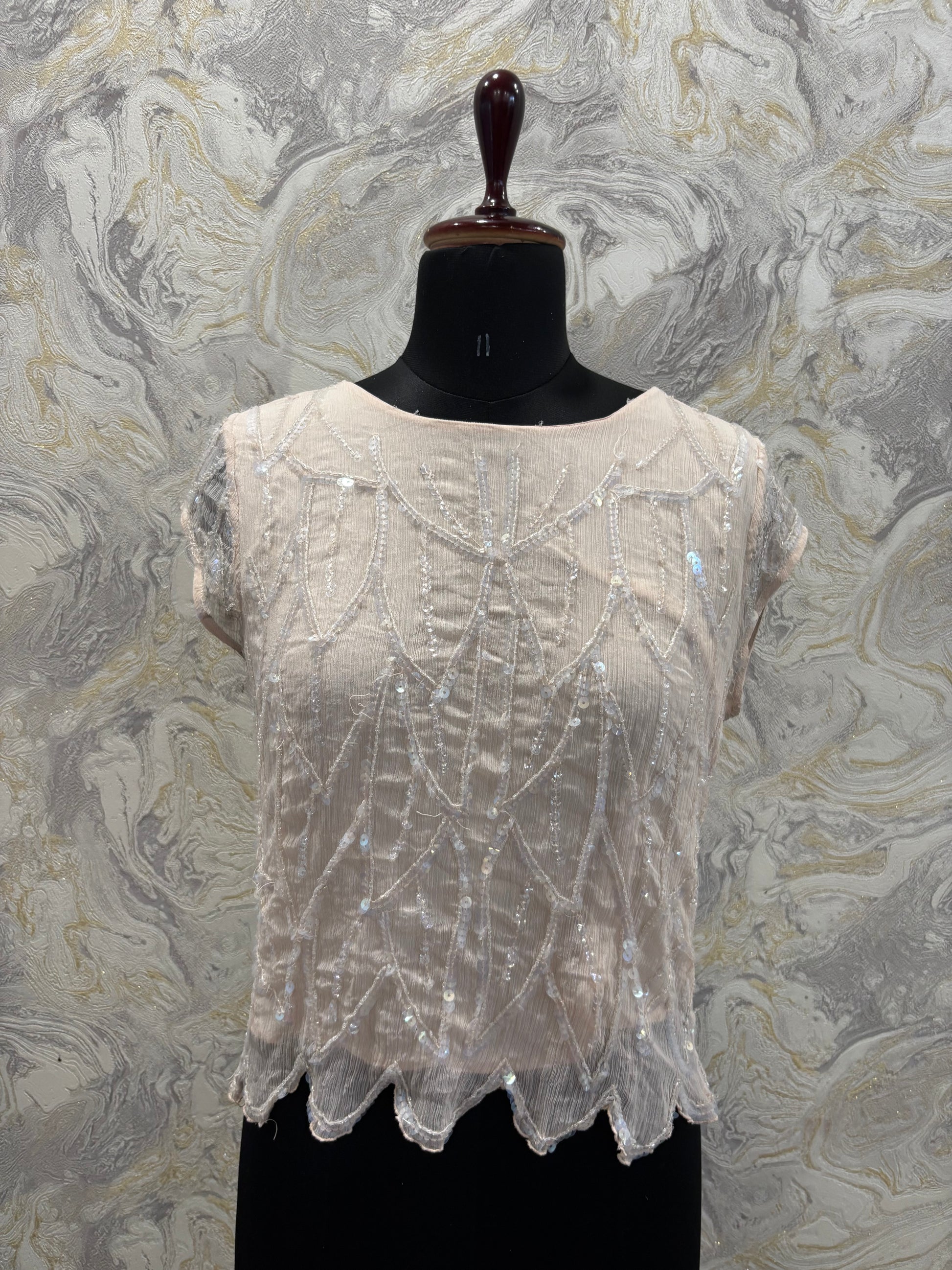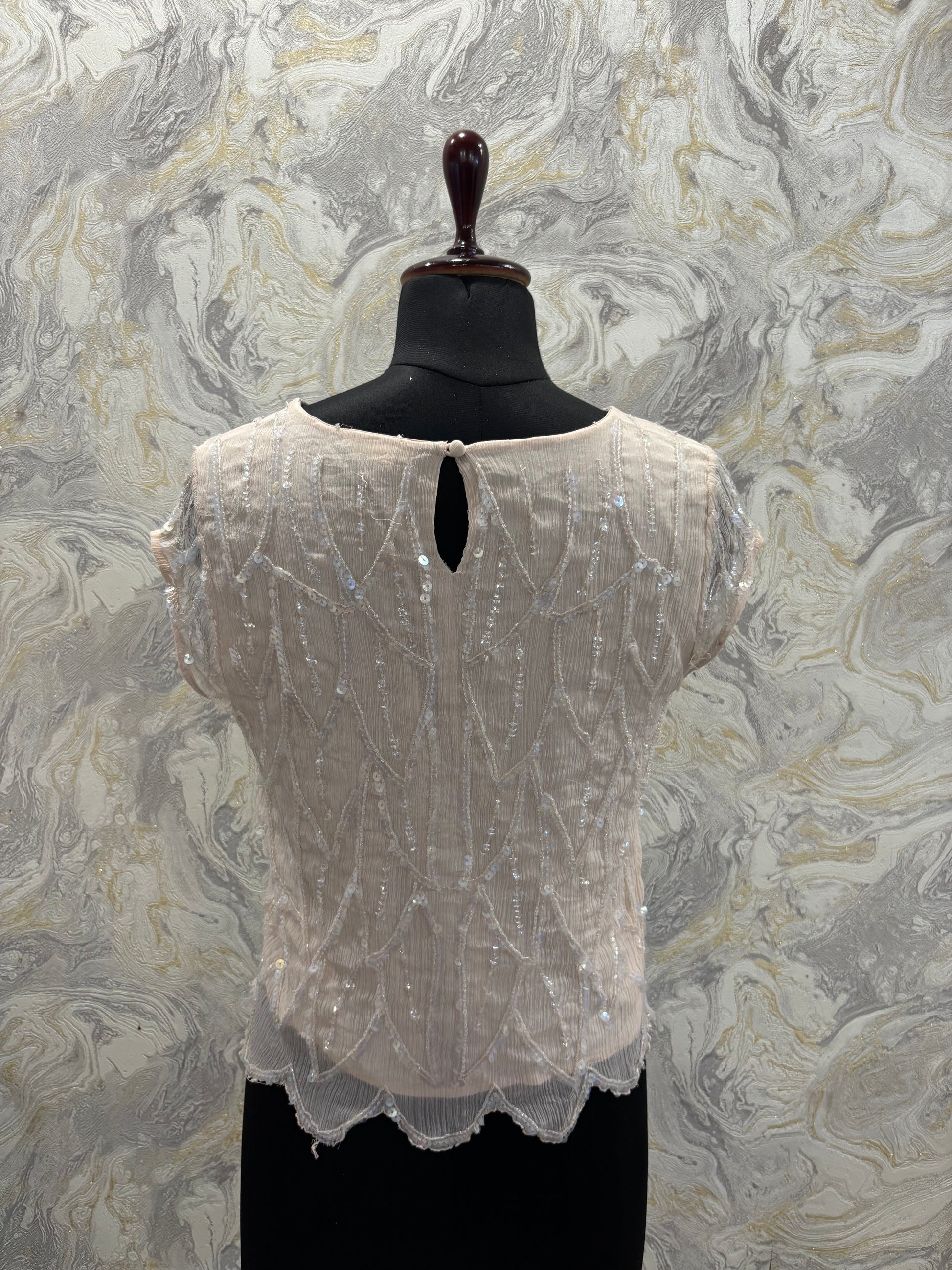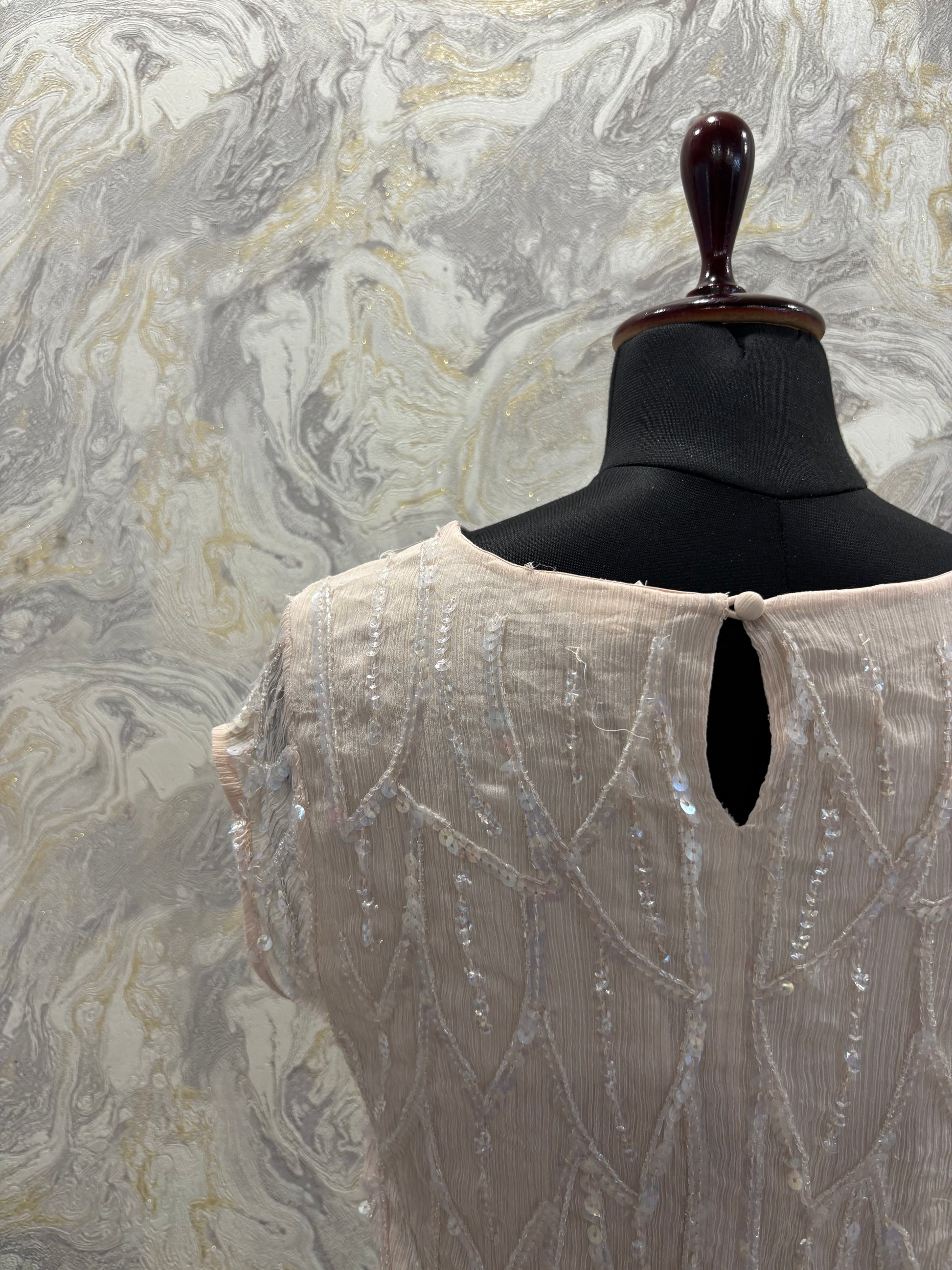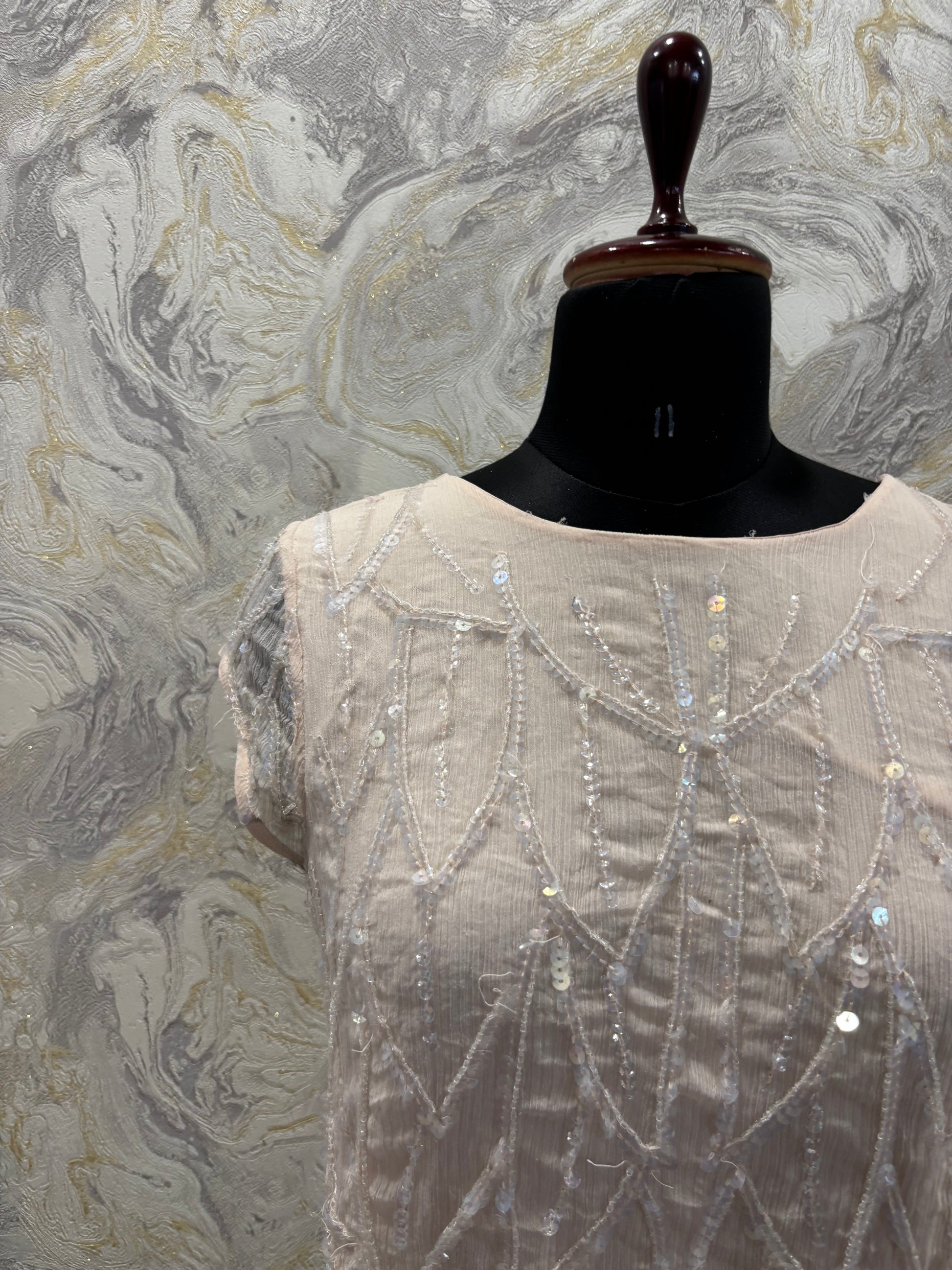 Bust 36/38 inches . Length 21 inches. Chiffon. Lined. Sequin bead work.