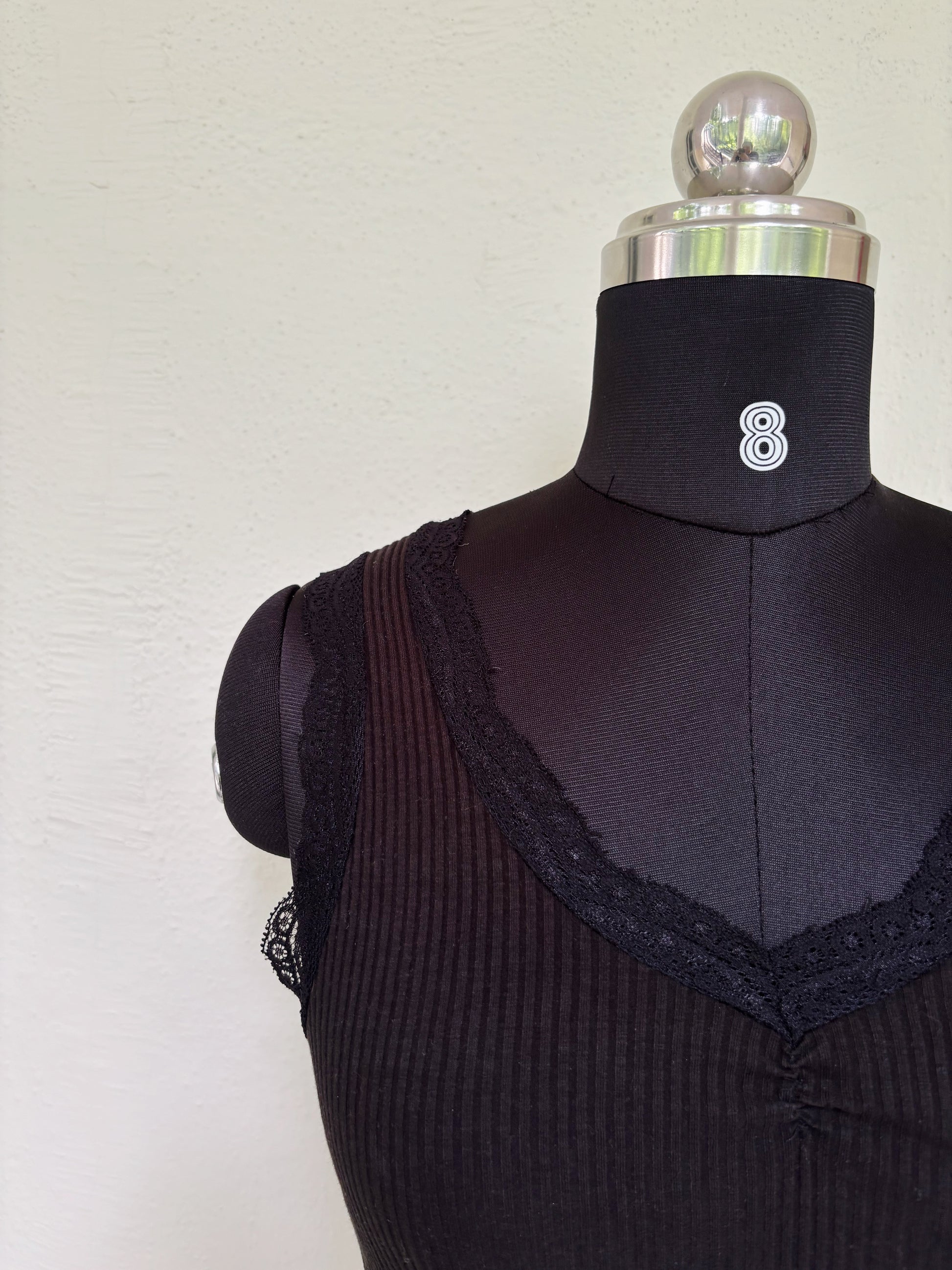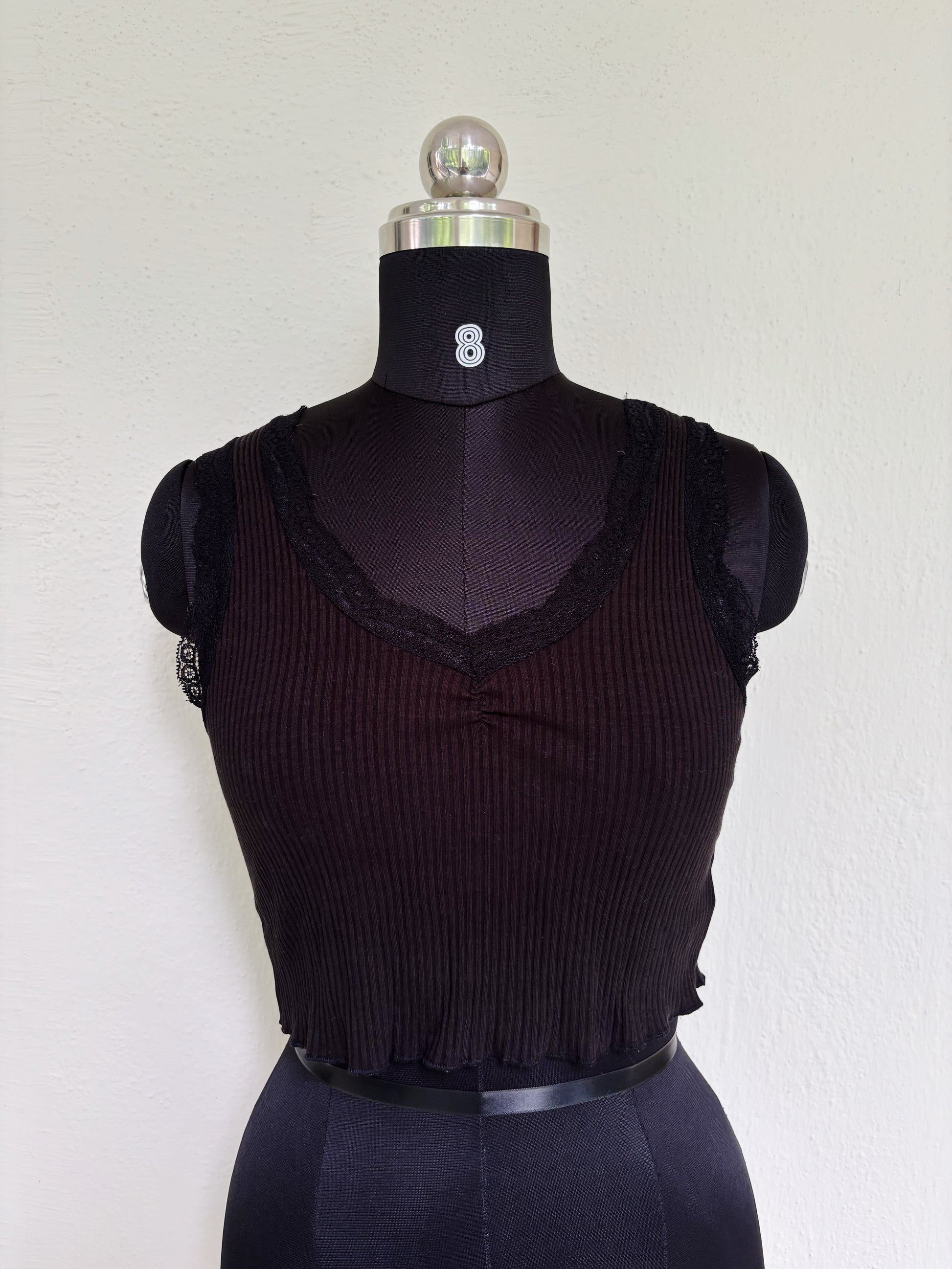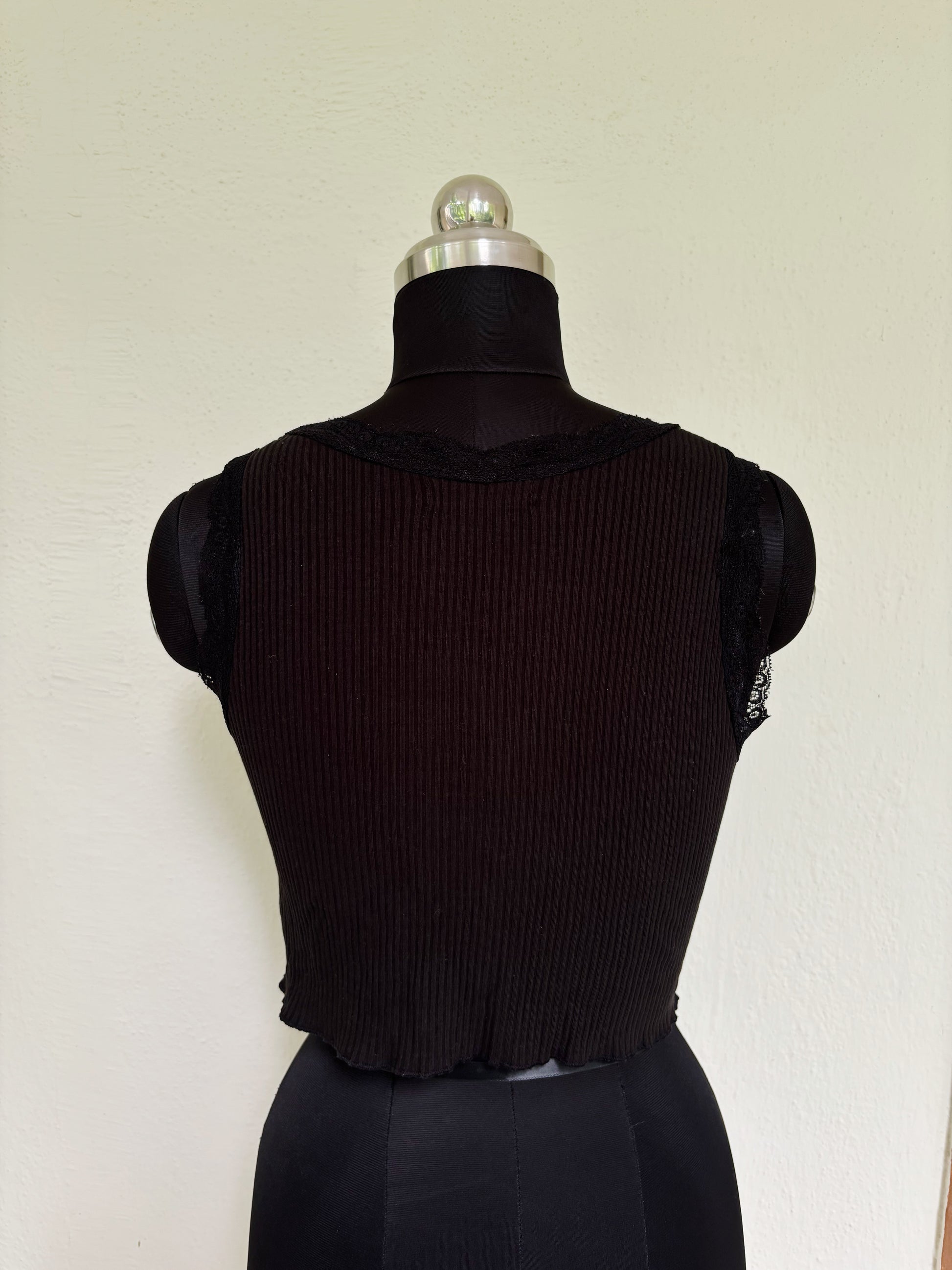 Bust 32 ( stretches upto 40) inches. Length 15 inches. Lace. Knit.