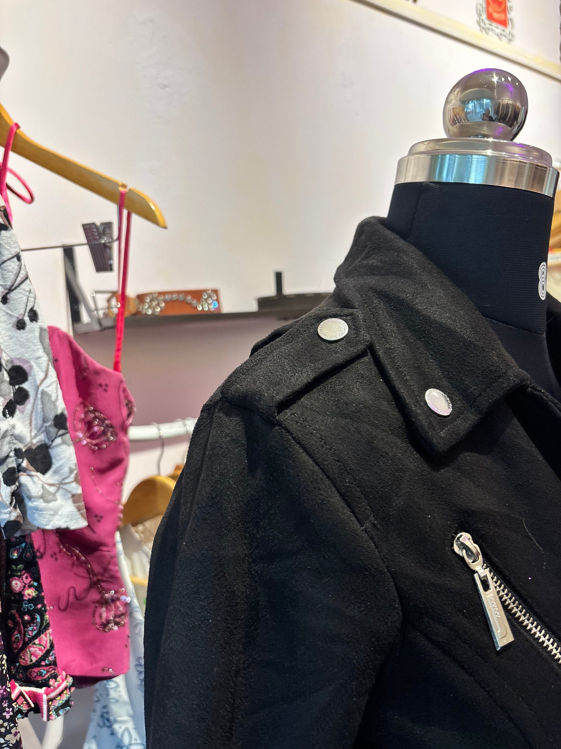 Bust pit to pit is 38 inches.Length is 23 inches. Suede. Multiple zip.