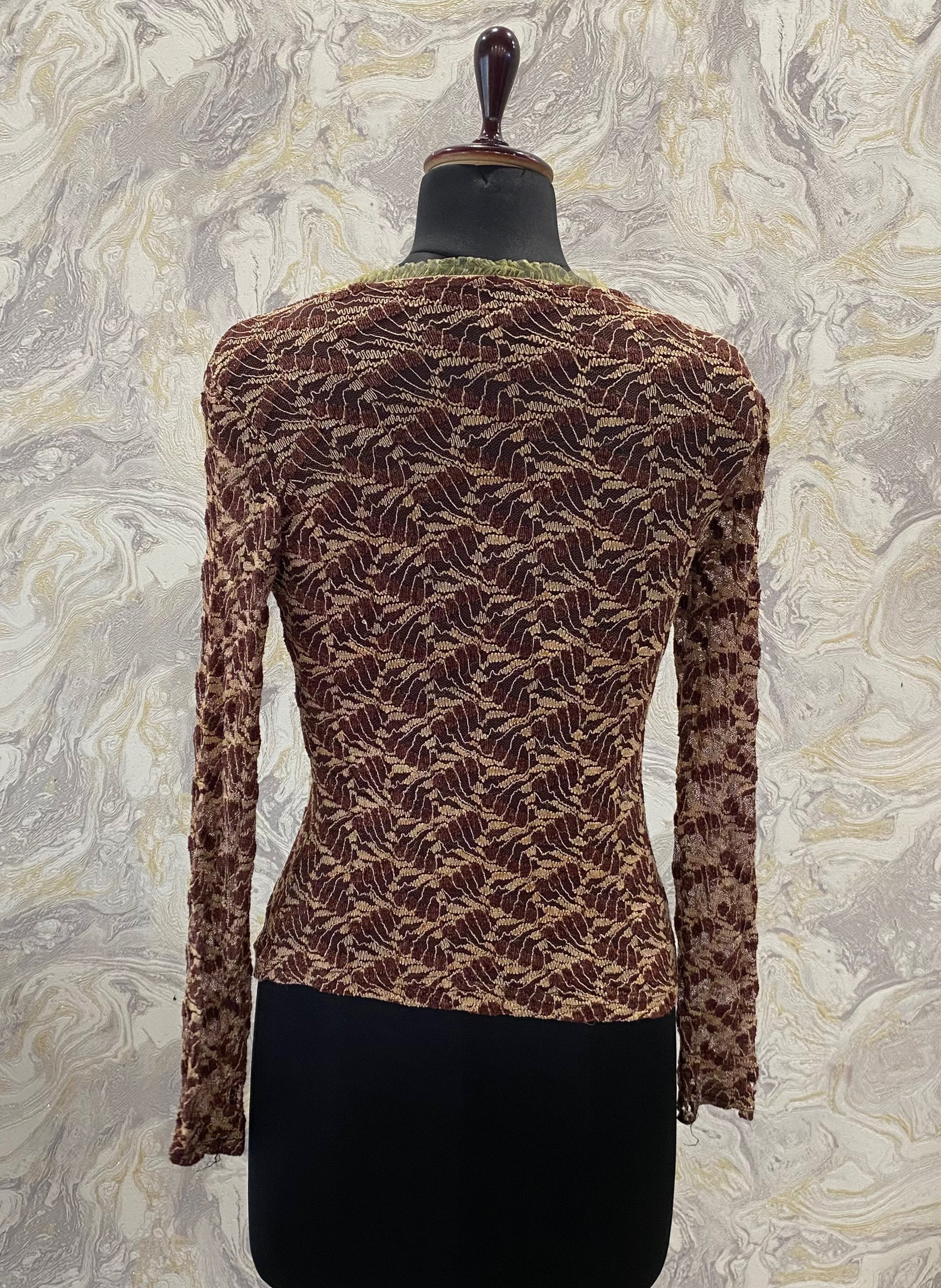 Bust 34 (stretches upto 38) inches. length 23 inches. Lacy.