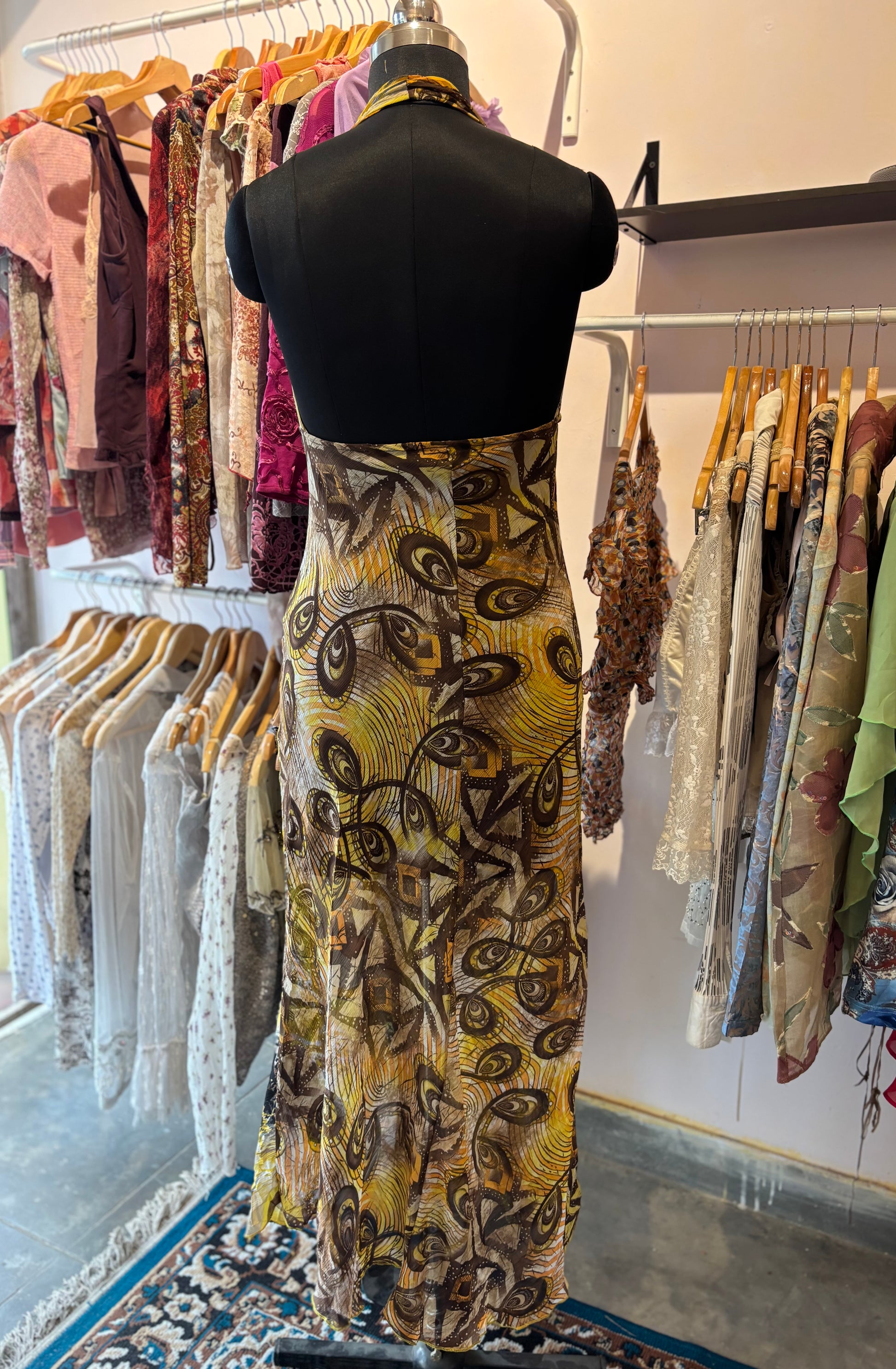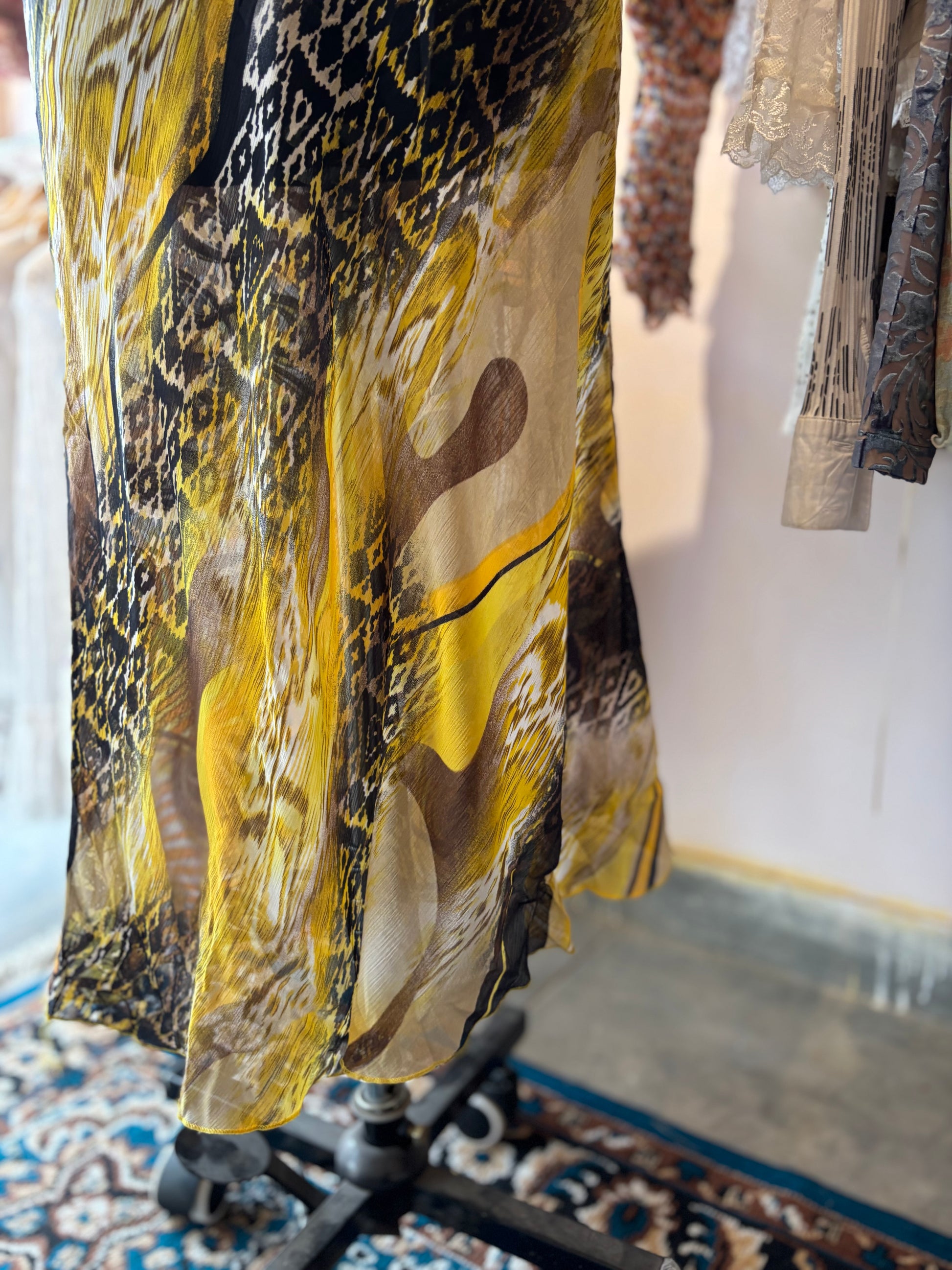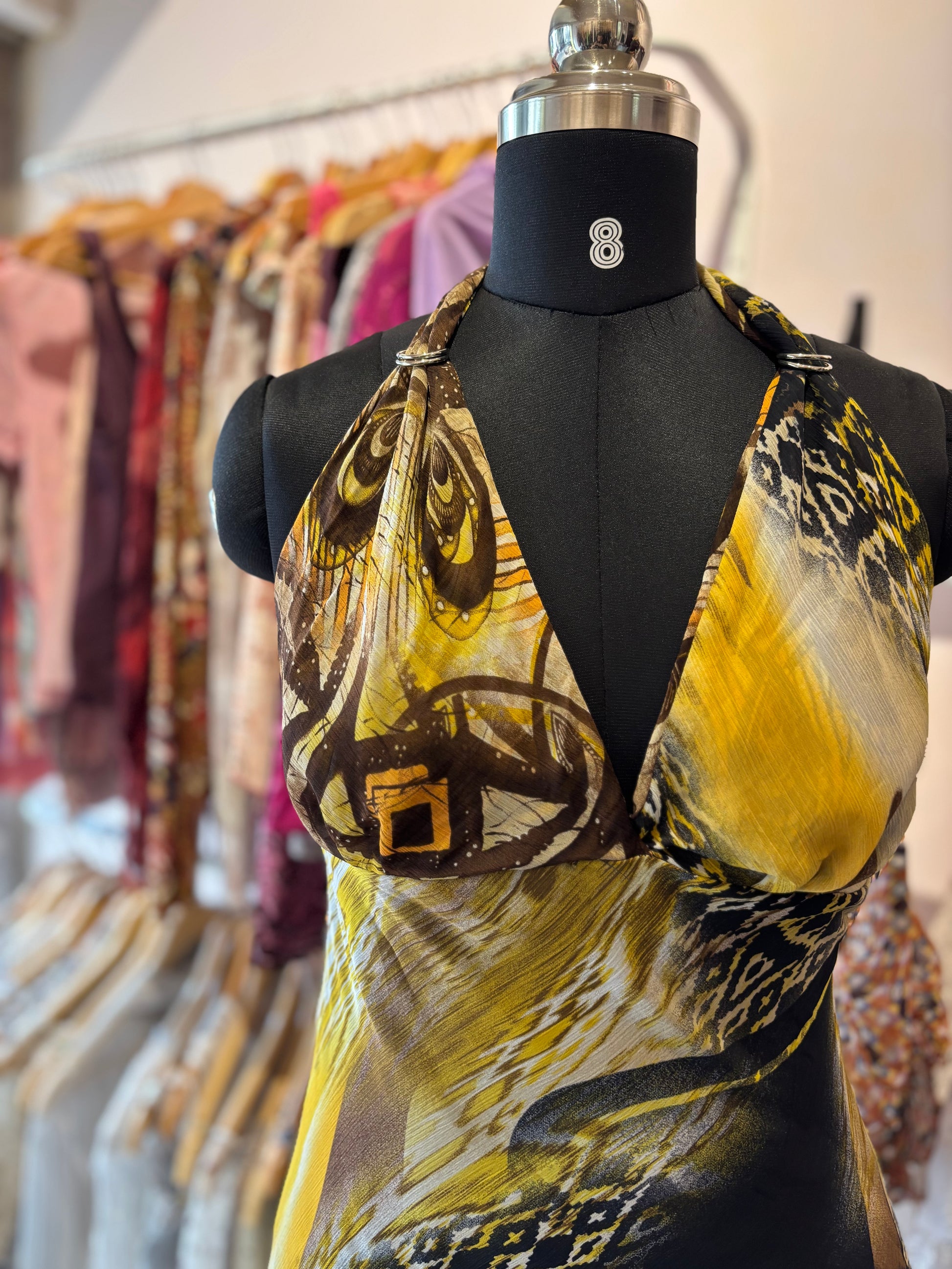 Bust 30 ( stretches upto 35) inches. Length 59 inches. Georgette. Lined
