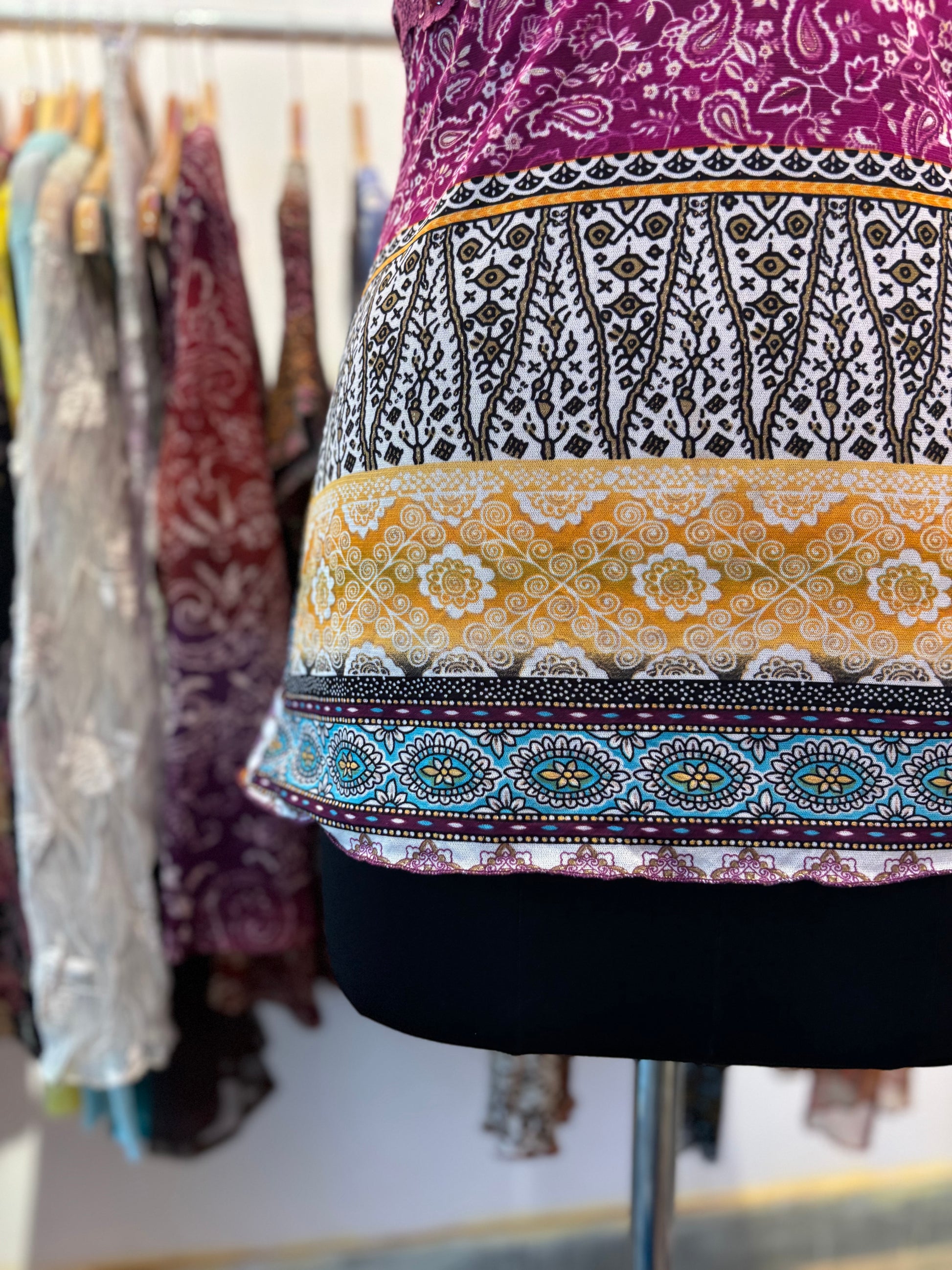 Bust 32 (stretches upto 40) inches. Length 26 inches. Mesh. Lined