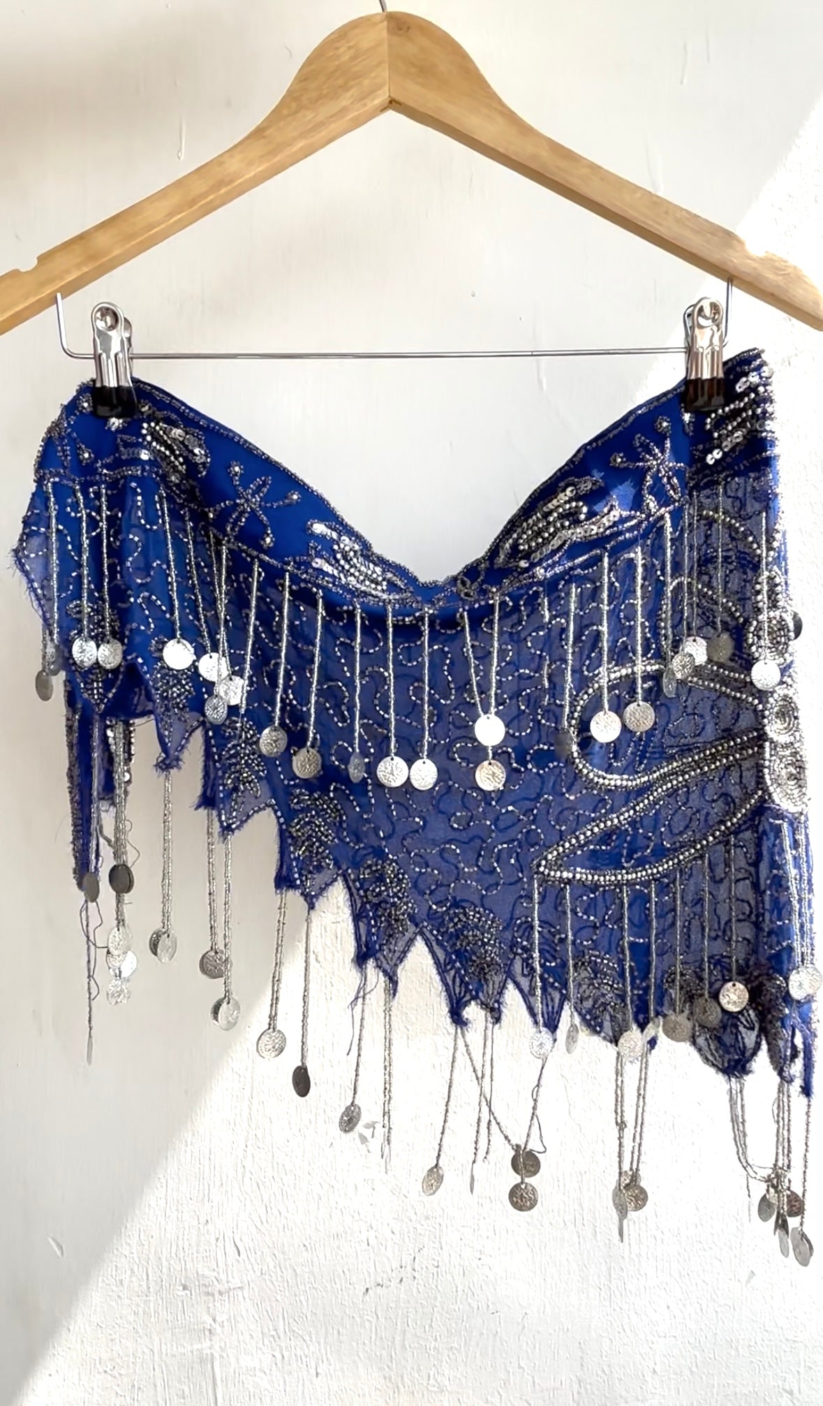 Waist fits. Length. Georgette. Sequins and bead work. Can be used as a tier top/ bandana too