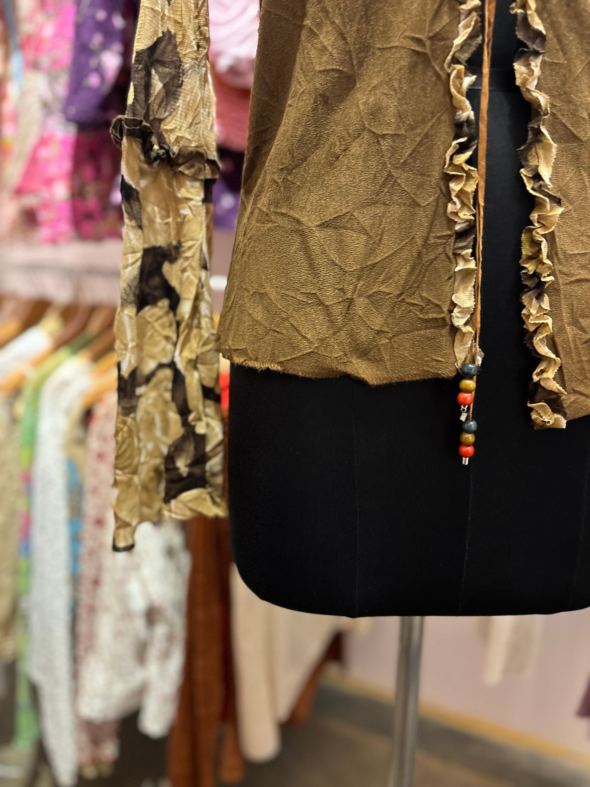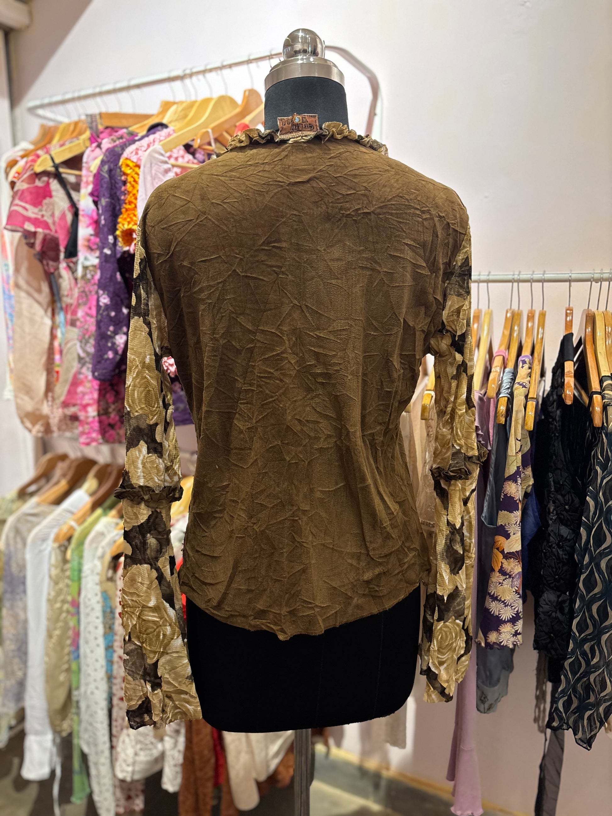 Bust 36 ( stretches upto 46) inches. Length 25 inches. Velvet kind of fabric in front and back. Sleeves are mesh and strings in between