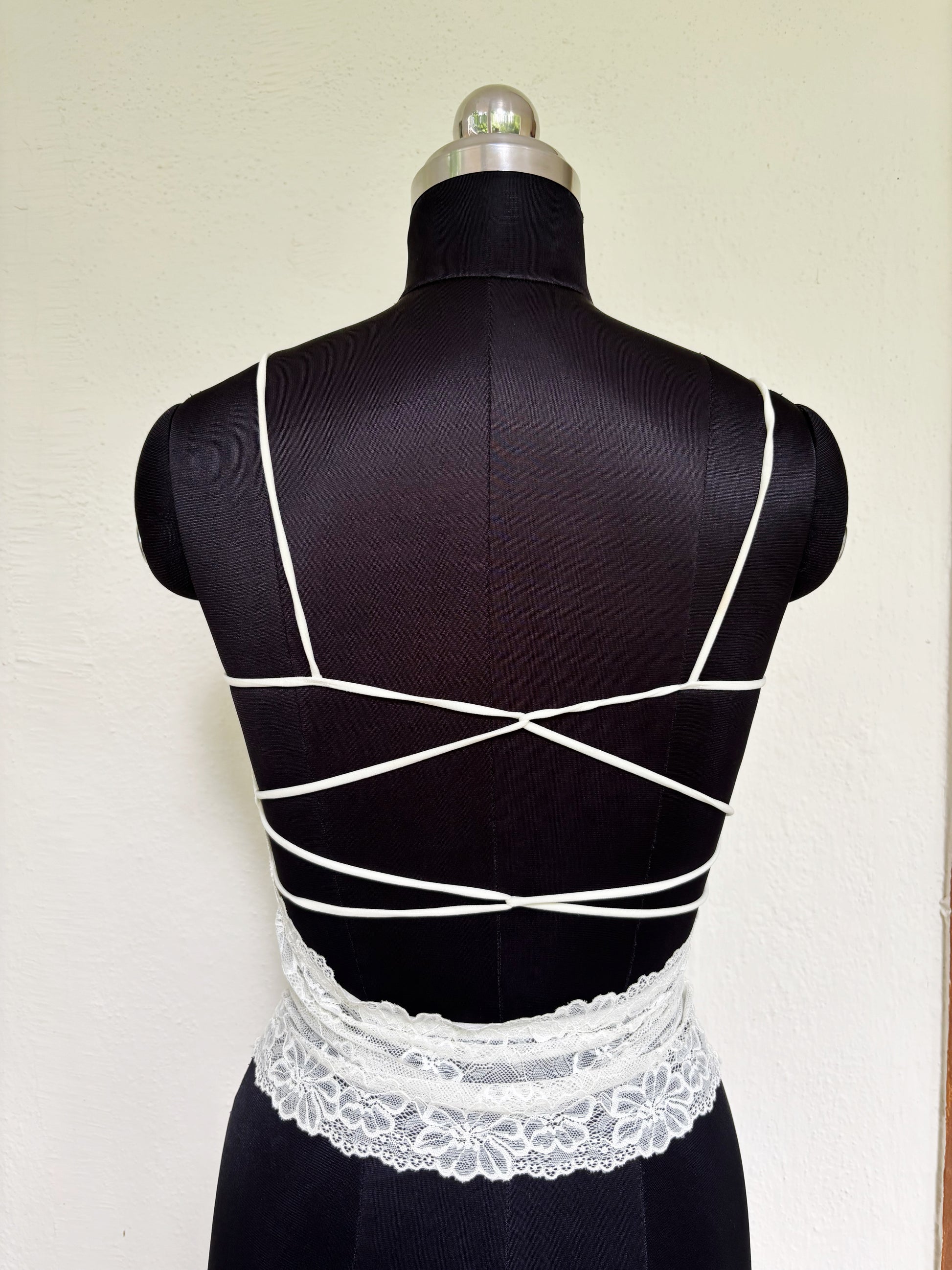 Bust 26 ( stretches upto 36) inches. Length 20 inches. Lacy. Bust lined. Criss cross back