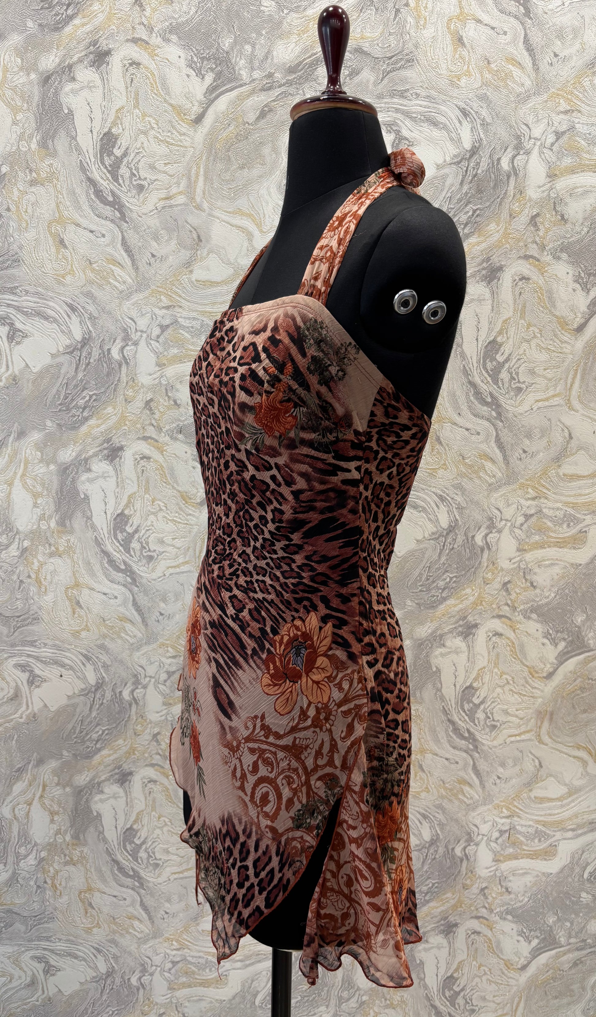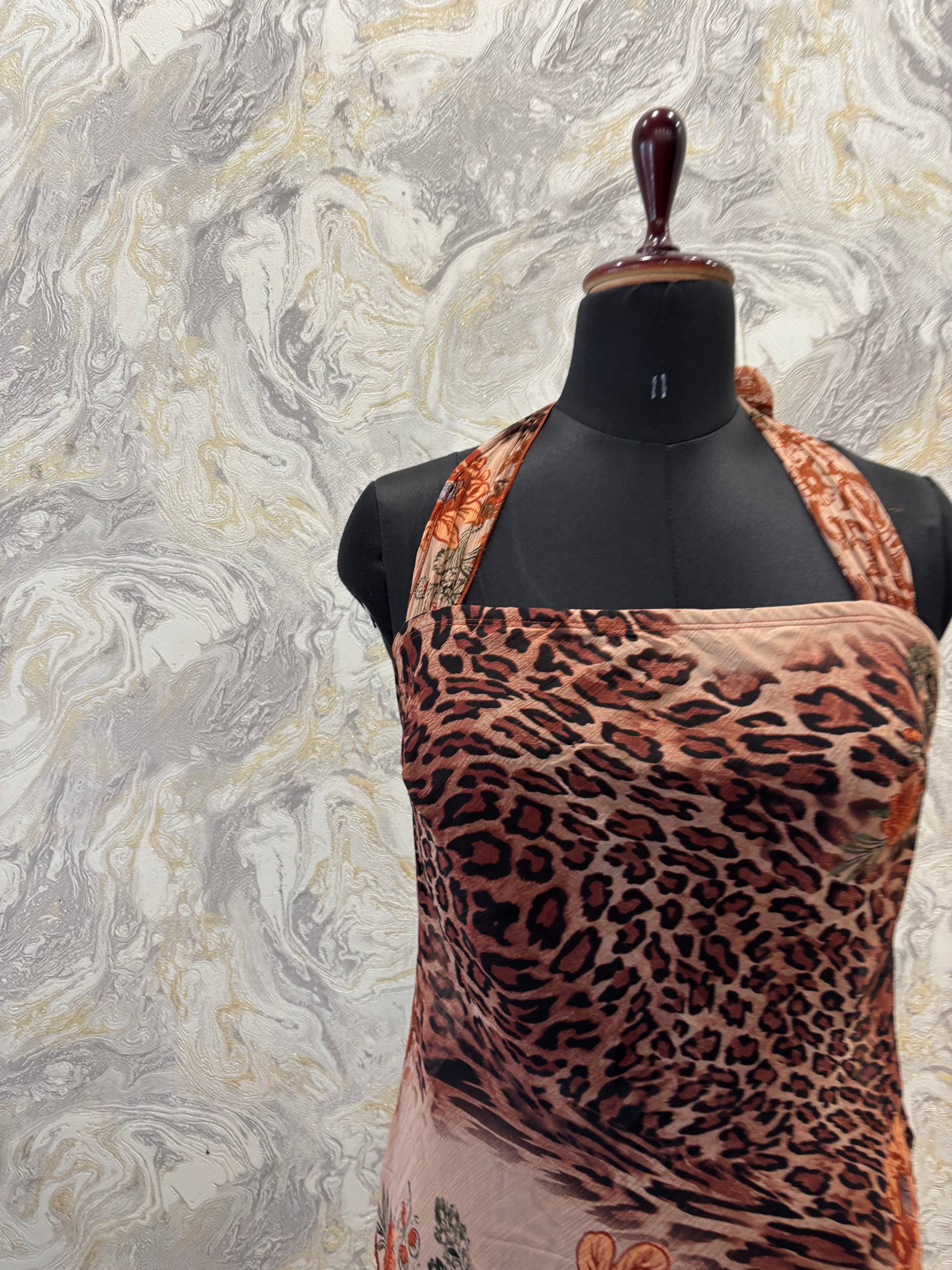 Bust 32 ( stretches upto 40) inches. Length 39 inches. Bust lined. Chiffon. Halter neck