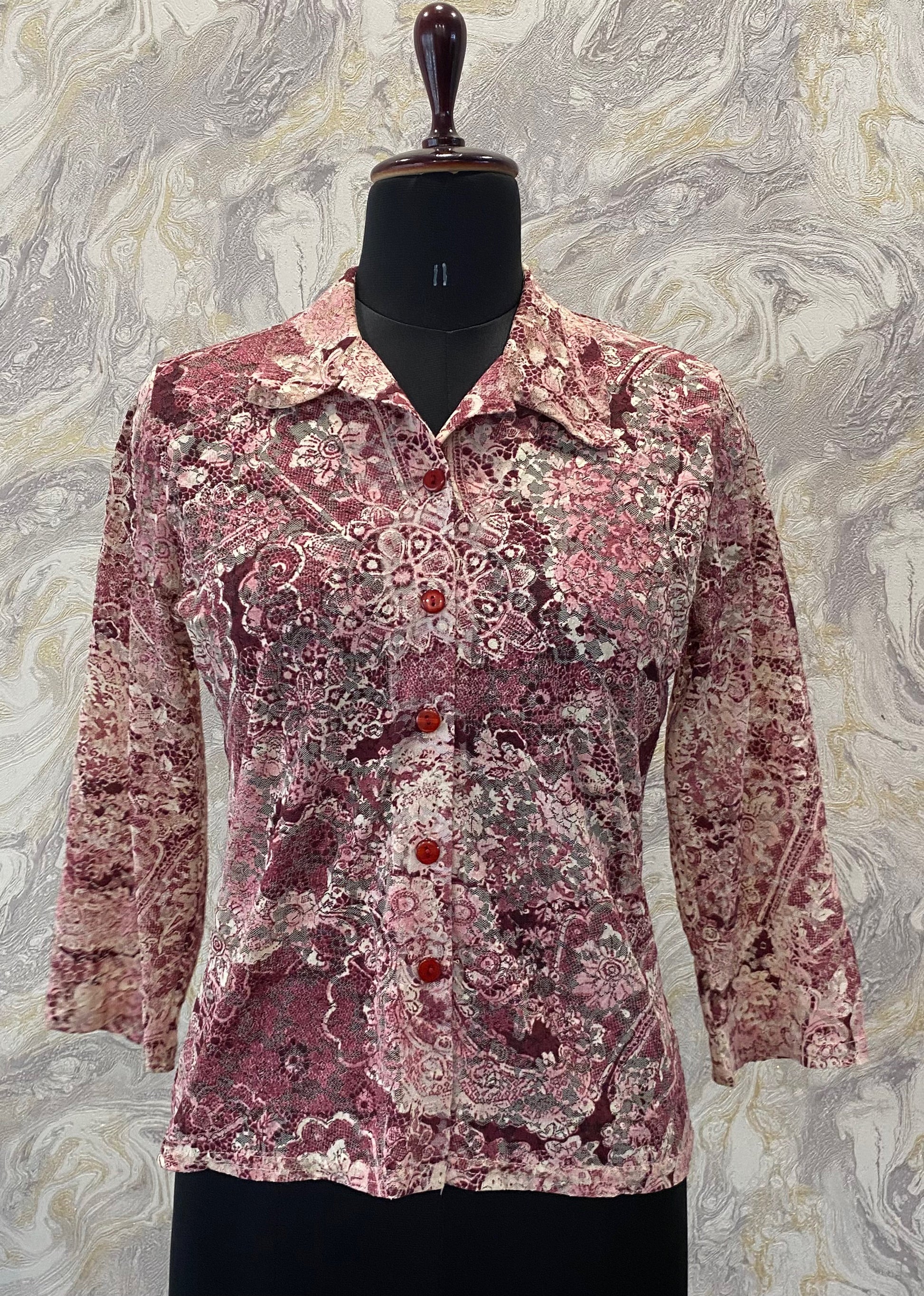 Bust 34 ( stretches upto 40) inches. Length 20 inches. Lacy. Buttons in between. Bit sheer