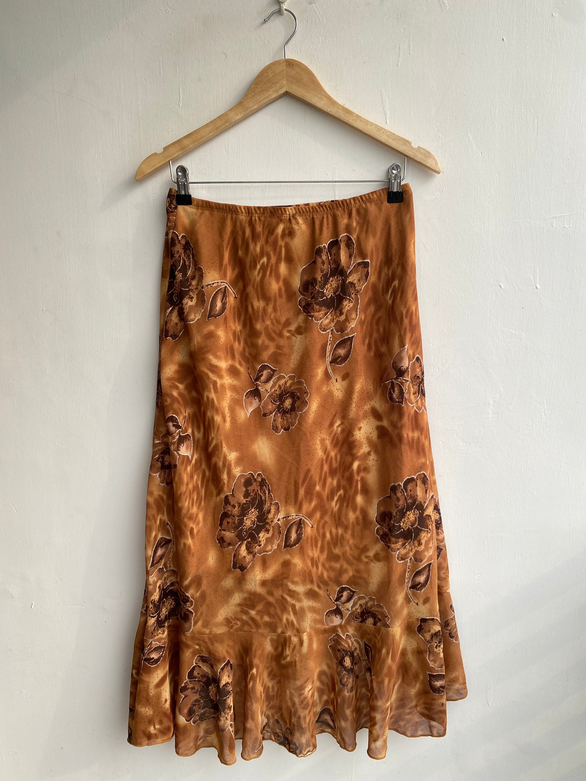 Waist 28 (stretches upto 38) inches. Length 32 inches. Georgette. Lined