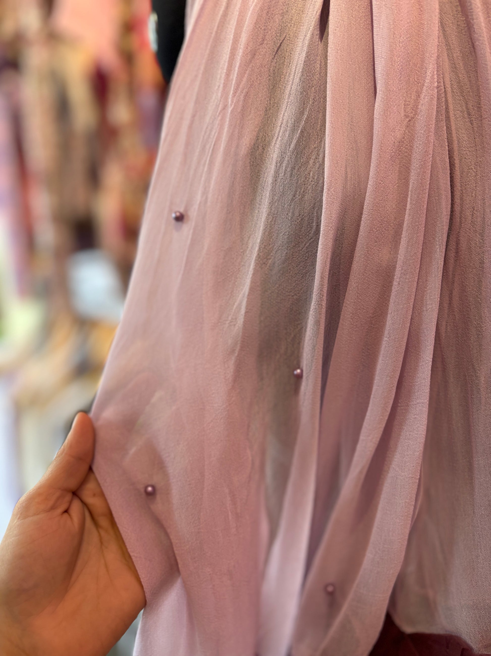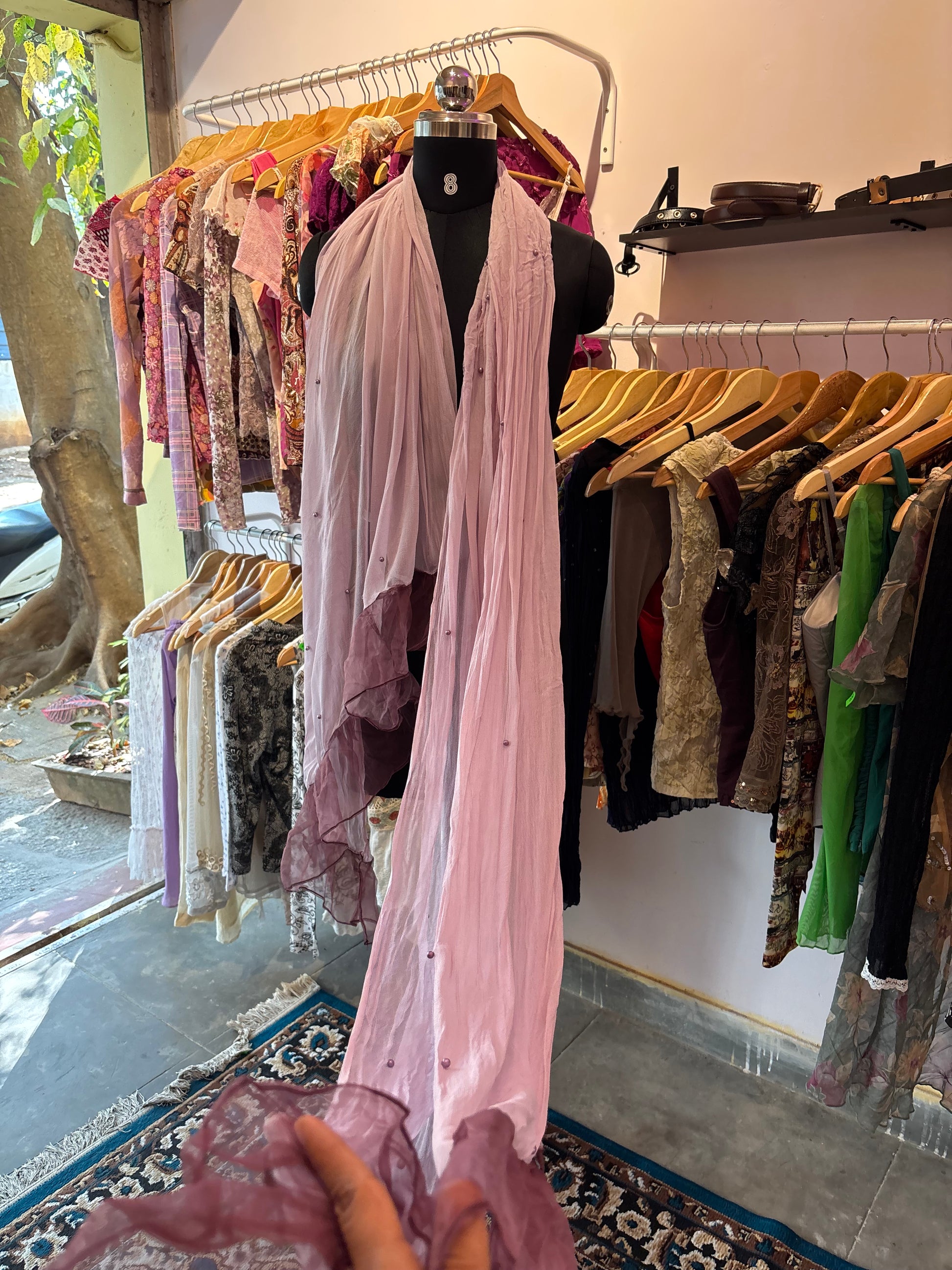 Purple scarf with pearl details and organza frill at the end