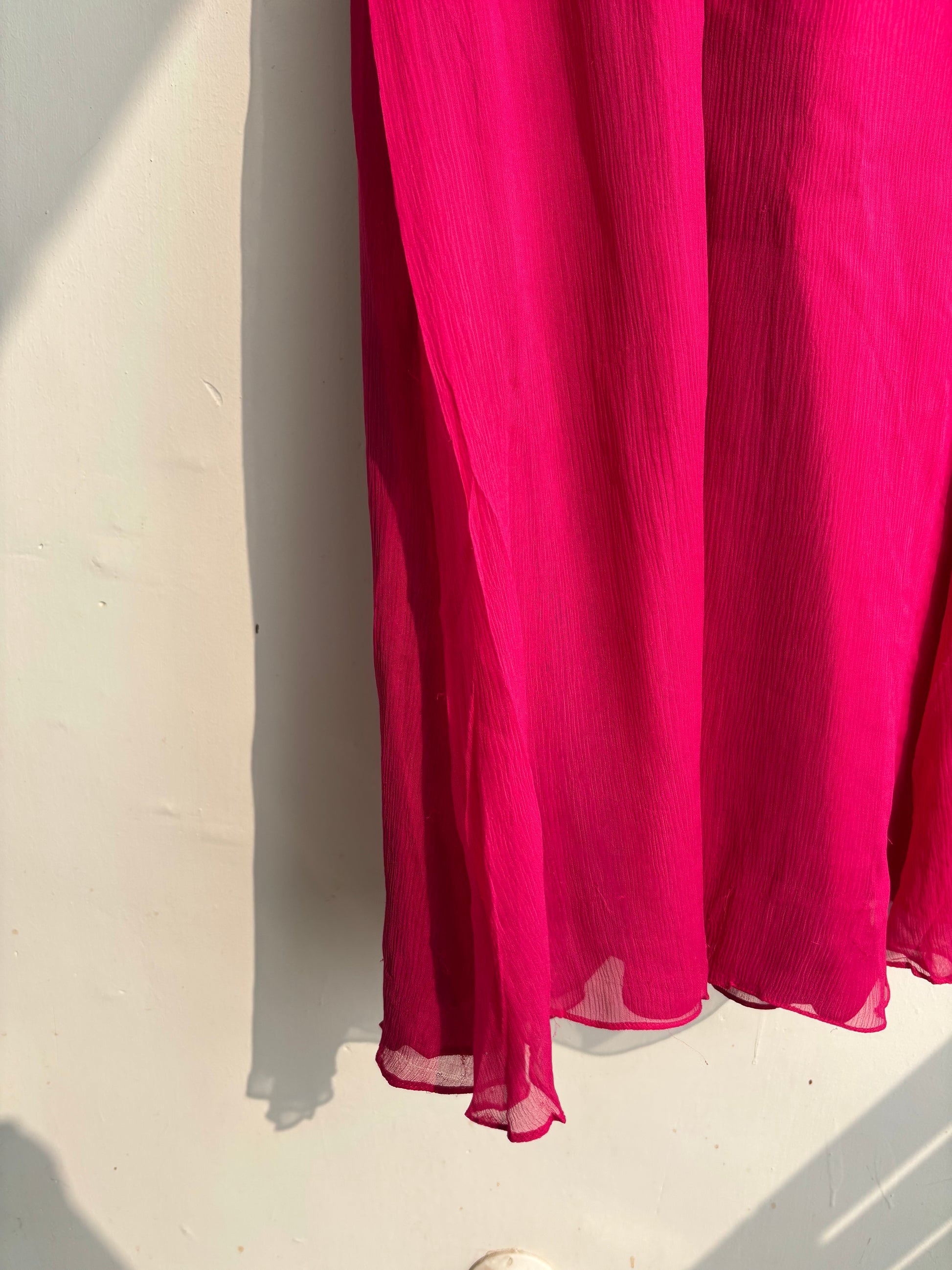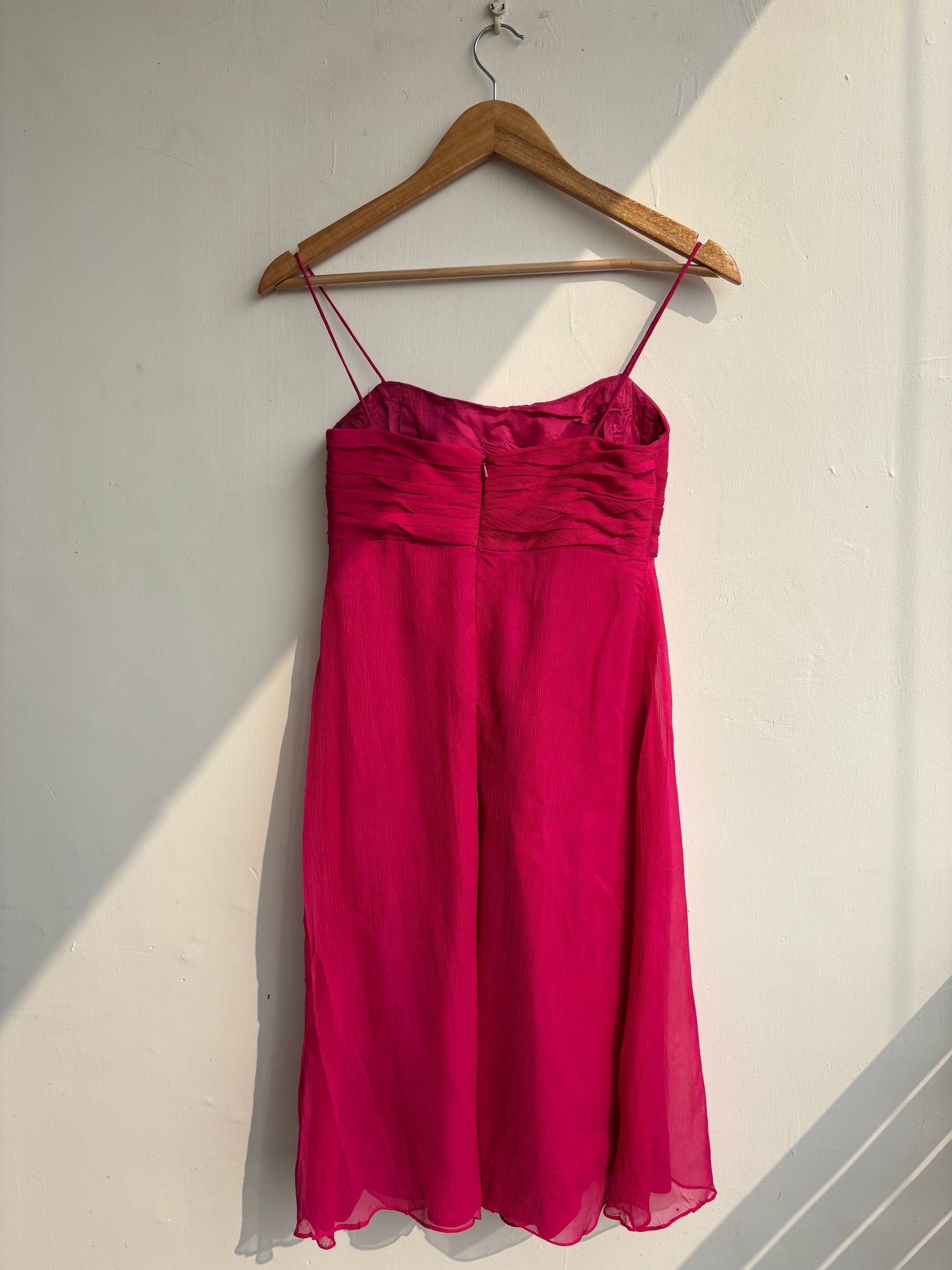 Bust 30 inches. Length 40 inches. 100 percent Silk. Lined. Side zip.