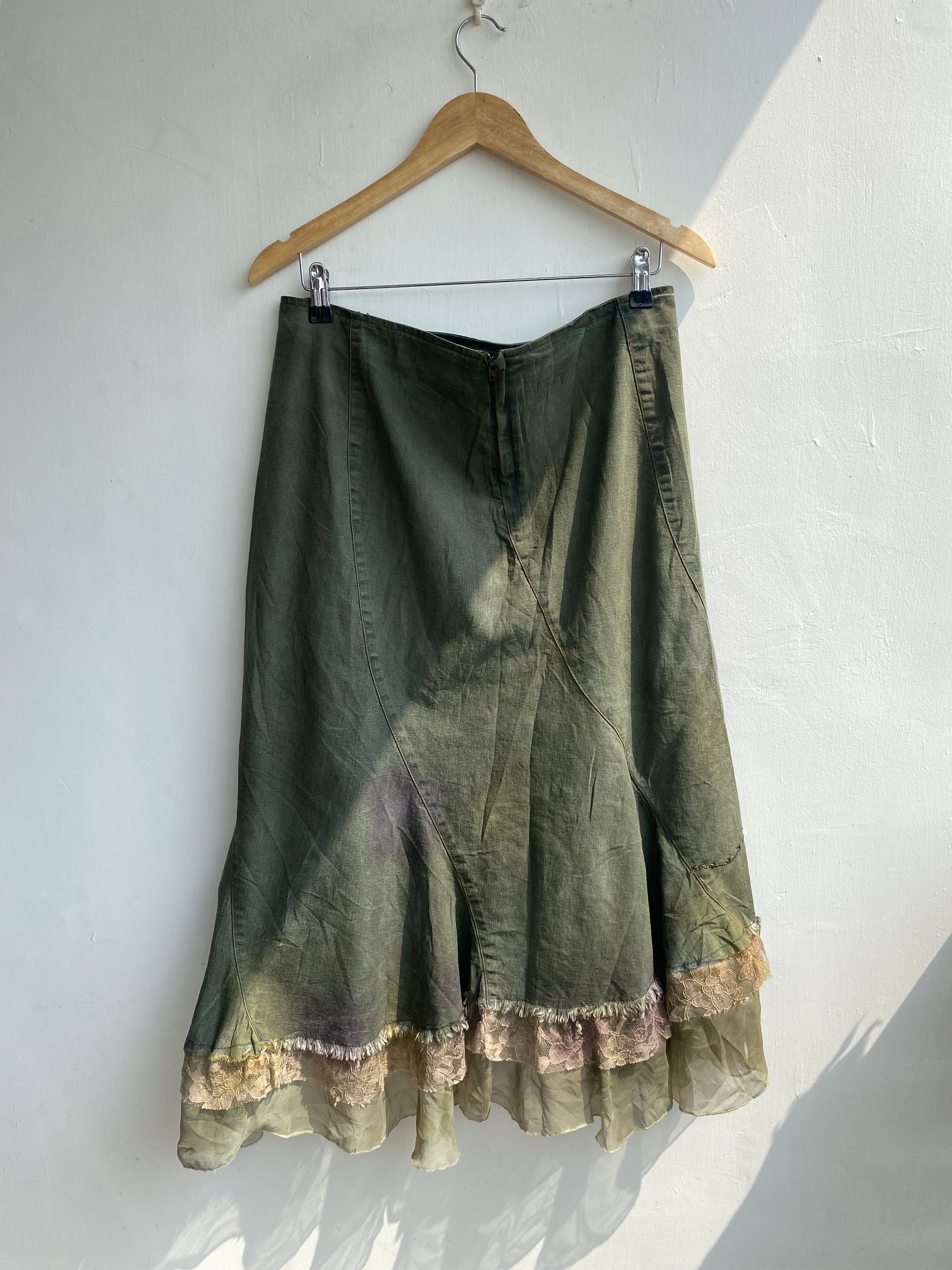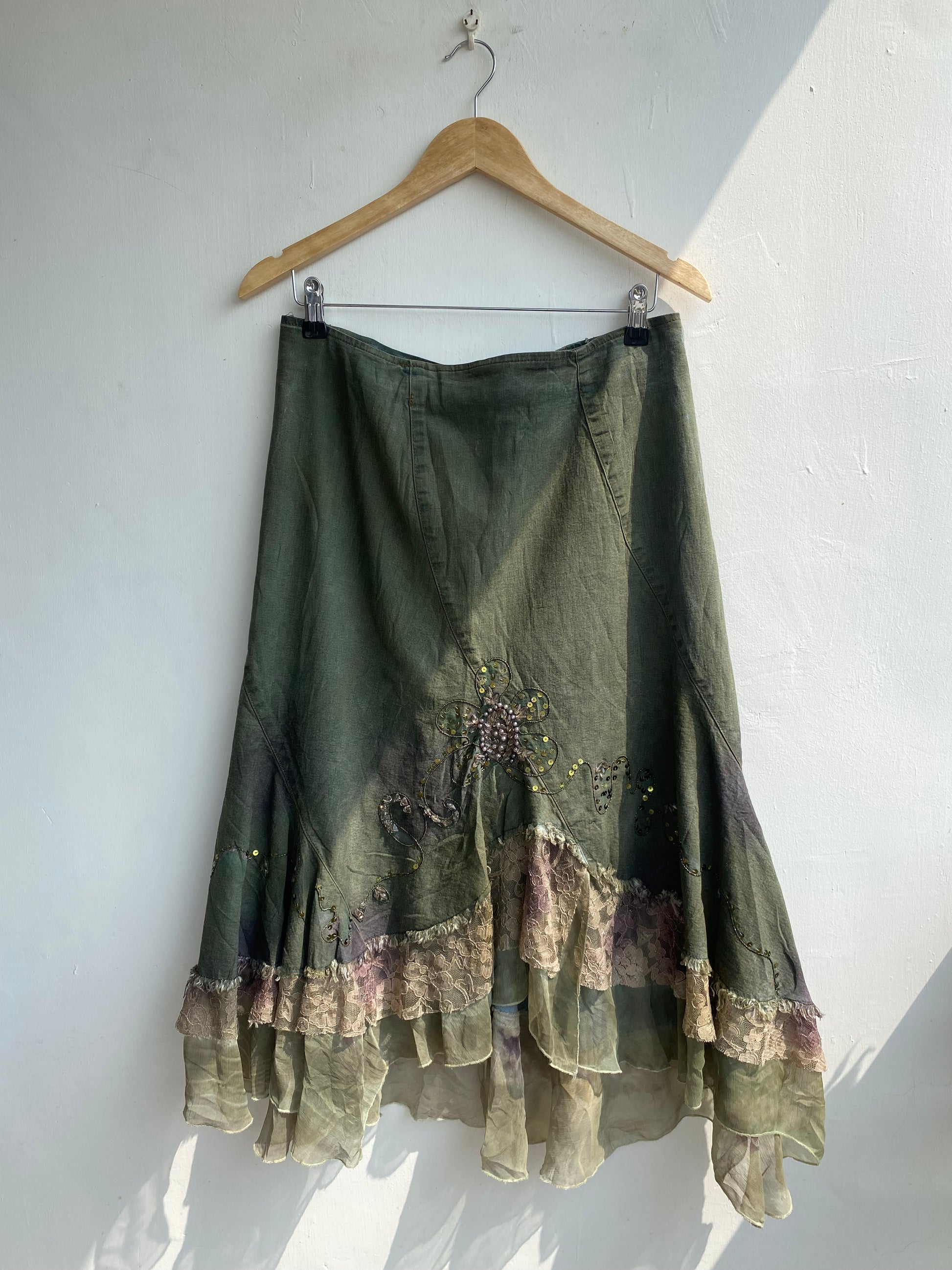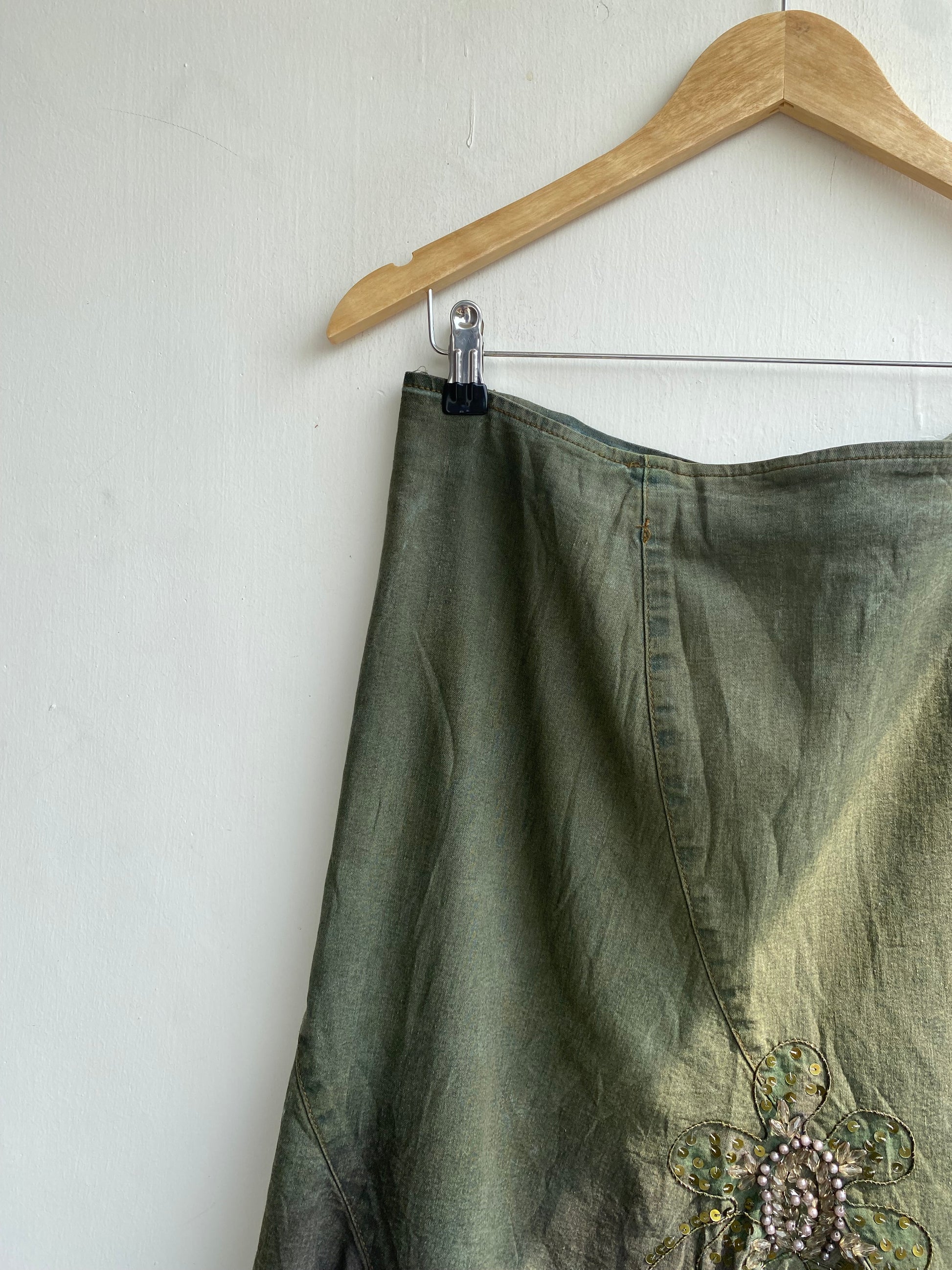 Waist 34/35 inches. Length 32 inches. Denim. Bead and lacy work. Back zip.