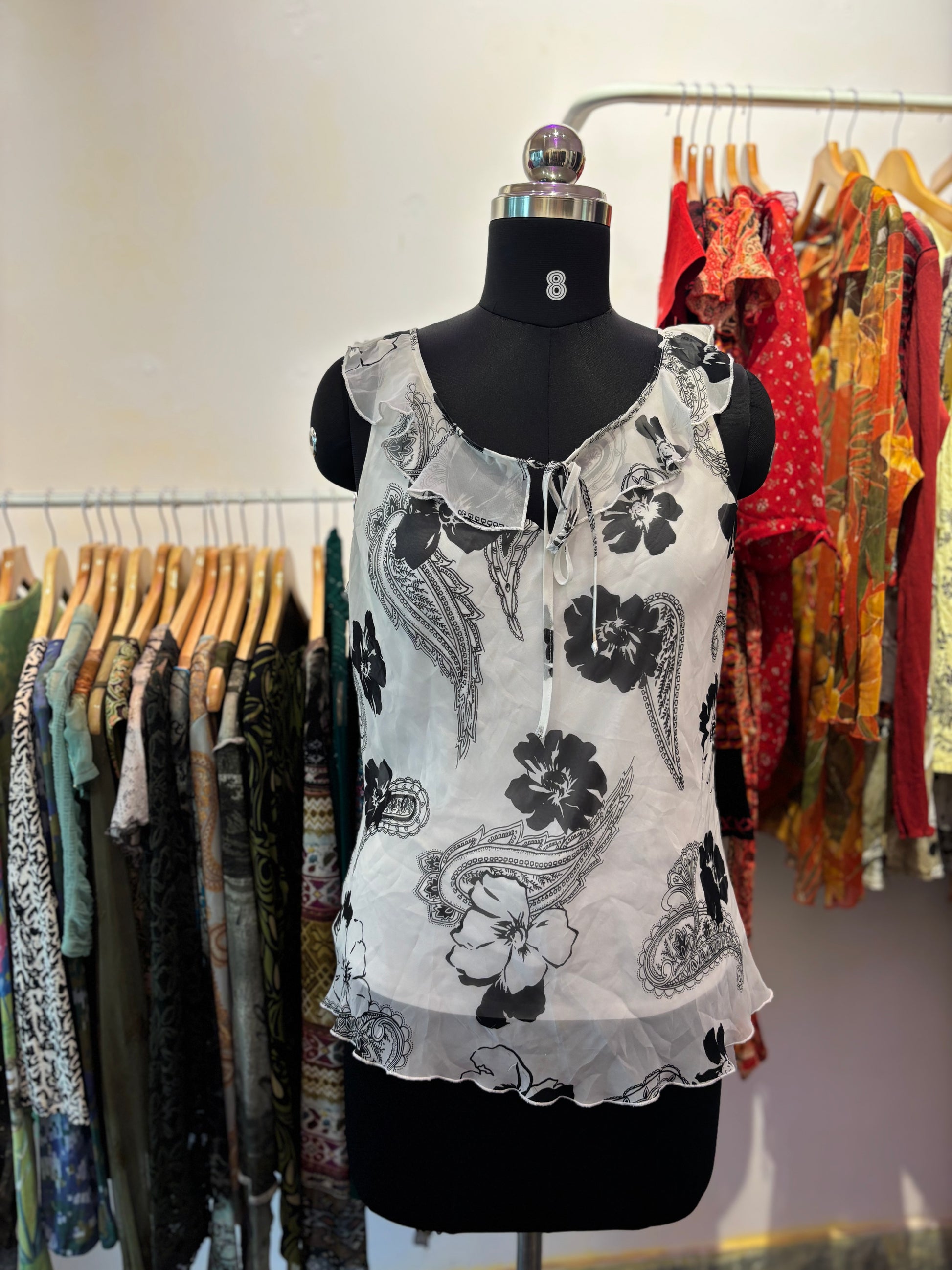 Bust 40 ( expands upto 48) inches. Length 25 inches. Chiffon. Lined