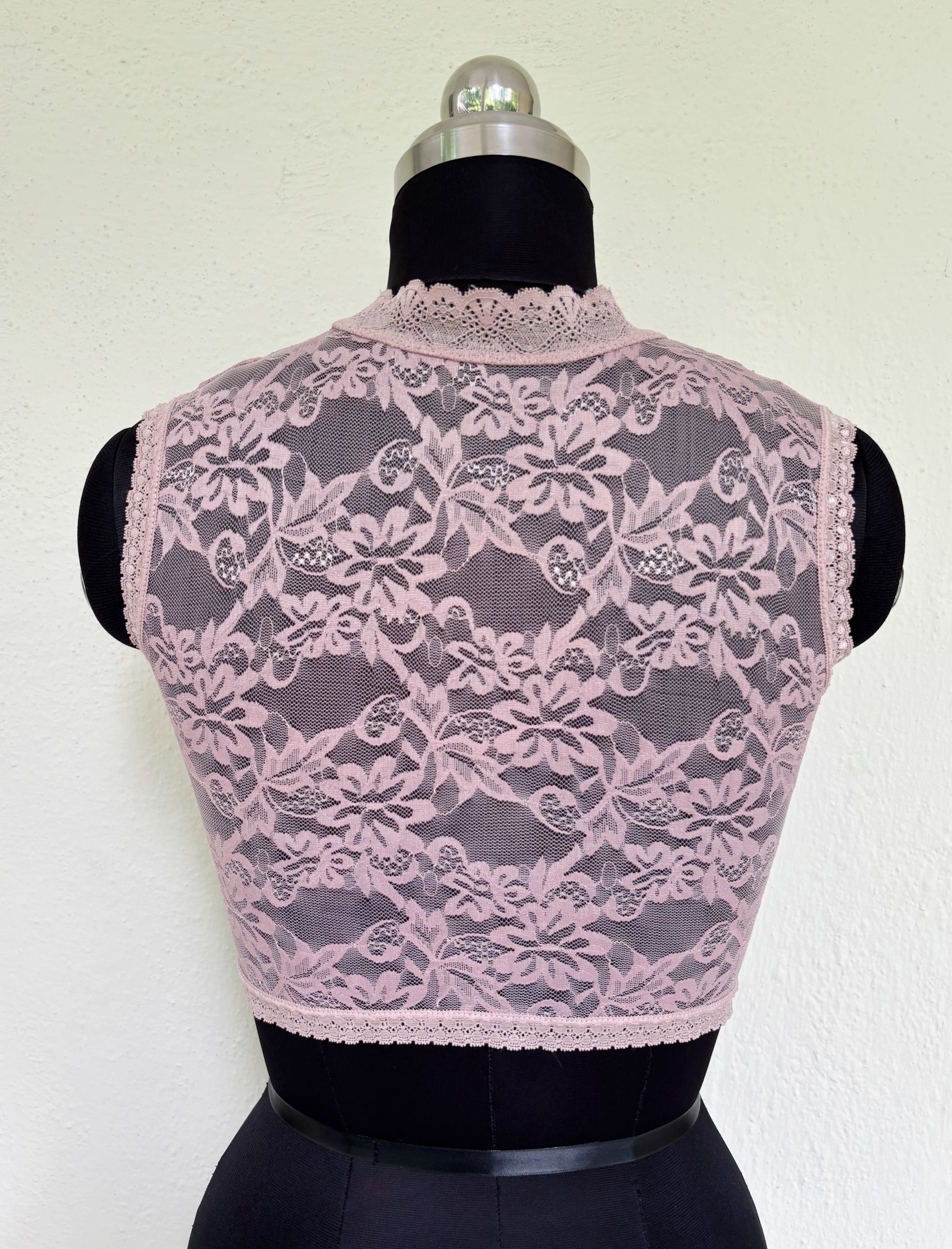 Bust 32 ( stretches upto 38) inches. Length 14 inches. Lacy