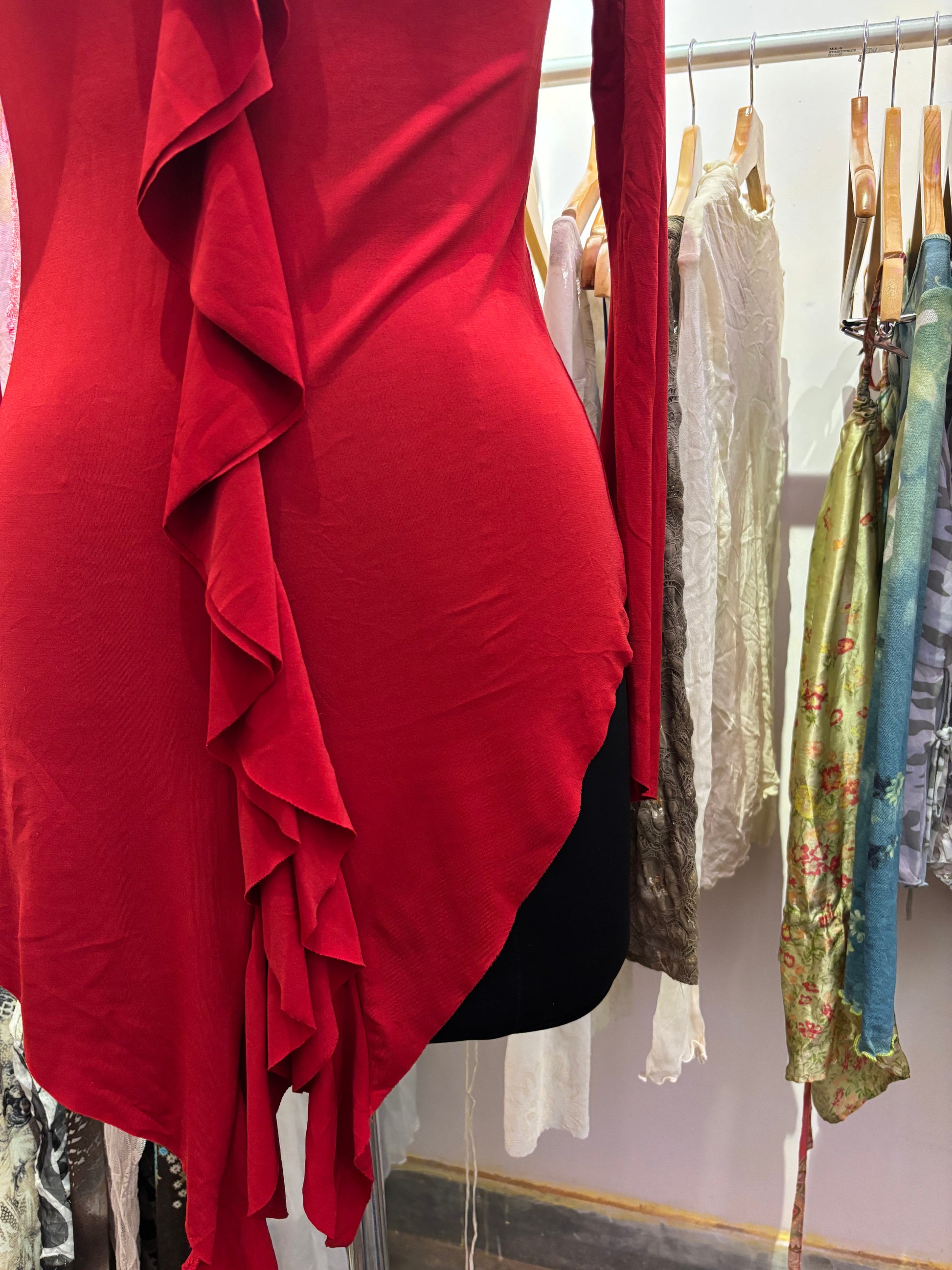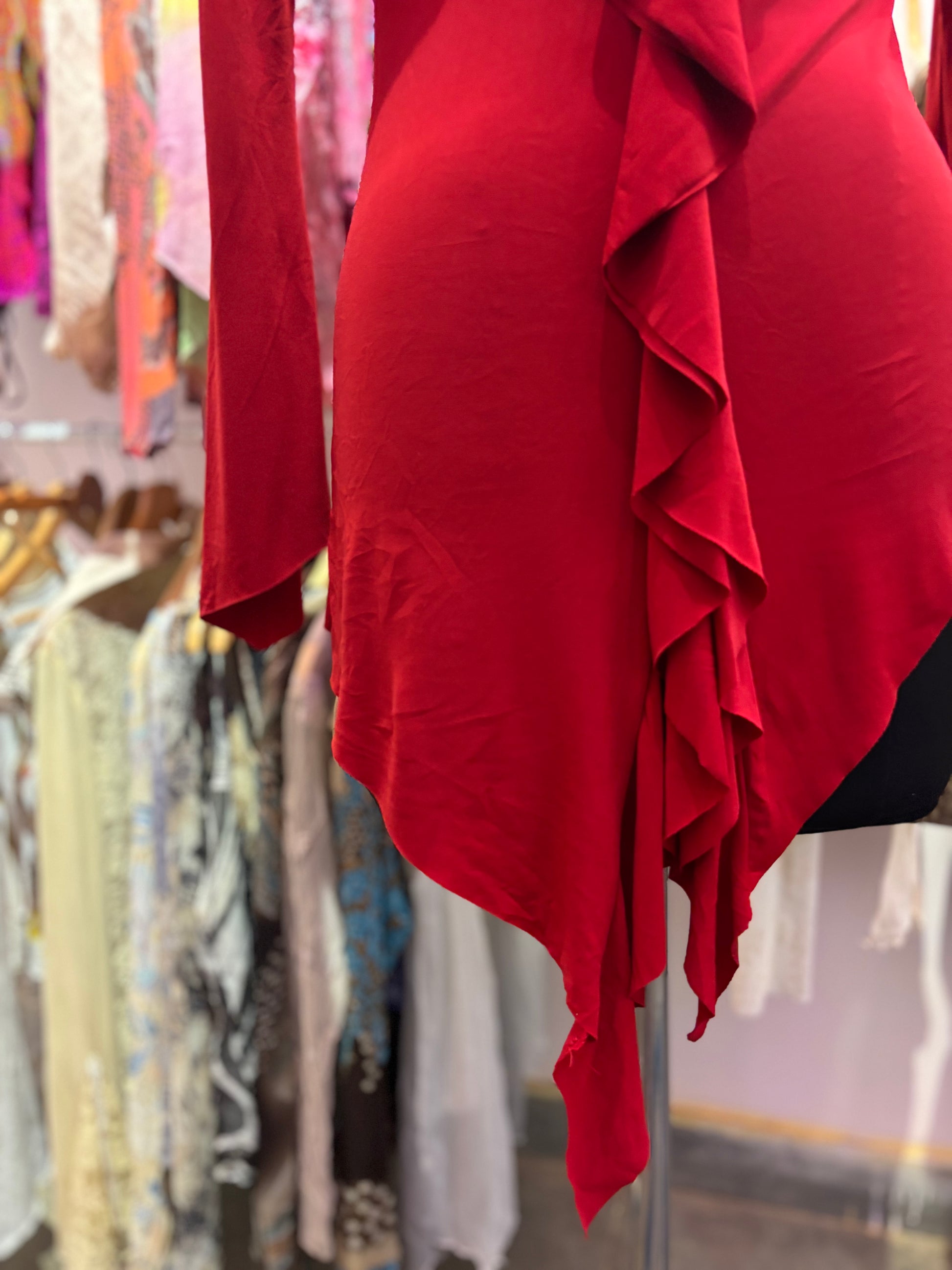 Bust 34 ( stretches upto 46) inches. Length 30inches ( till the tip of the ruffle). Knit. Can be worn as short dress