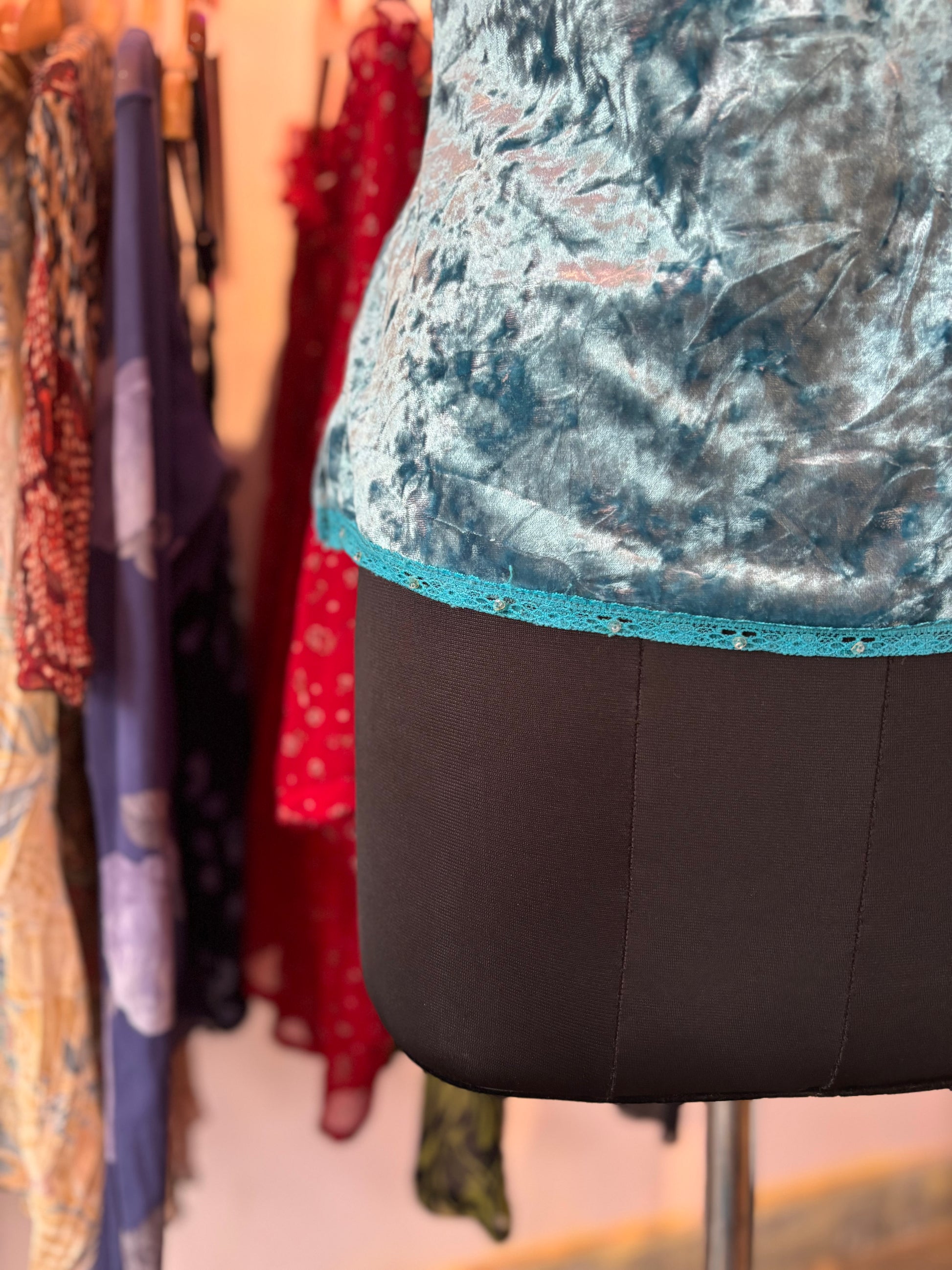 Bust ( stretches upto) inches. Length inches. Velvet. Adjustable straps