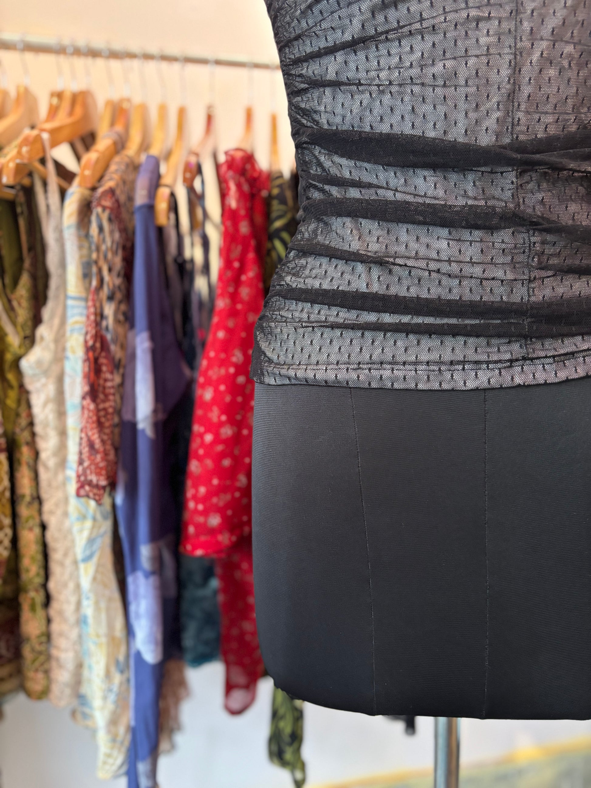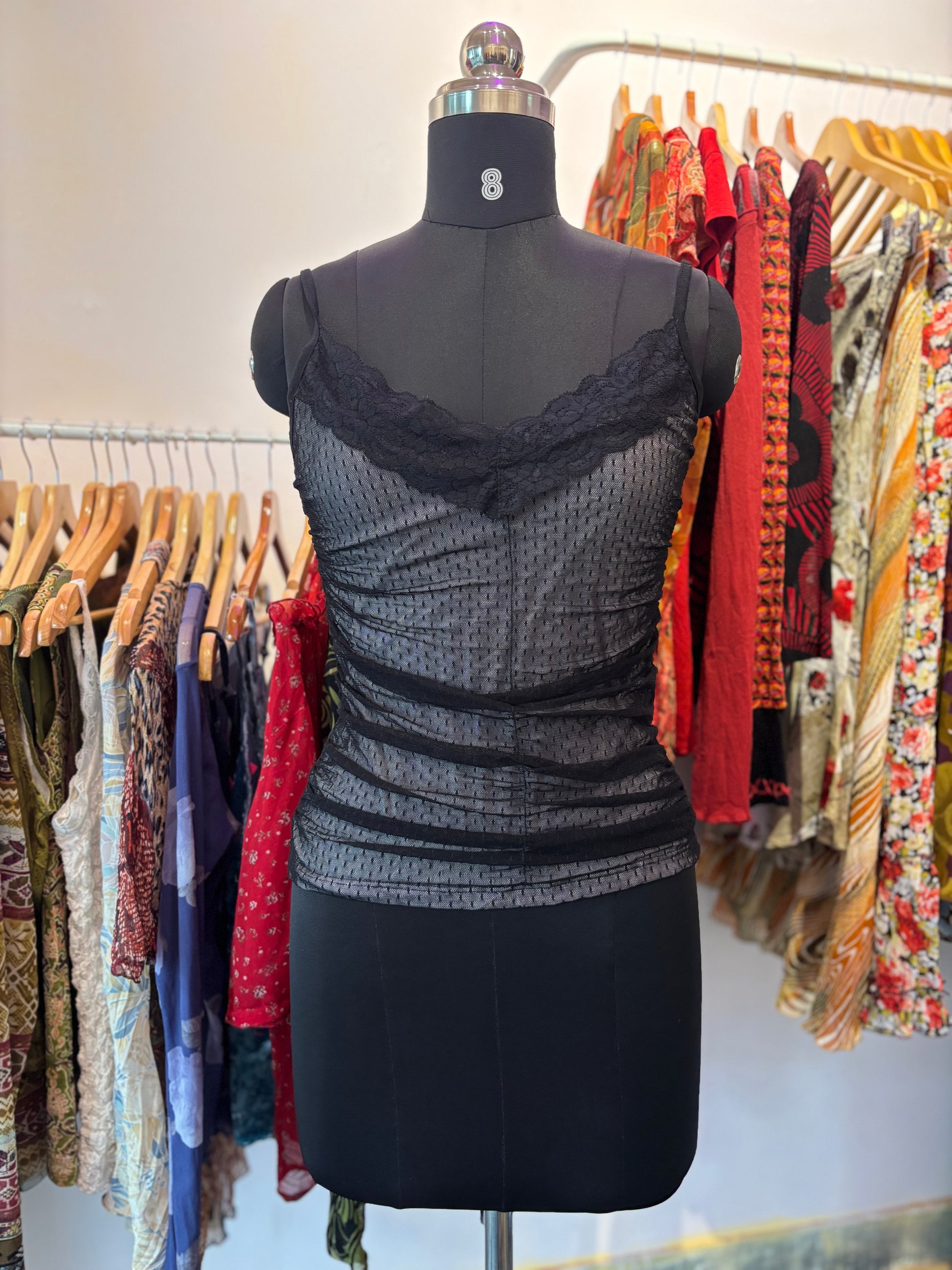 Bust 30 ( stretches upto 38) inches. Length 22 inches. Lacy. Lined