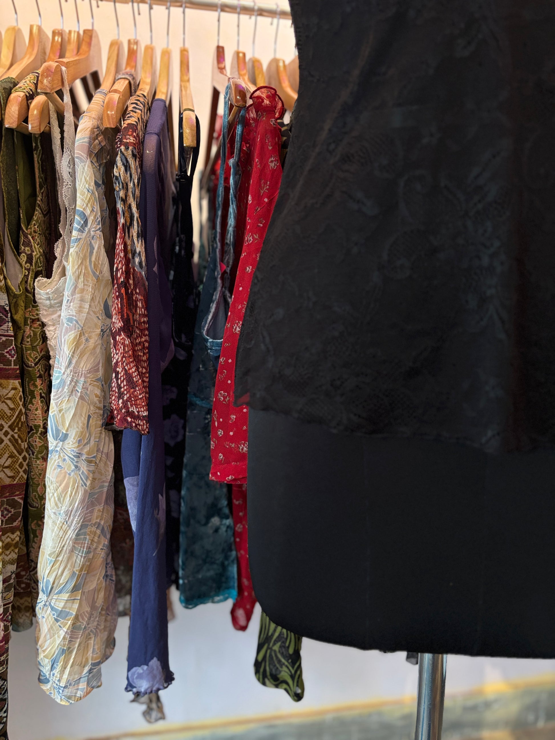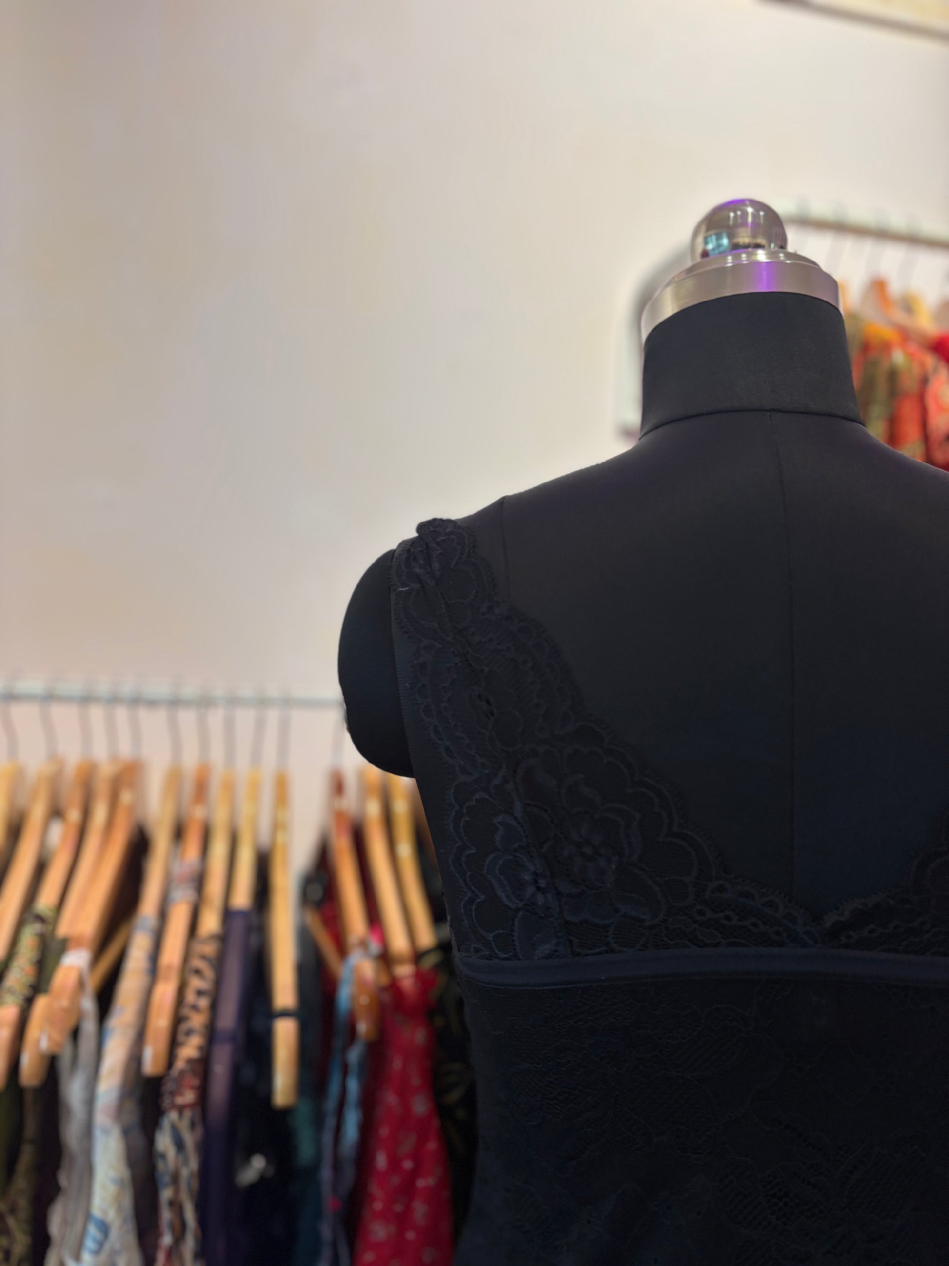Bust 32 ( stretches upto 36) inches. Length 23 inches. Lacy. Bust padded