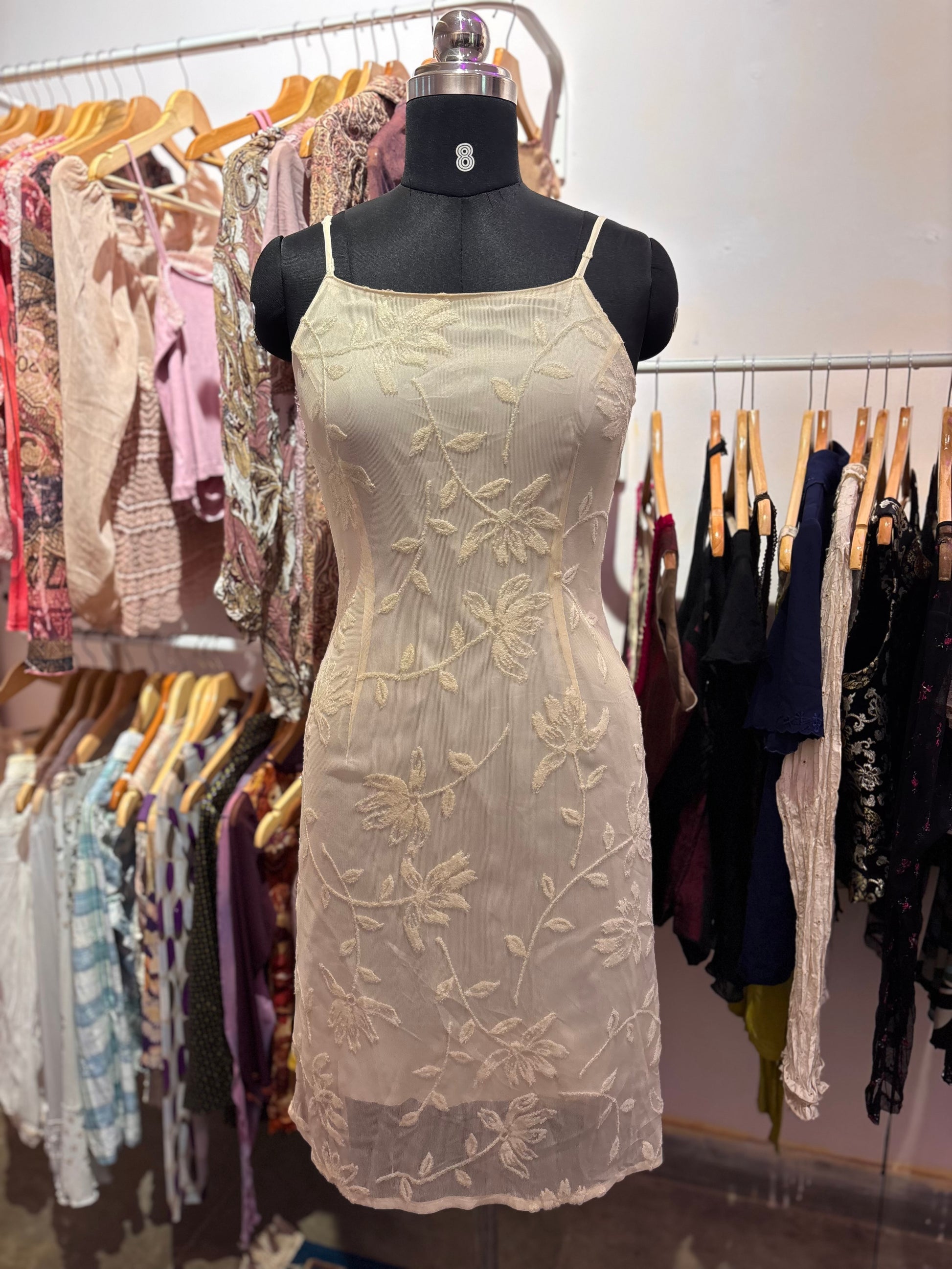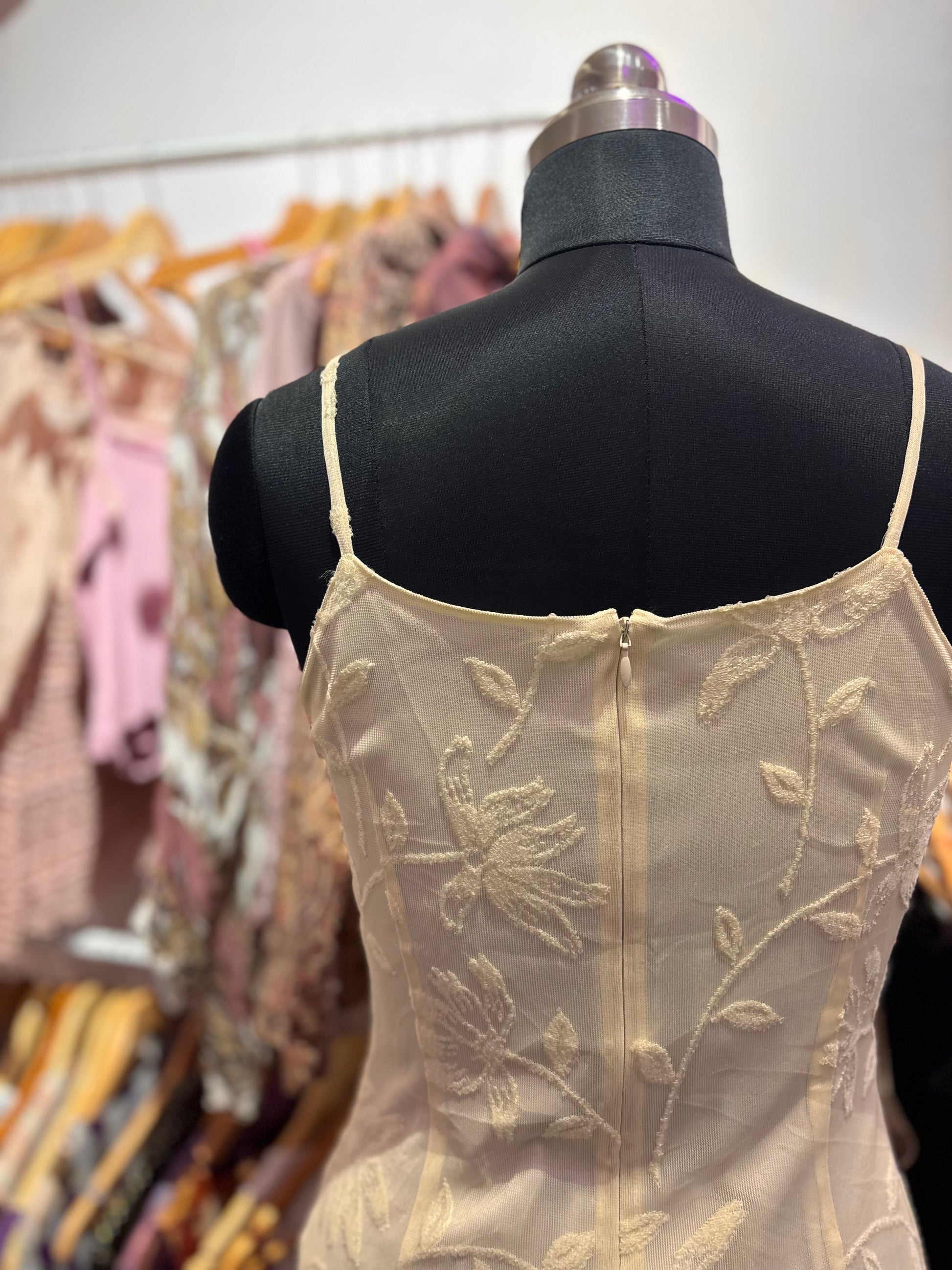 Bust 32/34 inches. Length 37 inches. Net. Embroidered. Lined. Back zip