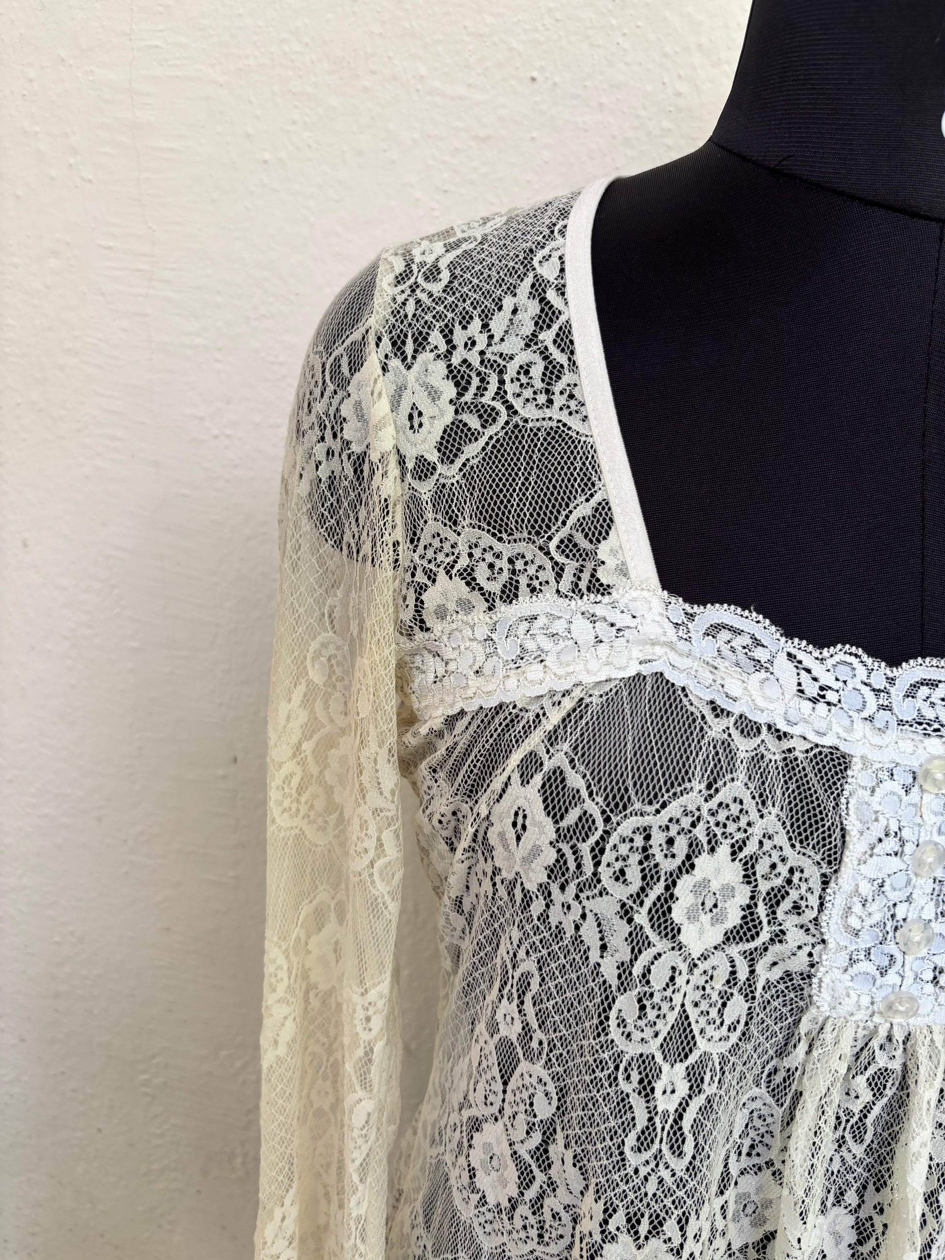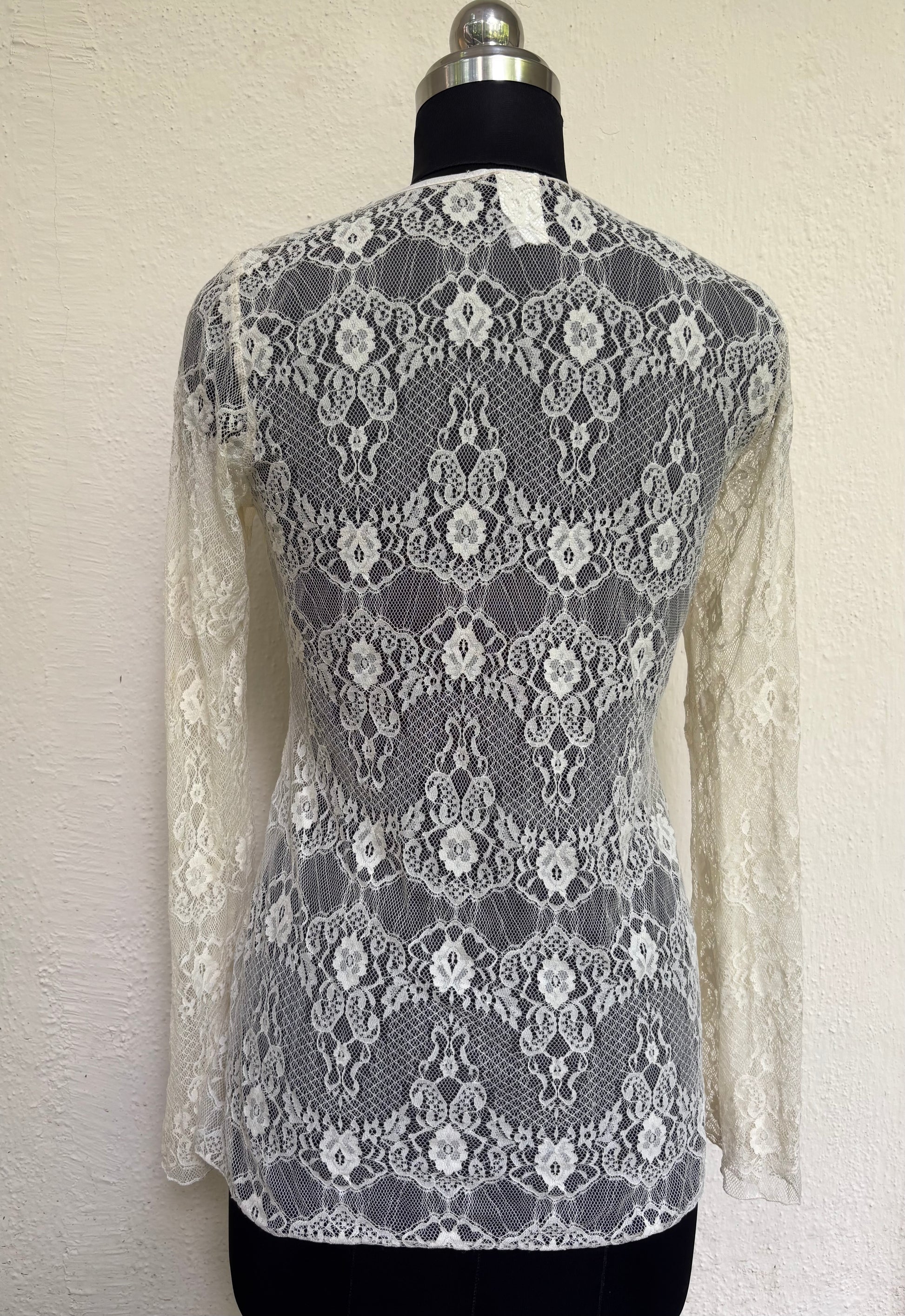 Bust 36 ( stretches upto 44) inches. Length 27 inches. Lacy. Sheer