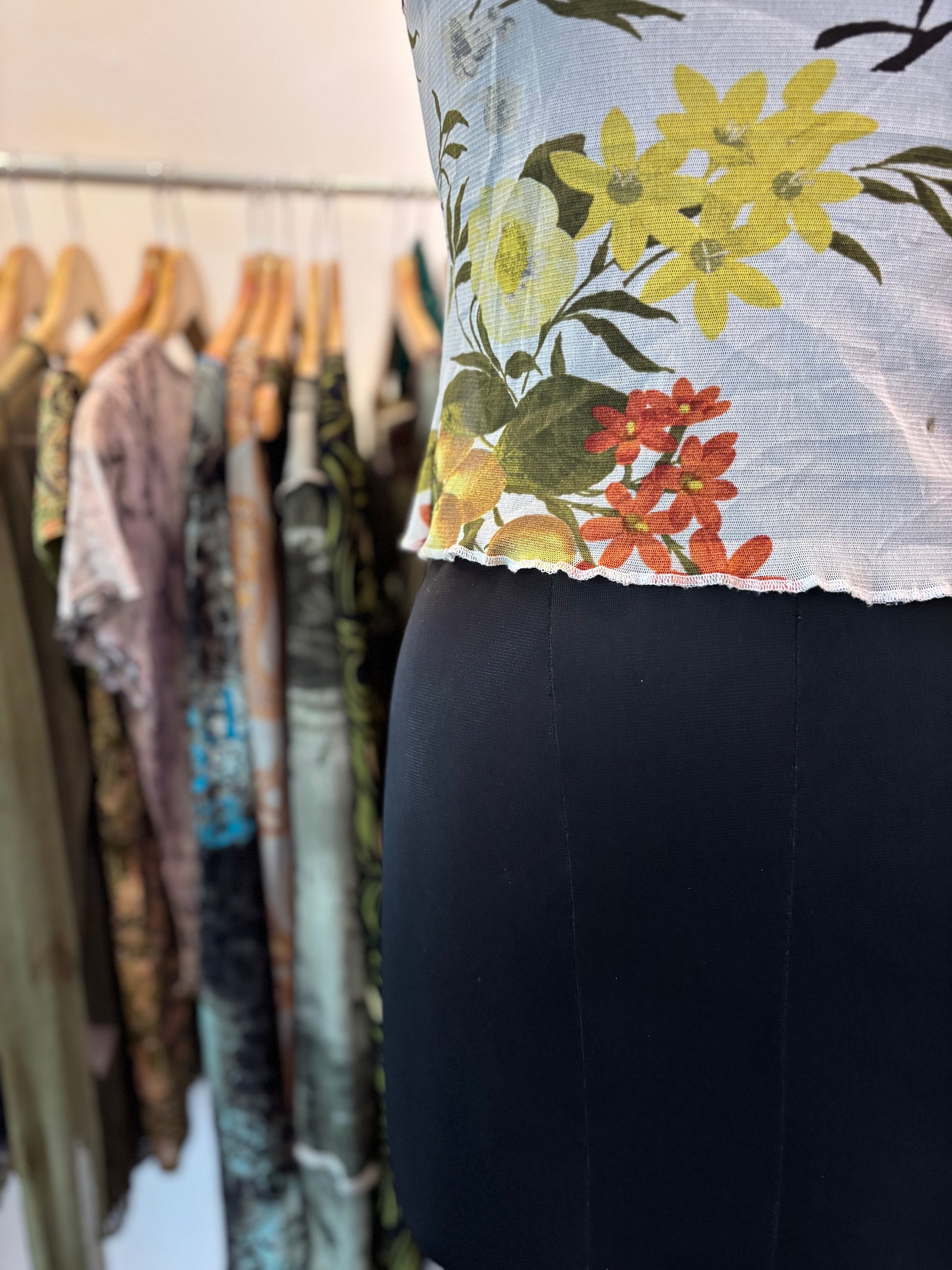 Bust 32 ( stretches upto 42) inches. Length 18 inches. Mesh.
