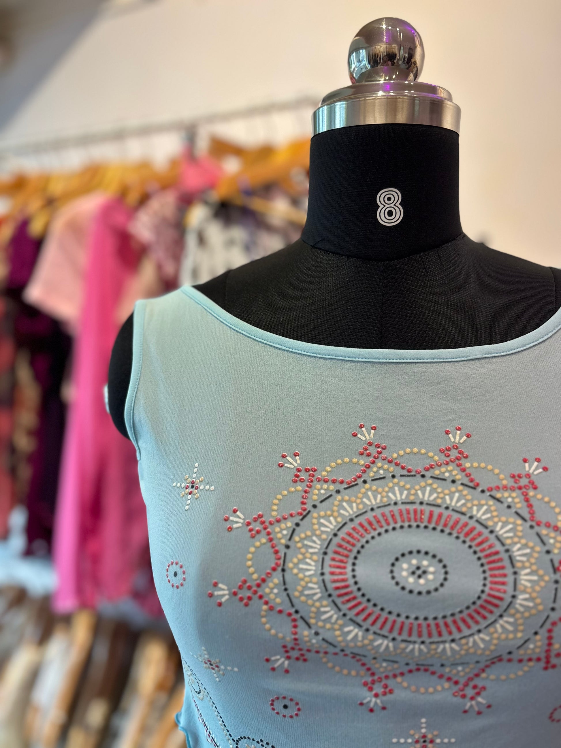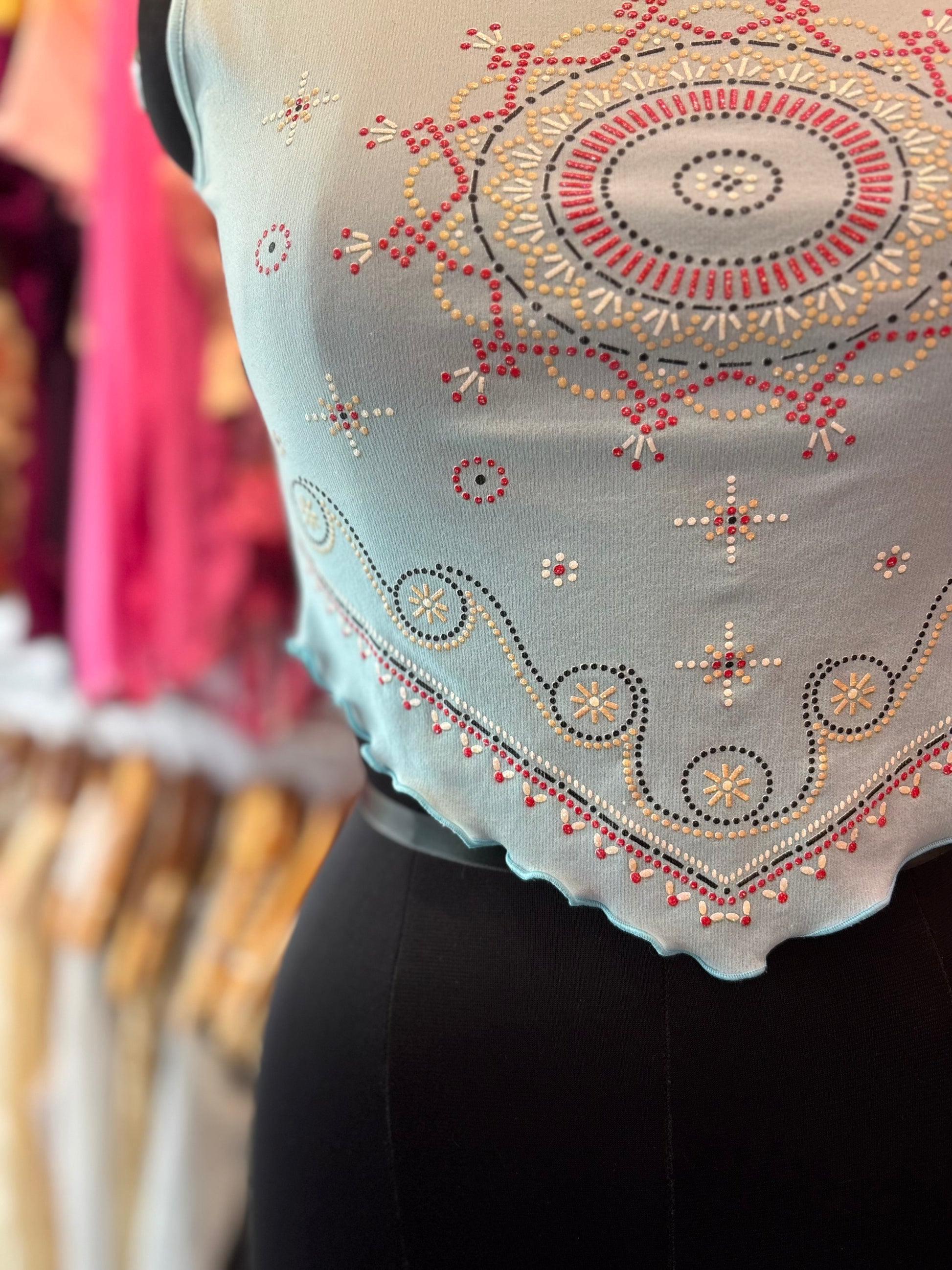 Bust 30 ( stretches upto 40) inches. Length 17.5 inches. Mesh. Embossed.